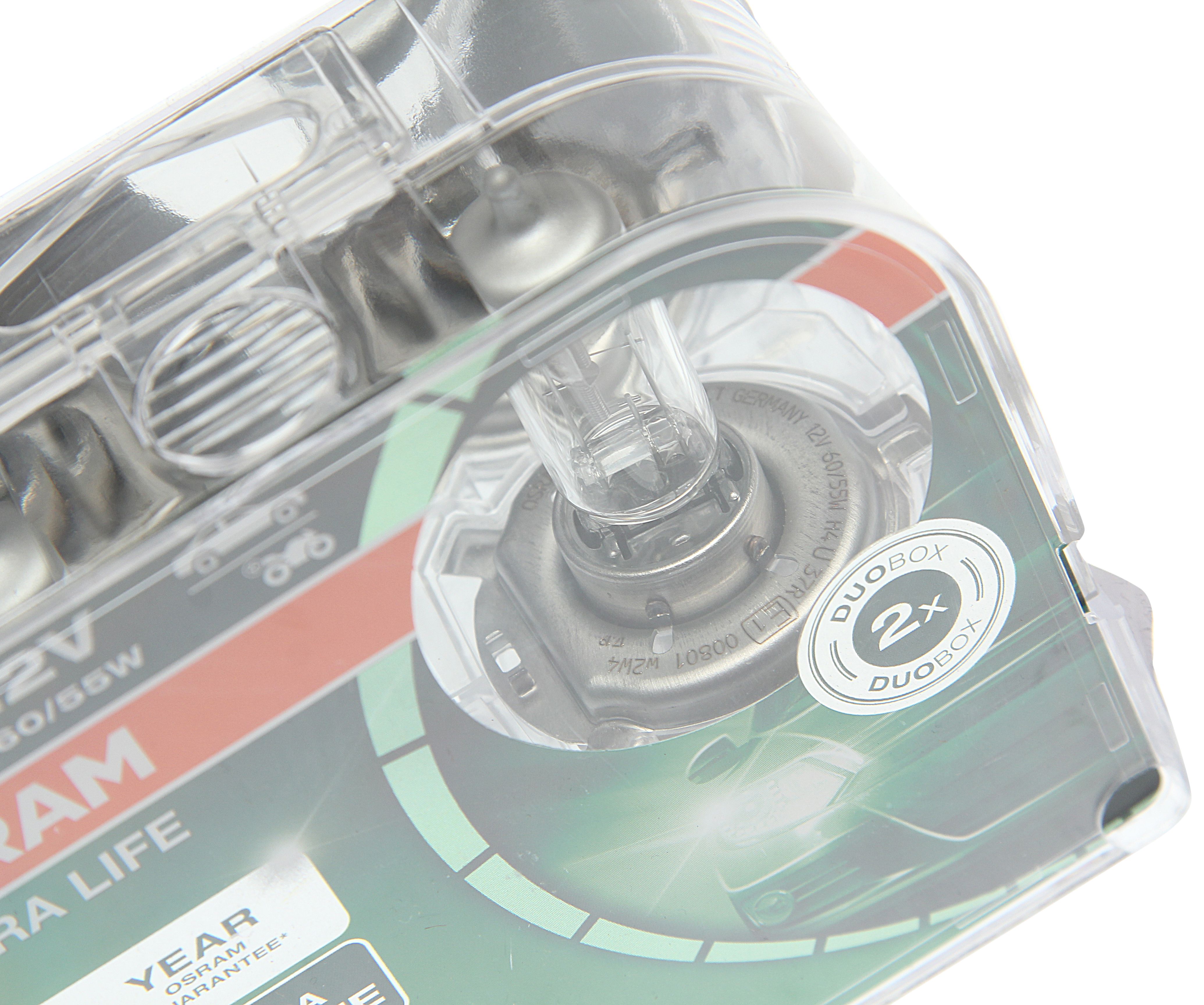Автомобильные лампы головного света OSRAM ULTRA LIFE не знают себе равных, когда речь заходит о долговечности. Они впечатляют своим сроком службы: по сравнению по стандартными галогенными лампами они служат до четырех раз дольше, что эквивалентно 100 000 км пробега (при среднем годовом пробеге 14 259 км и использовании ламп 60% времени). OSRAM смело предлагает на лампы ULTRA LIFE гарантию сроком 4 года (четвертый год гарантии предоставляется только при условии онлайн-регистрации продукта на странице www.osram.com/am-guarantee).