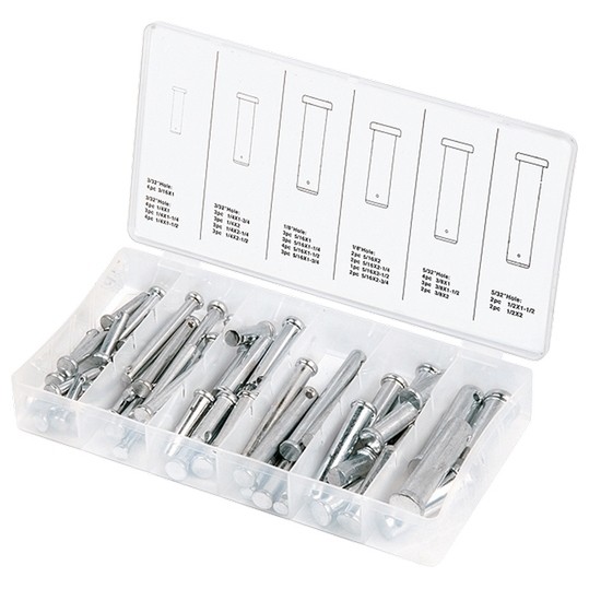 Набор Сибртех 47612 включает 60 штифтов с головкой и отверстием под шплинт, предназначенных для неподвижного соединения деталей. В корпусе каждого штифта имеется отверстие, позволяющее использовать шплинт для надежной фиксации крепежа. Преимущества Высокий показатель прочности — все элементы набора выполнены из стали. Универсальность — в набор входят крепежные элементы самых распространенных размеров. Коррозионная стойкость — штифты оцинкованы для защиты от разрушения. Быстрый поиск нужного крепежа — штифты помещены в индивидуальные отсеки с маркировкой размеров. Удобное хранение — набор поставляется в пластиковом кейсе.