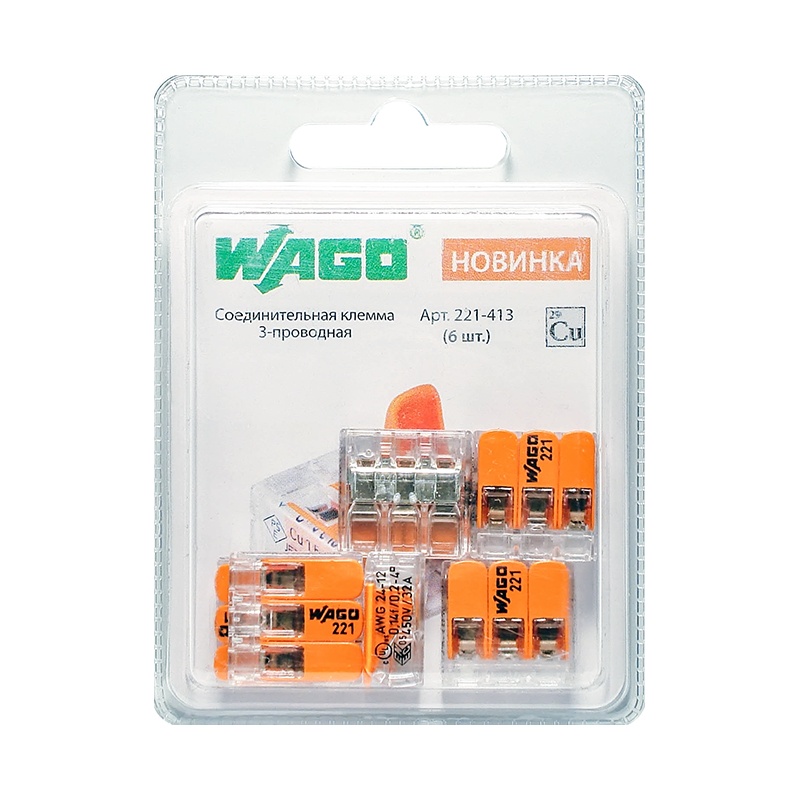 предназначены для присоединения и ответвления одножильных и многожильных медных проводов в электрических цепях переменного тока с частотой 50 Гц напряжением до 450 В и токе до 32А. Клеммы предназначены для подключения медных проводников. Применяются в различных распределительных электрических коробках. Важной отличительной особенностью клемм WAGO серии 221 являются их относительно небольшие размеры. Они почти в 1,7 раза меньше, чем аналоги. Такие размеры дают возможность применять ответвительные коробки меньшего размера или разместить в коробке намного больше соединений.