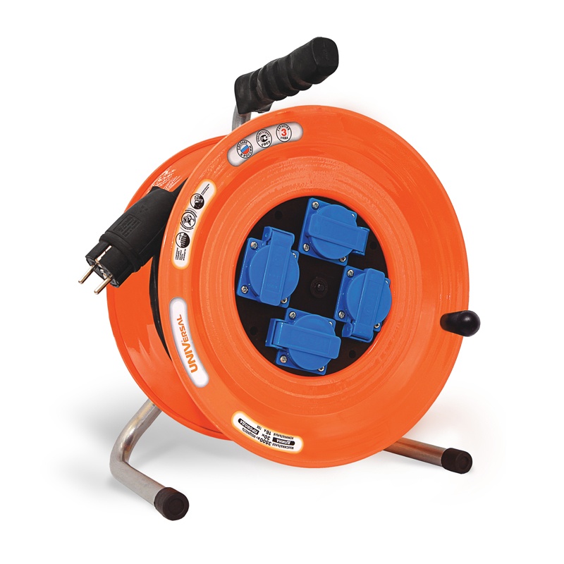 Используется для подключения сразу нескольких электроприборов с суммарной мощностью до 3500 Вт. Корпус удлинителя изготовлен из листовой стали толщиной 1 мм. Стойка удлинителя изготовлена из сварной трубы диаметром 19 мм и толщиной стенки 1,4 мм, а ее усиленная конструкция позволяет выдерживать вес корпуса с проводом и придает дополнительную устойчивость. Корпус и стойка имеют качественную порошковую окраску. Устойчив к механическим, ударным и прочим видам нагрузок. Использование провода марки КГ, имеющего резиновую изоляцию, и вилки с каучуковым корпусом делает возможной эксплуатацию при отрицательных температурах до - 40°С. Сечение жилы провода 2,5 мм2, что дает возможность эксплуатировать удлинитель с не полностью размотанным шнуром при нагрузке до 2150 Вт. Четыре гнезда розеток оснащены заземляющими контактами, защитными шторками, подпружиненными защитными крышками и термовыключателем.