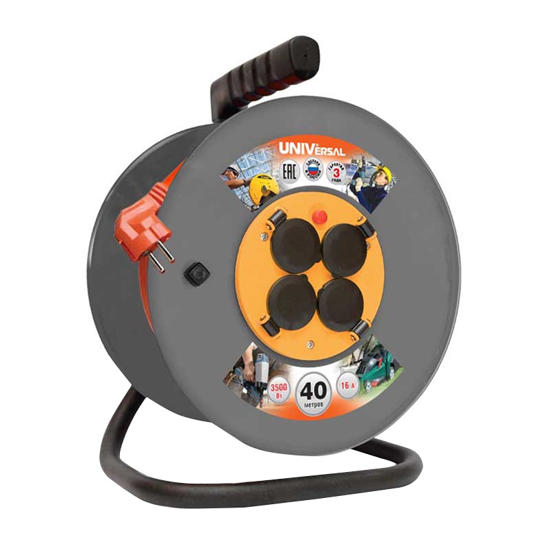предназначен для питания электроприборов и электроинструмента, которые в силу каких-либо причин не могут быть подключены к стационарно установленным розеткам и требуют большой мощности. Удлинитель имеет цельнолитой корпус из полипропилена типа «катушка» с диаметром щеки 240 мм, закрепленный на металлической стойке. Стойка изготовлена из сварной стальной трубы диаметром 18 мм и толщиной стенки 1 мм. Для удобства переноски удлинителя предусмотрена эргономичная ручка. Сетевой шнур изготовлен из провода ПВС оранжевого цвета и армирован неразборной литой вилкой в цвет провода. Удлинитель имеет 4 гнезда розеток, оснащенных защитными шторками, и автоматический термовыключатель, предохраняющий удлинитель от перегрузок. Силовые и заземляющие контакты изготовлены из латуни.
