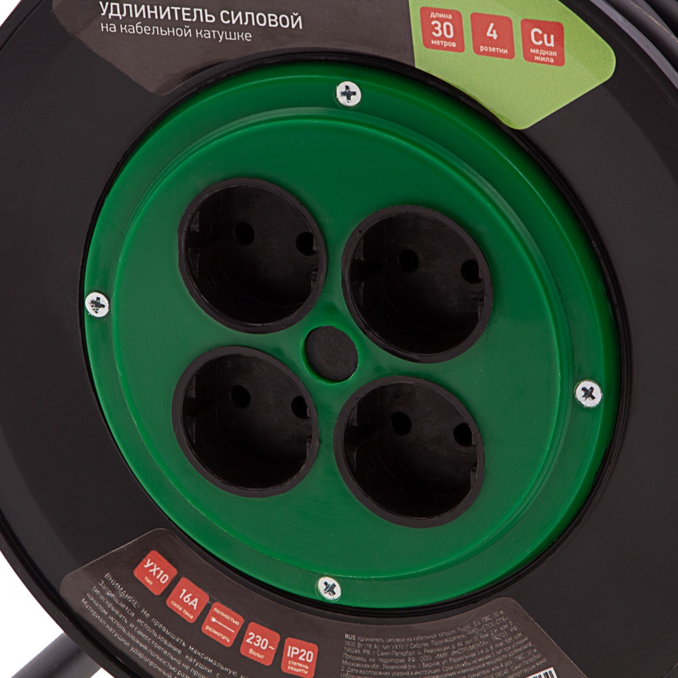 Силовой удлинитель Сибртех 95863 типа УХ10, 16 А, тип кабеля ПВС, на кабельной катушке, с 4 розетками, используется для подключения электроприборов на расстоянии до 30 м от стационарного источника электропитания. При этом суммарная мощность подключенных потребителей энергии не должна превышать 3500 Вт. Металлическая стойка сетевого удлинителя полая внутри, что облегчает конструкцию. Удлинитель пригодится во время строительных работ на дачном участке.ПреимуществаКабель быстро сматывается и разматывается при помощи удобной ручки.Риск получения электротравмы снижен благодаря прорезиненной поверхности ручки.Можно быстро включать и выключать питание посредством выключателя на корпусе удлинителя.Корпус изделия рассчитан на длительную эксплуатацию, т.к. изготовлен из гибкого ударопрочного пластика.Кабель устойчив к механическим повреждениям, т.к. покрыт двойной ПВХ-оболочкой.Характеристики удлинителя соответствуют требованиям ТР ТС 004/2011, что подтверждено соответствующим сертификатом.