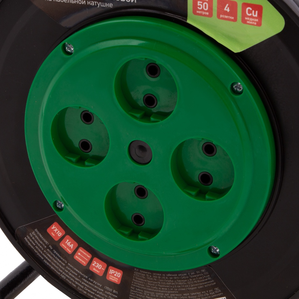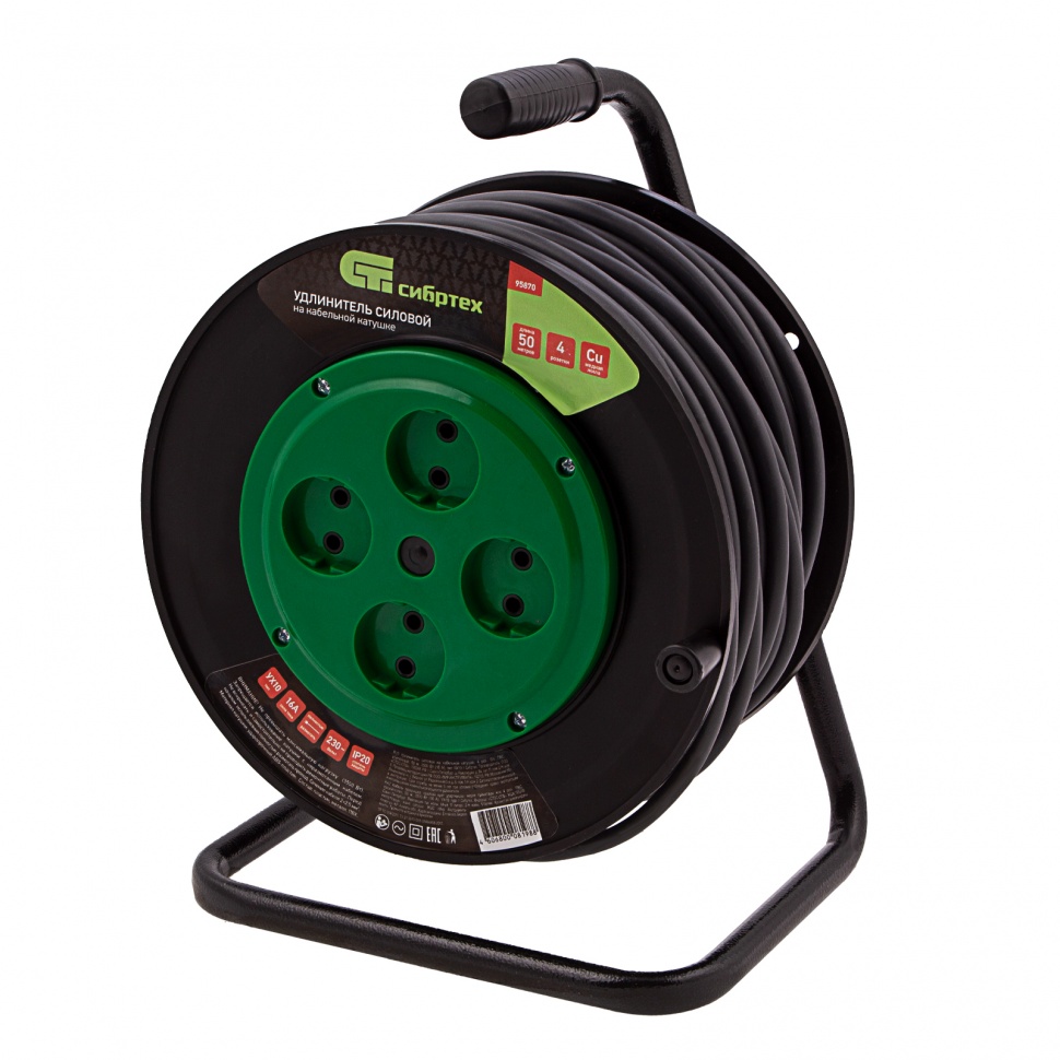 Усиленный силовой удлинитель на кабельной катушке Сибртех 95870, 16 А, тип УХ10, тип кабеля ПВС, с 4 розетками без заземления, позволяет подключать к сети электрооборудование на расстоянии до 50 м от стационарного источника питания. Медный кабель с сечением 2 х 2,5 кв. мм выдерживает нагрузку до 3500 Вт. Корпус выполнен из пластика, а металлическая стойка полая внутри, уменьшен вес сетевого удлинителя и его удобно переносить. Устройство предназначено для выполнения бытовых и профессиональных строительных работ, пригодится также на даче и в автомастерской.ПреимуществаСпециальная ручка упрощает разматывание и сматывание кабеля.Рукоятка прорезинена для защиты пользователя от поражения электрическим током.Прочный пластиковый корпус рассчитан на долгий срок службы.Двойная ПВХ-оболочка защищает кабель от механических повреждений.Сертификат соответствия ТР ТС 004/2011 подтверждает надежность удлинителя.