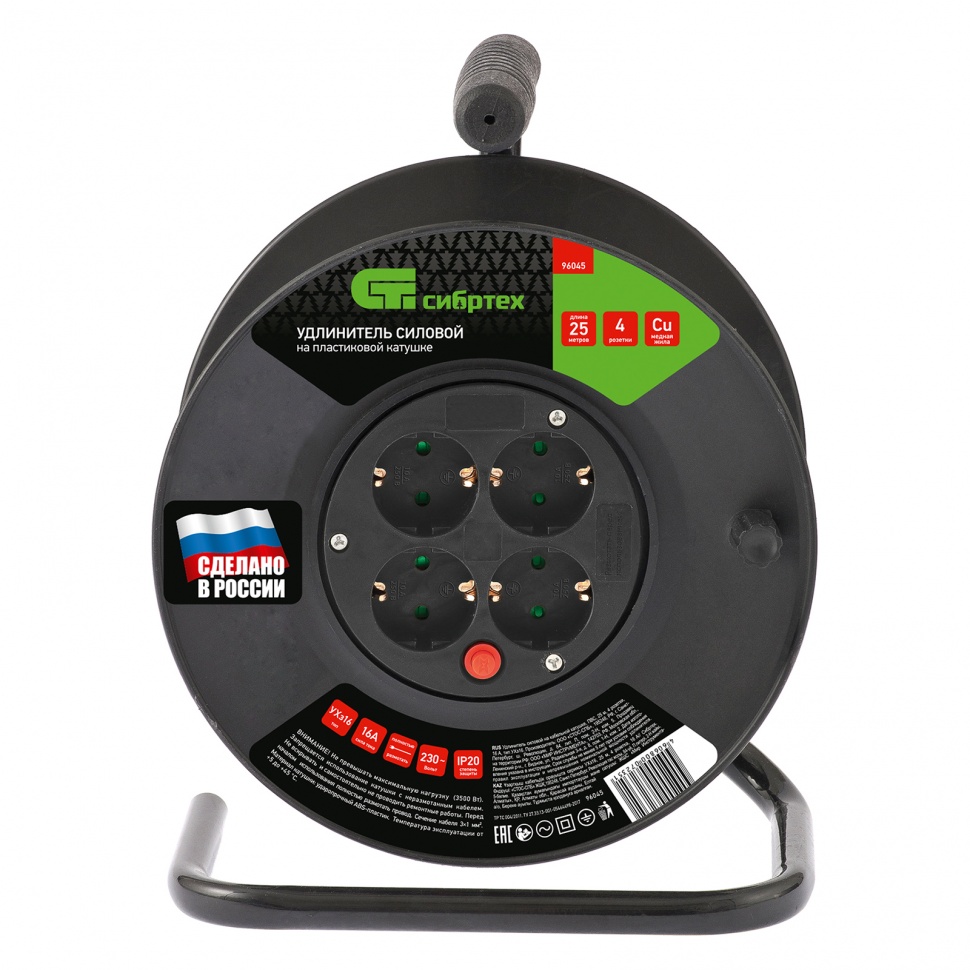 Силовой удлинитель Сибртех 96045 типа УХз16, 16 А, тип кабеля ПВС, на кабельной катушке, с 4 розетками, используется для подключения электроприборов на расстоянии до 25 м от стационарного источника электропитания. При этом суммарная мощность подключенных потребителей энергии не должна превышать 3500 Вт. У розеток имеются заземляющие контакты для защиты пользователя от поражения электрическим током. Металлическая стойка сетевого удлинителя полая внутри, что облегчает конструкцию — вес изделия составляет 2,6 кг, и его удобно переносить. Удлинитель пригодится во время строительных работ на дачном участке.ПреимуществаКабель быстро сматывается и разматывается при помощи удобной ручки.Риск получения электротравмы снижен благодаря прорезиненной поверхности ручки.Можно быстро включать и выключать питание посредством выключателя на корпусе удлинителя.Корпус изделия рассчитан на длительную эксплуатацию, т.к. изготовлен из гибкого ударопрочного пластика.Кабель устойчив к механическим повреждениям, т.к. покрыт двойной ПВХ-оболочкой.Характеристики удлинителя соответствуют требованиям ТР ТС 004/2011, что подтверждено соответствующим сертификатом.