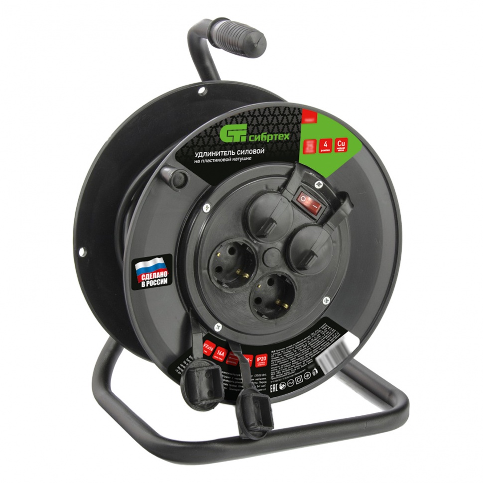 Силовой удлинитель на кабельной катушке Сибртех 96047 типа УХз16, 16 А, степень защиты IP44, имеет 4 розетки с крышкой для подключения различного электрооборудования суммарной мощностью 3500 Вт, используемого на расстоянии до 25 м от стационарного источника питания. Удобная ручка облегчает разматывание и сматывание кабеля. Заземляющие контакты розеток предотвращают поражение пользователя электрическим током. Розетки закрываются крышками, защищающими разъемы от попадания влаги и грязи. Сетевой удлинитель пригодится для работы с инструментом на строительной площадке или дачном участке.ПреимуществаПолая внутри металлическая стойка не утяжеляет конструкцию — вес удлинителя составляет 2,7 кг и его удобно переносить.Корпус выполнен из гибкого ударопрочного пластика, поэтому изделие прослужит долго.На корпусе имеется выключатель, что упрощает эксплуатацию удлинителя.Рукоятка обрезинена, что уменьшает риск получения электротравмы в случае повреждения кабеля.Кабель имеет двойную оболочку из ПВХ, обеспечивающую ему устойчивость к механическим повреждениям.Удлинитель имеет класс защиты IP44, поэтому его можно использовать в условиях высокой влажности.Характеристики удлинителя соответствуют требованиям ТР ТС 004/2011, что подтверждает его надежность.