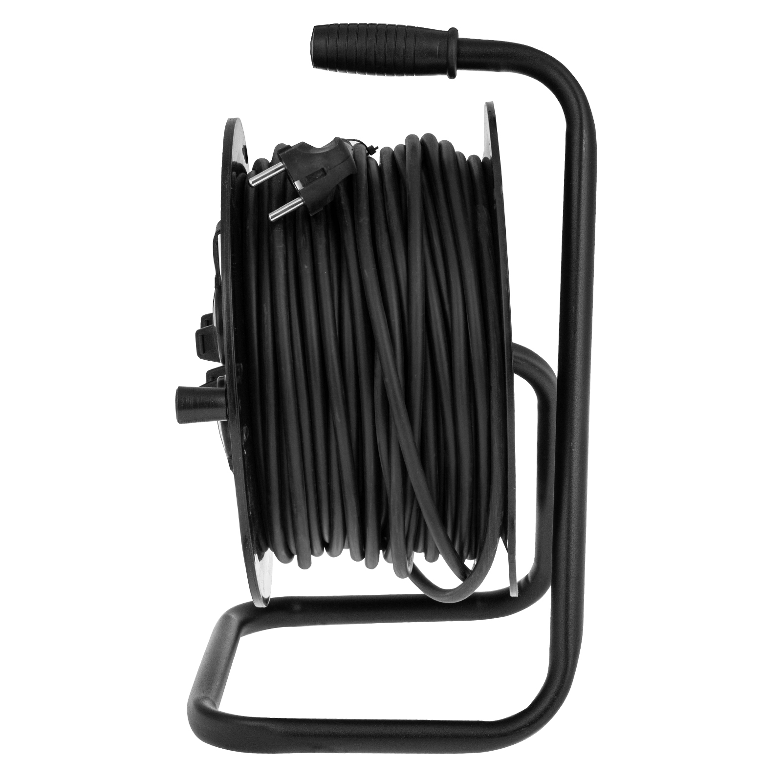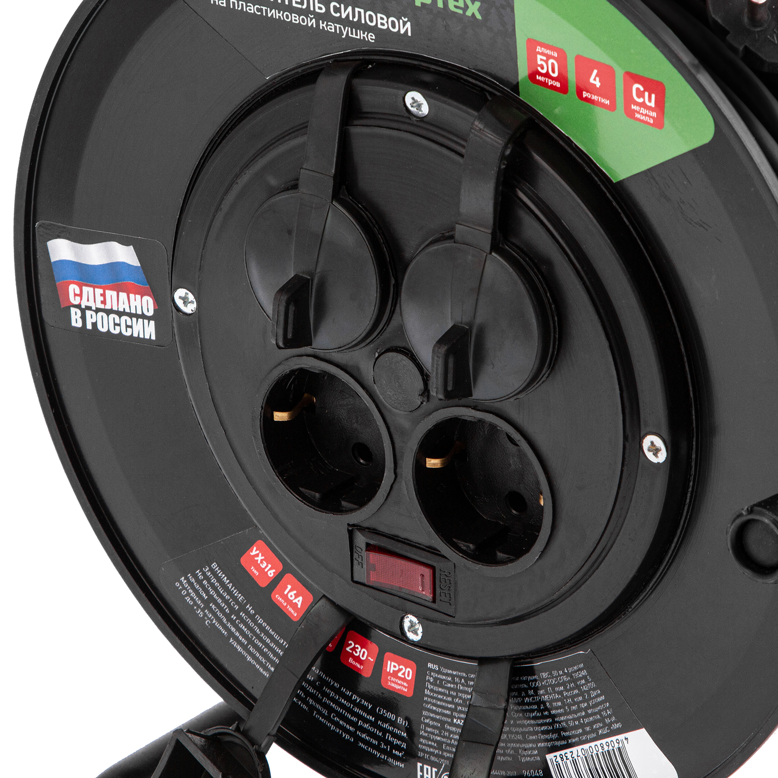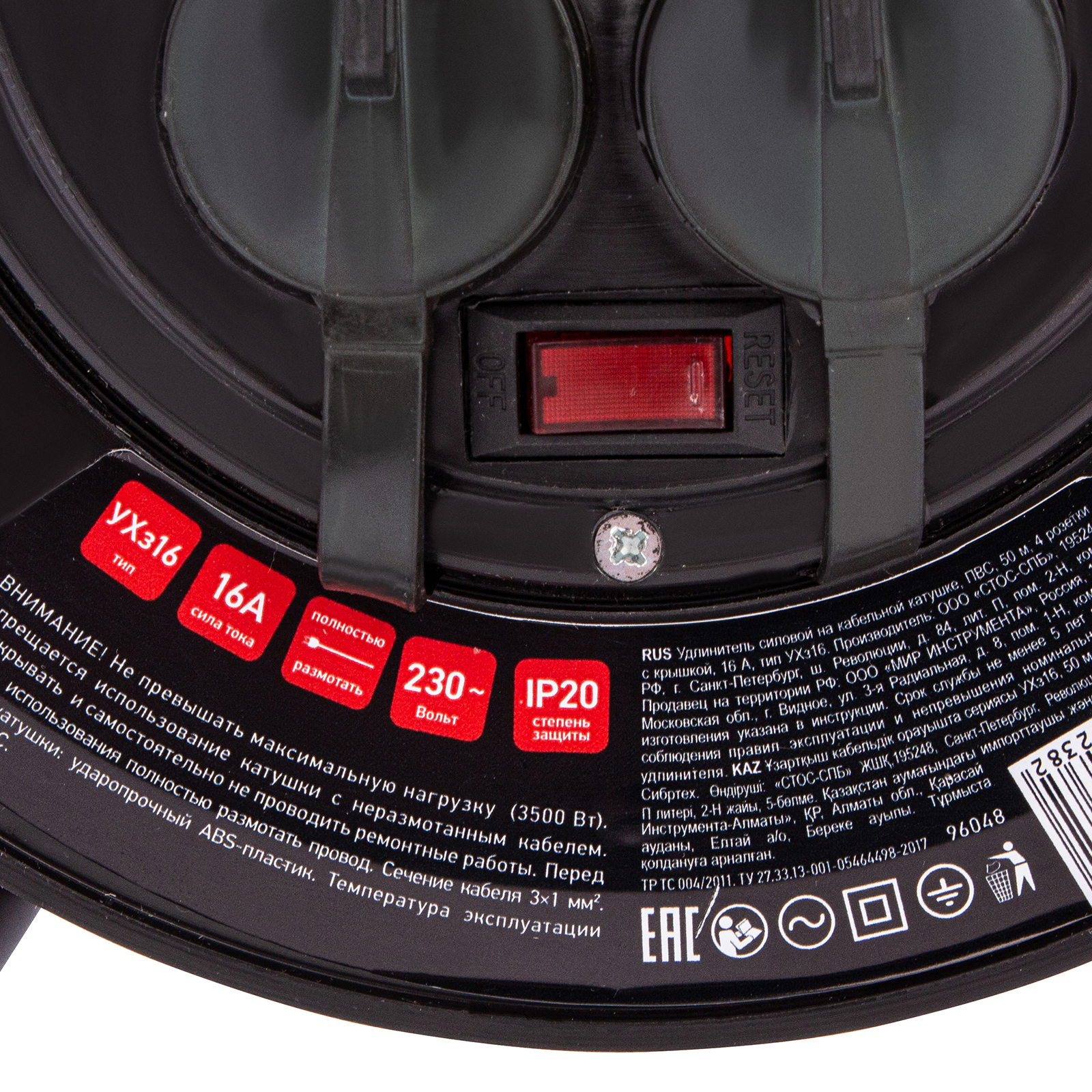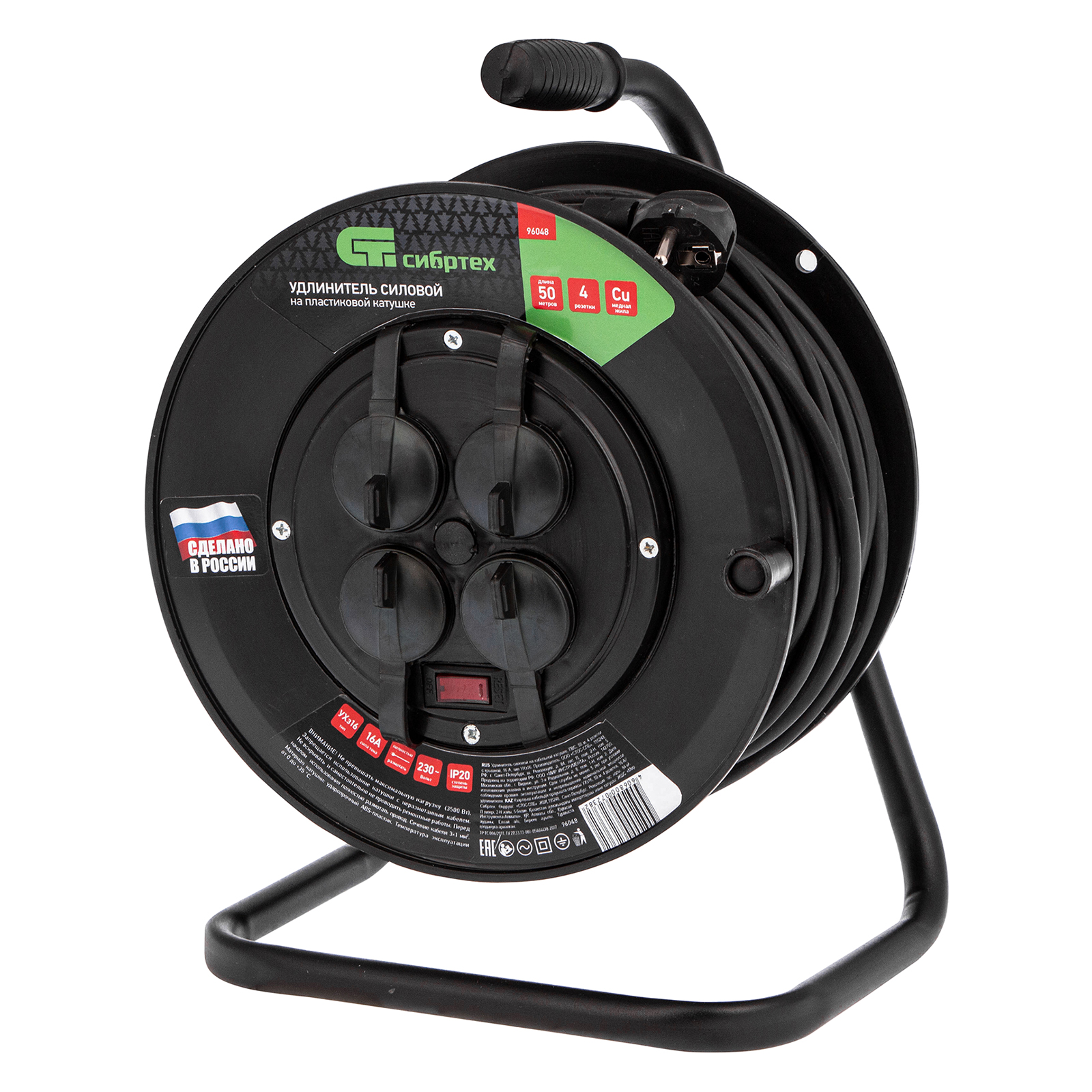 Силовой удлинитель на кабельной катушке Сибртех 96048 типа УХз16, 16 А, степень защиты IP44, имеет 4 розетки с крышкой для подключения различного электрооборудования суммарной мощностью 3500 Вт, используемого на расстоянии до 50 м от стационарного источника питания. Удобная ручка облегчает разматывание и сматывание кабеля. Заземляющие контакты розеток предотвращают поражение пользователя электрическим током. Розетки закрываются крышками, защищающими разъемы от попадания влаги и грязи. Сетевой удлинитель пригодится для работы с инструментом на строительной площадке или дачном участке.ПреимуществаПолая внутри металлическая стойка не утяжеляет конструкцию — удлинитель удобно переносить.Корпус выполнен из гибкого ударопрочного пластика, поэтому изделие прослужит долго.На корпусе имеется выключатель, что упрощает эксплуатацию удлинителя.Рукоятка обрезинена, что уменьшает риск получения электротравмы в случае повреждения кабеля.Кабель имеет двойную оболочку из ПВХ, обеспечивающую ему устойчивость к механическим повреждениям.Удлинитель имеет класс защиты IP44, поэтому его можно использовать в условиях высокой влажности.Характеристики удлинителя соответствуют требованиям ТР ТС 004/2011, что подтверждает его надежность.