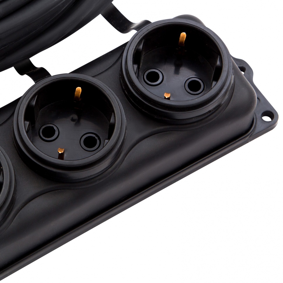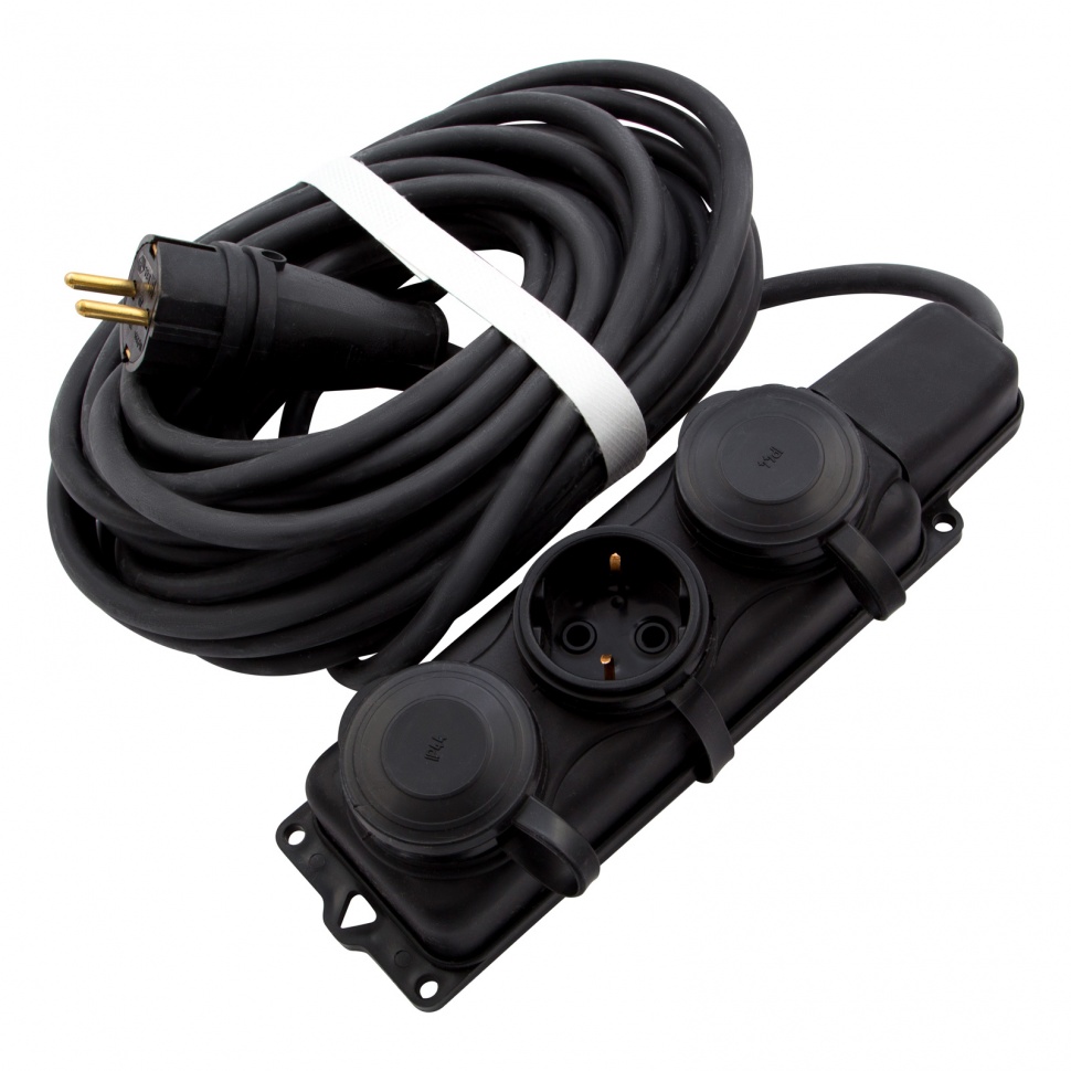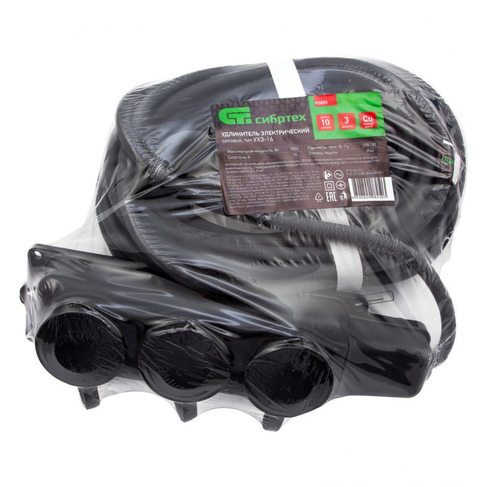 Электрический силовой удлинитель Сибртех 95885, тип УХЗ-16, с 3 розетками, имеет трехжильный кабель КГ 3*1,5 мм, рассчитанный на силу тока 16 А, и позволяет подключить к источнику питания приборы, находящиеся на расстоянии до 10 м. Суммарная потребляемая мощность не должна превышать 3500 Вт. Устройство функционирует при температуре окружающей среды от -50 °C до +50 °C и может использоваться в неотапливаемых помещениях или под открытым небом зимой. Удлинитель пригодится профессиональным работникам на строительной площадке, будет полезен в гараже или на даче.ПреимуществаПрочность — розеточная группа изготовлена из противоударного пластика, гибкий кабель обладает повышенной устойчивостью к механическим нагрузкам, истиранию и абразивному воздействию.Безопасность — вилка изготовлена из каучука, заземляющие контакты защищают пользователя от поражения электрическим током.Защита от попадания пыли, влаги и грязи — розетки закрываются крышками, удлинитель имеет степень защиты IP44.