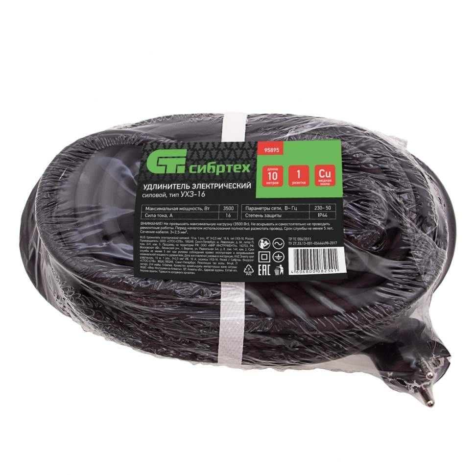 Силовой удлинитель Сибртех 95895, тип УХЗ-16, 16 А, тип кабеля КГ 3 х 2,5 мм, с 1 розеткой, позволяет подключать электрооборудование к сети на расстоянии до 10 м от стационарного источника электроснабжения. Медножильный кабель выдерживает нагрузку до 3500 Вт и рассчитан на длительное использование. Розетка закрывается защитной крышкой, предотвращающей попадание грязи и влаги на разъемы. Сетевой удлинитель используется в строительстве и на производстве.ПреимуществаКорпус розетки изготовлен из ударопрочного пластика, устойчивого к механическим повреждениям.Вилка изготовлена из каучука, что снижает риск получения электротравмы.Заземляющий контакт защищает пользователя от воздействия электрического тока.Двойная резиновая оболочка кабеля обеспечивает ему защиту от повреждений, истирания и абразивного воздействия.Кабель выдерживает температуру от -40 до +50 градусов, что позволяет использовать его зимой на улице или в неотапливаемом помещении.Удлинитель имеет класс защиты IP44, поэтому его можно применять в условиях высокой влажности.Изделие имеет сертификат соответствия ТР ТС 004/2011, что подтверждает его высокое качество.