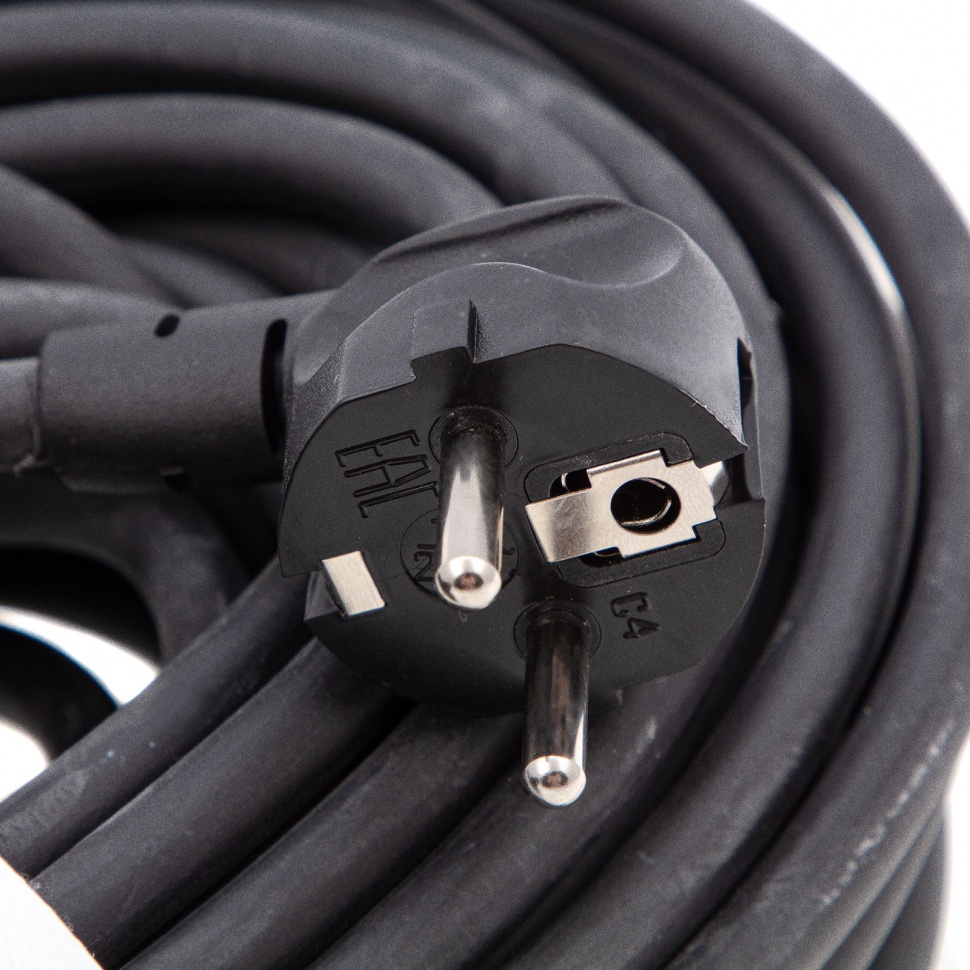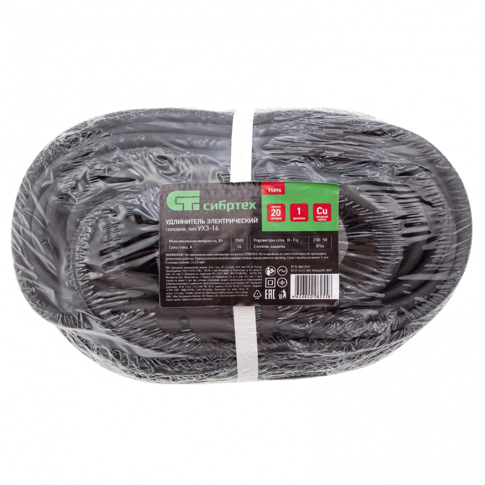 Силовой удлинитель Сибртех 95896, тип УХЗ-16, 16 А, тип кабеля КГ 3 х 2,5 мм, с 1 розеткой, позволяет подключать электрооборудование к сети на расстоянии до 20 м от стационарного источника электроснабжения. Медножильный кабель выдерживает нагрузку до 3500 Вт и рассчитан на длительное использование. Розетка закрывается защитной крышкой, предотвращающей попадание грязи и влаги на разъемы. Сетевой удлинитель используется в строительстве и на производстве.ПреимуществаКорпус розетки изготовлен из ударопрочного пластика, устойчивого к механическим повреждениям.Вилка изготовлена из каучука, что снижает риск получения электротравмы.Заземляющий контакт защищает пользователя от воздействия электрического тока.Двойная резиновая оболочка кабеля обеспечивает ему защиту от повреждений, истирания и абразивного воздействия.Кабель выдерживает температуру от -40 до +50 градусов, что позволяет использовать его зимой на улице или в неотапливаемом помещении.Удлинитель имеет класс защиты IP44, поэтому его можно применять в условиях высокой влажности.Изделие имеет сертификат соответствия ТР ТС 004/2011, что подтверждает его высокое качество.
