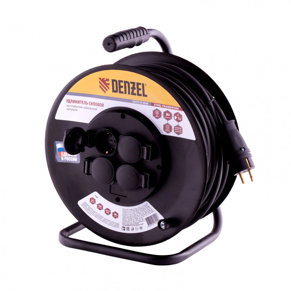 Силовой удлинитель на стальной катушке Denzel 95988 типа УХз-16, 16 А, кабель типа КГ с сечением 3 х 1,5 мм, с 4 розетками, позволяет работать с электрооборудованием на расстоянии до 50 м от источника питания. Медножильный кабель выдерживает нагрузку до 3500 Вт. Кабель типа КГ устойчив к температуре от -40 до +50 градусов, поэтому удлинитель подходит для профессионального использования в строительстве и на производстве. Розеточная группа изготовлена из пластика, что позволило снизить вес устройства — он составляет 6,38 кг, поэтому удлинитель легко переносить.ПреимуществаКорпус электрокатушки изготовлен из стали, что обеспечивает ему прочность и долговечность.Катушка покрыта порошковой эмалью, поэтому устойчива к образованию коррозии.Розетки имеют заземляющие контакты, а вилка изготовлена из каучука, что защищает пользователя от поражения электрическим током.Защитное резиновое покрытие кабеля обеспечивает ему высокую устойчивость к механическим повреждениям, истиранию и абразивному воздействию.Специальные крышки защищают гнезда розеток от проникновения пыли и влаги.Силовой удлинитель имеет степень защиты IP40, поэтому устойчив к повреждениям твердыми предметами диаметром от 1 мм.Характеристики удлинителя удовлетворяют требованиями ТР ТС 004/2011, что подтверждает его безопасность.