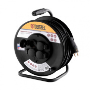 Силовой удлинитель на стальной катушке Denzel 95993 типа УХз-16, 16 А, кабель типа КГ с сечением 3 х 2,5 мм, с 4 розетками, позволяет работать с электрооборудованием на расстоянии до 50 м от источника питания. Медножильный кабель выдерживает нагрузку до 3500 Вт. Кабель типа КГ устойчив к температуре от -40 до +50 градусов, поэтому удлинитель подходит для профессионального использования в строительстве и на производстве. Розеточная группа изготовлена из пластика, что позволило снизить вес устройства — он составляет 7,2 кг, поэтому удлинитель легко переносить.ПреимуществаКорпус электрокатушки изготовлен из стали, что обеспечивает ему прочность и долговечность.Катушка покрыта порошковой эмалью, поэтому устойчива к образованию коррозии.Розетки имеют заземляющие контакты, а вилка изготовлена из каучука, что защищает пользователя от поражения электрическим током.Защитное резиновое покрытие кабеля обеспечивает ему высокую устойчивость к механическим повреждениям, истиранию и абразивному воздействию.Специальные крышки защищают гнезда розеток от проникновения пыли и влаги.Силовой удлинитель имеет степень защиты IP40, поэтому устойчив к повреждениям твердыми предметами диаметром от 1 мм.Характеристики удлинителя удовлетворяют требованиями ТР ТС 004/2011, что подтверждает его безопасность.