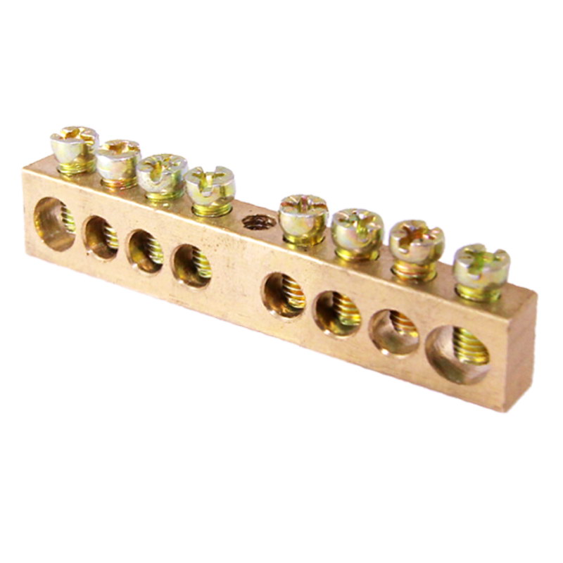 Применяется в щитовом оборудовании для подсоединения нулевых рабочих (N) и нулевых защитных проводов (РЕ). 8 отверстий, крепеж по центру.