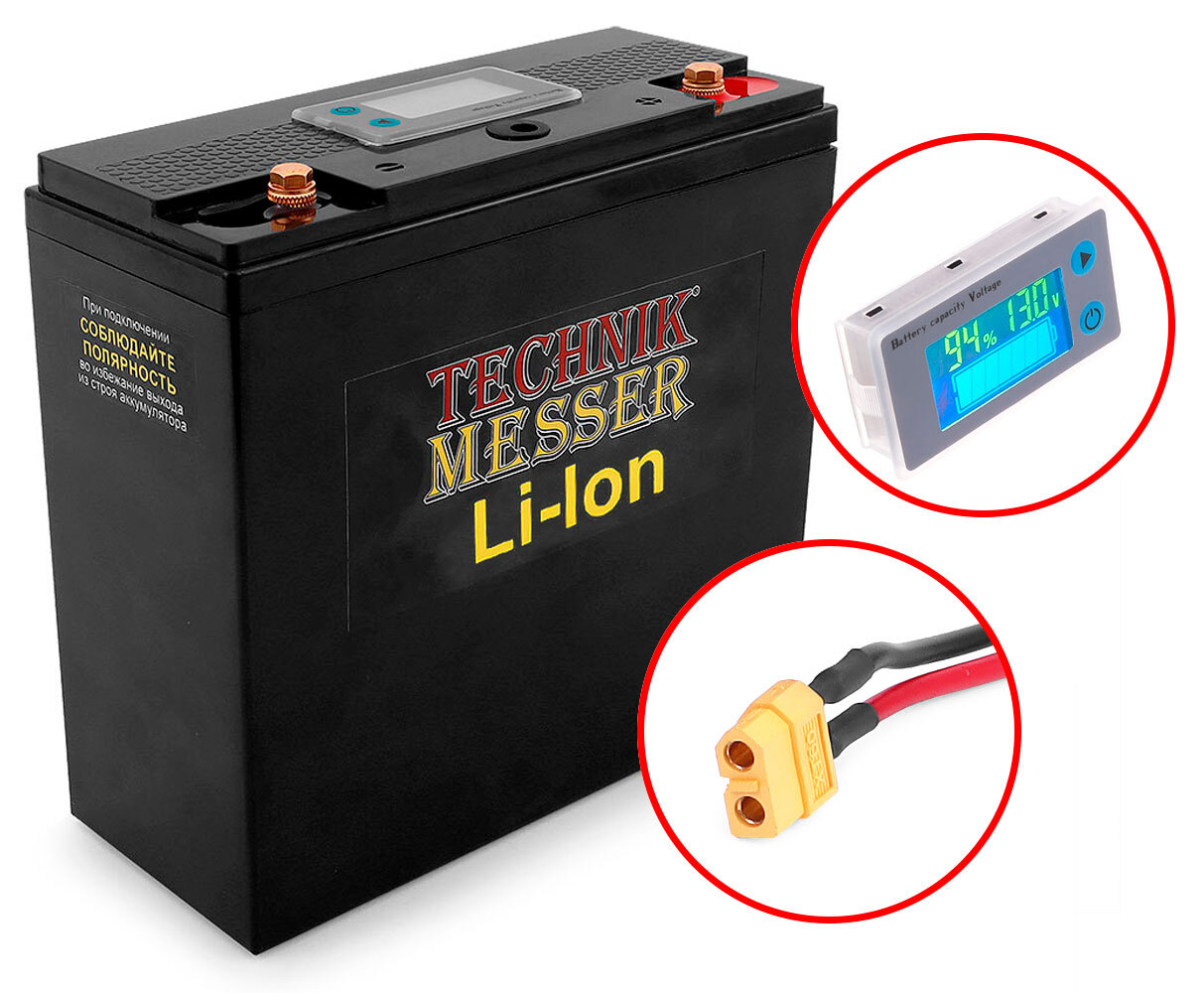 *BMS (Battery Management System) - специальный контроллер, встроенный в аккумуляторы TECHNIK-MESSER, защищающий его от перезаряда, переразряда, а также баллансирующий ячейки аккумуляторной батареи, что не позволяет снижаться её ёмкости со временем.