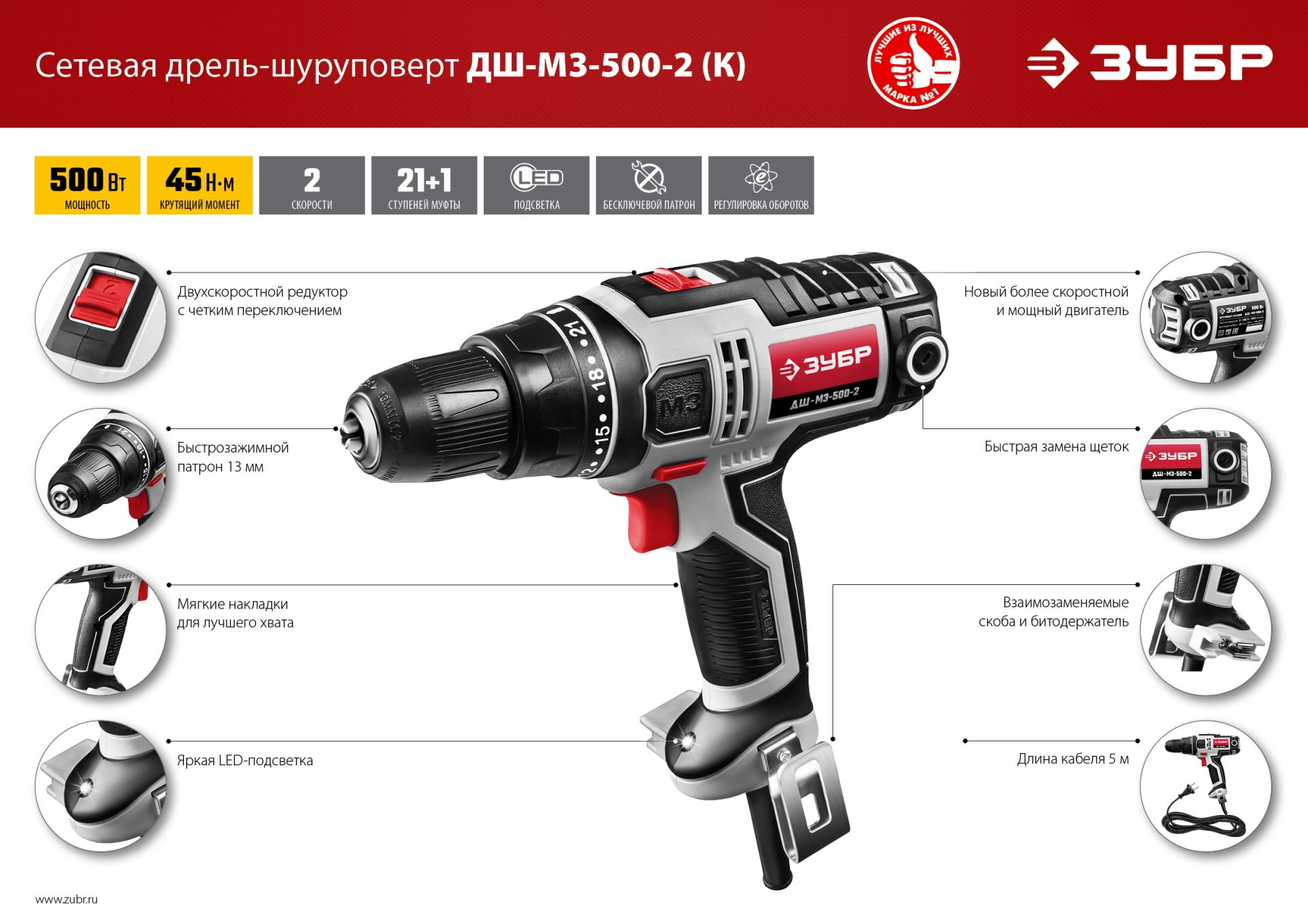 - Быстрозажимной одномуфтовый патрон для максимальной простоты и скорости замены расходного инструмента