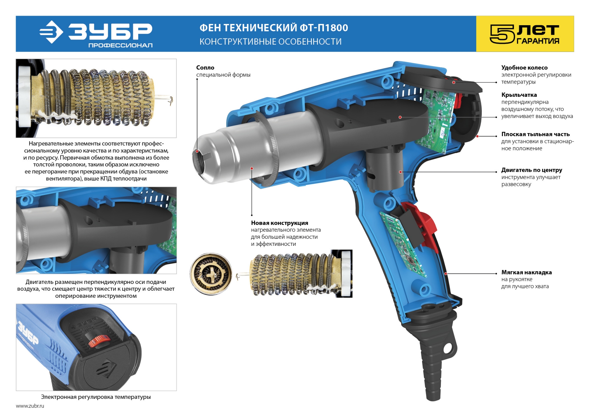 Модель профессионального уровня качества. Увеличенная толщина спиралей обеспечивает длительный срок службы нагревательного элемента. Точный контроль выходной температуры и ламинарный воздушный поток гарантируют высокое качество выходного воздуха. Плавная регулировка температуры позволяет использовать изделие для широкого спектра работ