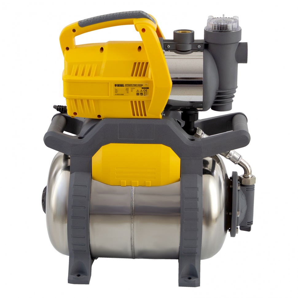 Насосная станция Denzel PSX950X 97214 мощностью 950 Вт и производительностью 3300 л/ч, с ресивером объемом 24 л из «нержавейки», обеспечивает подъем воды на высоту 38 м. Подходит для организации системы водоснабжения в загородном доме. Скорости перекачки до 3300 л/ч достаточно для обеспечения работы нескольких потребителей — в ванной, на кухне и в системе полива. Насосная станция способна выкачивать чистую воду из резервуаров и колодцев глубиной до 8 м. Гидроаккумулятор позволяет снизить частоту включений двигателя, а также обеспечивает запас воды в системе на случай отключения электричества.ПреимуществаДолгий срок службы — износостойкое торцевое уплотнение из карбида кремния, корпус насосной части, ресивер и вал из нержавеющей стали, рабочее колесо из прочного пластика рассчитаны на длительное использование.Встроенная термозащита — двигатель автоматически отключается в случае перегрева, что предотвращает его поломку.Стабильная работа — предусмотренная конструкцией мембрана защищает систему от гидравлических ударов, что увеличивает срок службы смесителей.Защита двигателя — специальный кожух предохраняет его от механических повреждений, улучшает охлаждение, а также снижает уровень шума во время работы.Очистка воды — встроенный фильтр исключает засорение насоса.Автоматическая работа — благодаря прессостату включение и выключение насоса происходит без участия пользователя.Контроль давления — встроенный в корпус манометр облегчает отслеживание рабочих параметров.Устойчивость — в ножках имеются отверстия под болты, поэтому станцию можно вмонтировать в пол.Удобная транспортировка — небольшой вес 13,3 кг и ручки на корпусе облегчают перемещение насосной станции.Подтвержденное качество — гарантия на заводской брак действует 3 года.