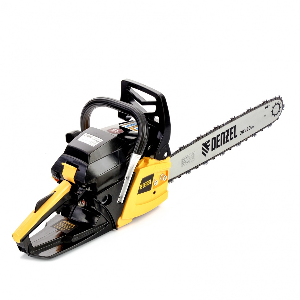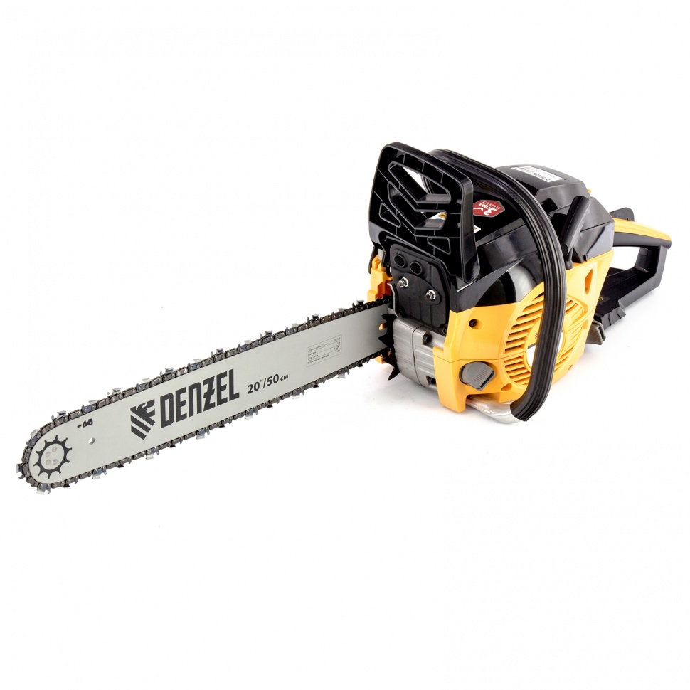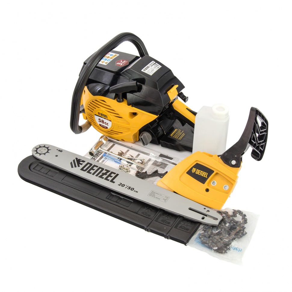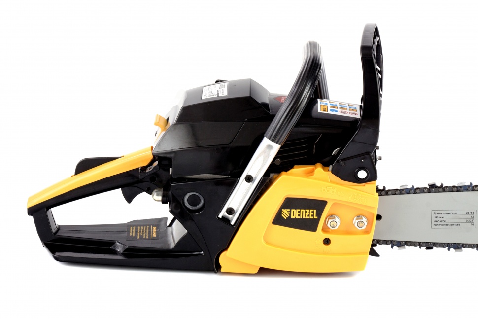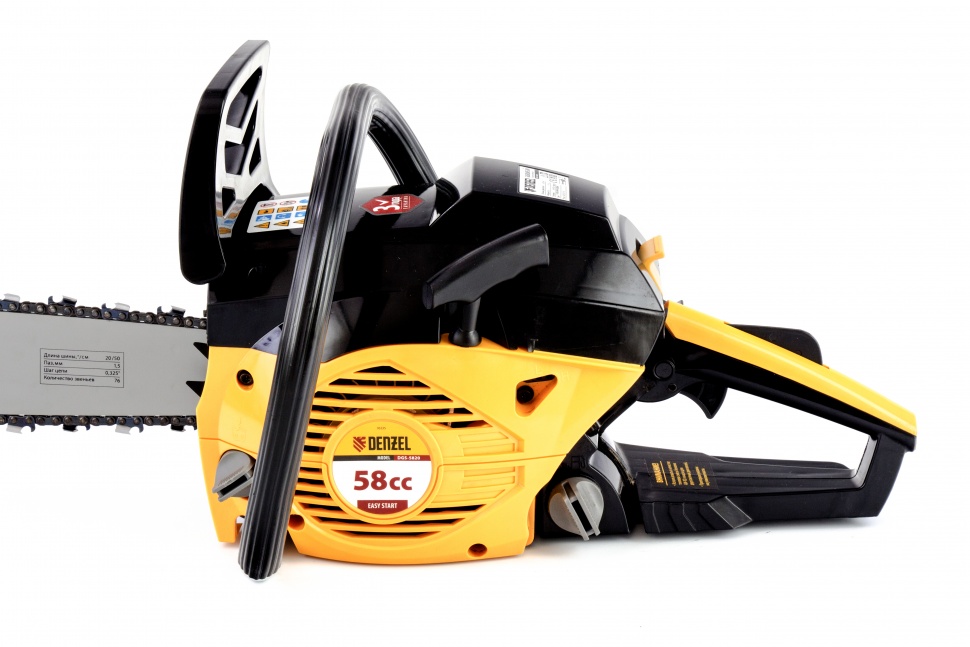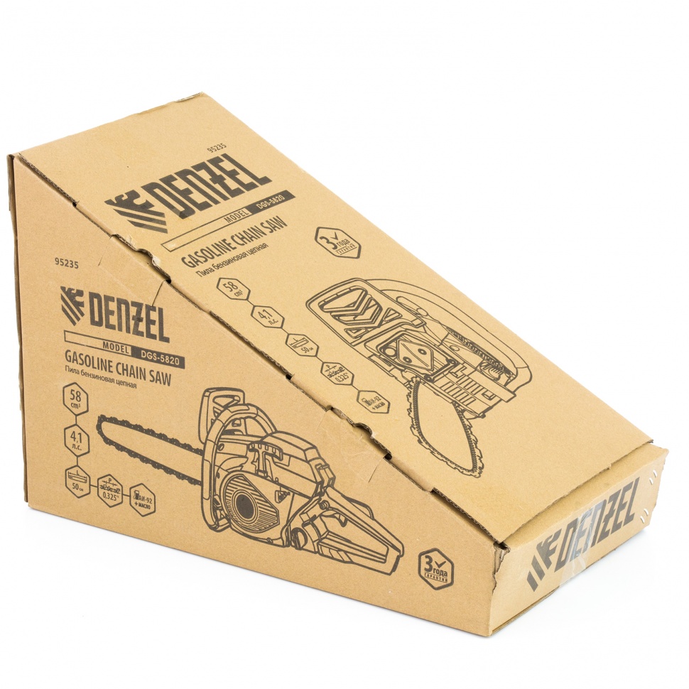 Пила цепная бензиновая Denzel DGS-5820 95235 с двигателем объемом 58 см3 и мощностью 4,1 л.с. поставляется с шиной длиной 50 см и цепью с 76 звеньями (шаг 0,325″, паз 1,5 мм). Это полупрофессиональный инструмент для заготовки дров, обрезки ветвей и сучьев в саду, распила древесины твердых и мягких пород. Пила выдерживает интенсивные нагрузки, используется во время строительных и ремонтных работ, будет полезна на дачном участке.ПреимуществаЭффективность — двигатель Garden Line от Denzel обеспечивает высокую производительность и экономичный расход топлива.Высококачественное исполнение — хромированный цилиндр, закаленный коленвал, облегченный поршень и свеча зажигания Bosch значительно повышают ресурс пилы.Безопасность пользователя — усиленный щиток и автоматический тормоз цепи уменьшают риск получения травм при отскоке пилы, также предусмотрена защита от случайного пуска.Праймер для подкачки топлива — пила легко запускается даже после длительного простоя.Долговечность — автоматическая система смазки цепи не допускает перерасхода масла и снижает износ цепи и шины.Стальной зубчатый упор — пилу удобно фиксировать в процессе работы для повышения качества реза и уменьшения отдачи.Комфортная работа — антивибрационная система уменьшает нагрузку на руки.Вместительный топливный бак — объем 550 мл позволяет работать долгое время без заправки.Удобное обслуживание — конструкцией предусмотрен быстрый доступ к фильтру и свече зажигания.Гарантия 3 года — высокое качество инструмента подтверждено производителем.