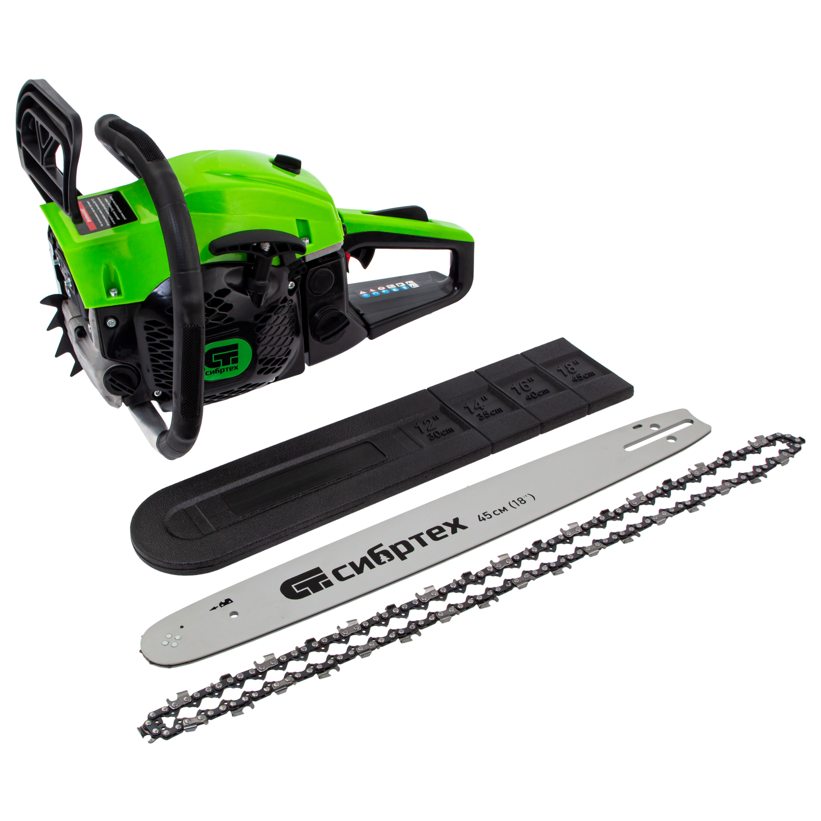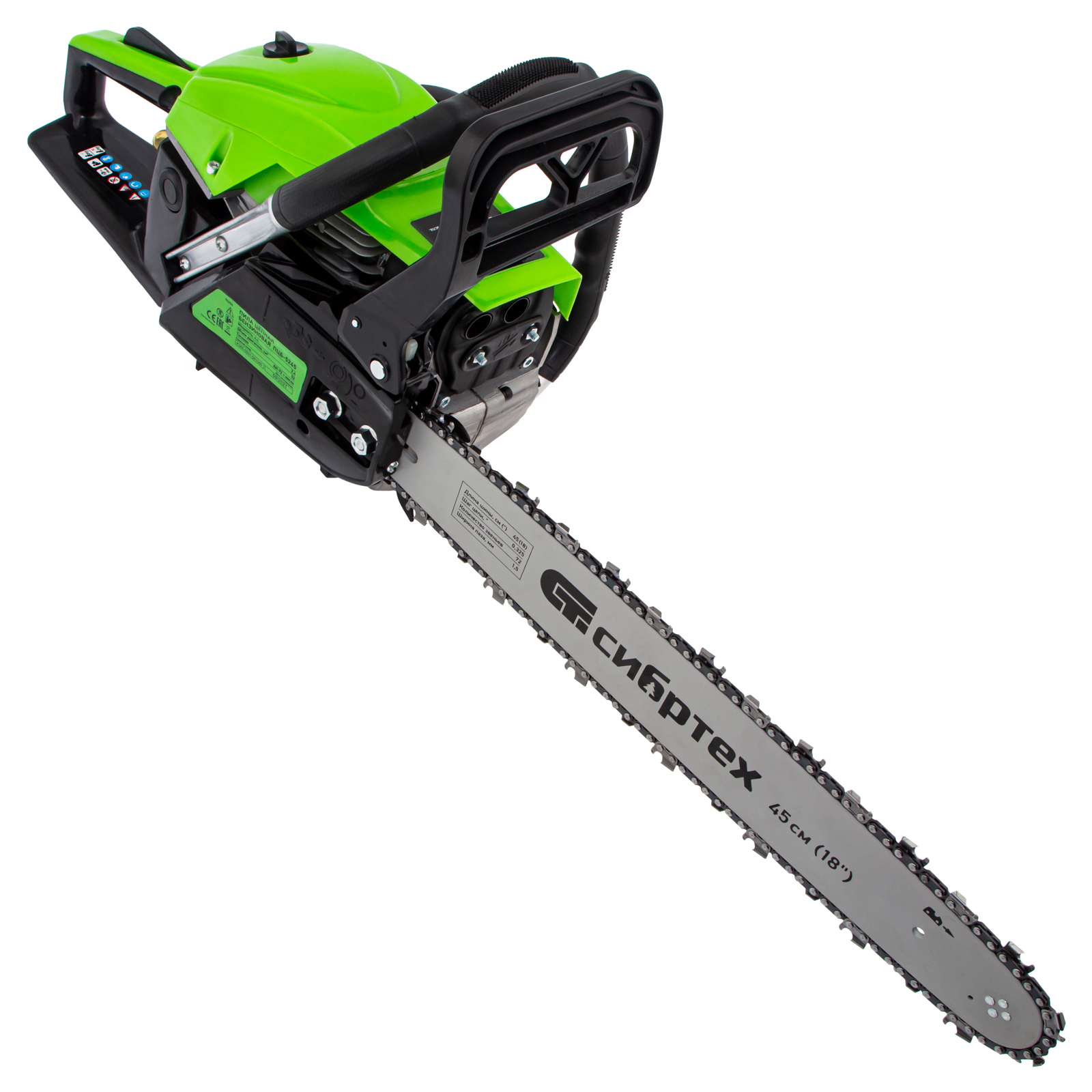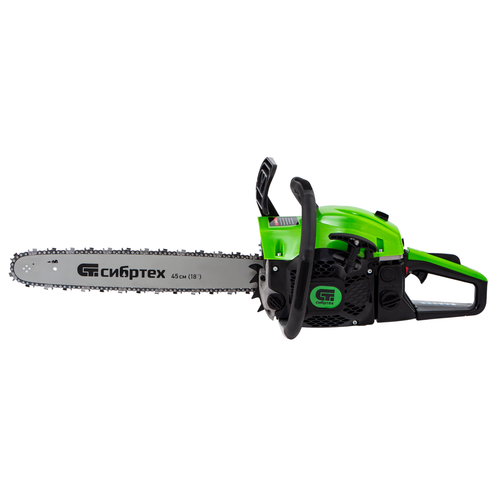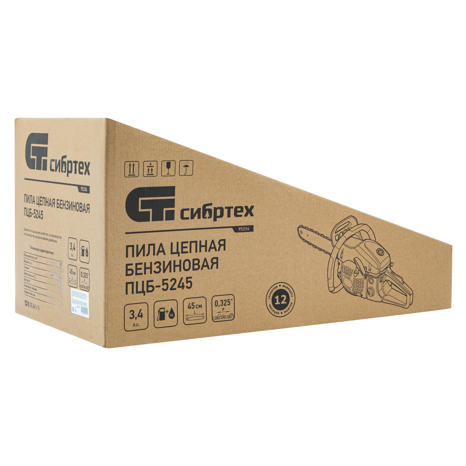 Пила цепная бензиновая Сибртех ПЦБ-5245 95204 мощностью 3,4 л.с. комплектуется шиной длиной 45 см с 72 звеньями (шаг 0,325″, паз 1,5 мм). Рассчитана на облагораживание приусадебных участков, валку деревьев, распиловку бревен, заготовку дров, подравнивание насаждений в саду, подпиливание веток. Оптимальна для бытового использования.Длина шины увеличена до 45 см, это позволяет легче справиться с массивными ветками и древесиной разных пород. Чехол для шины обеспечивает ее безопасное хранение и транспортировку. Для заправки двигателя требуется топливная смесь, а в комплект поставки включен дозатор для ее приготовления.ПреимуществаЗащита от случайного пуска — блокиратор газа не дает цепи вращаться, пока пользователь не нажмет на него.Защита двигателя от загрязнения и поломок — воздушный фильтр задерживает пыль, опилки и другие частицы, не давая им проникнуть внутрь инструмента.Безопасность — при отскоке пилы моментально срабатывает тормоз и цепь останавливается.Автоподкачка топлива — праймер позволяет быстро запустить пилу, достаточно лишь несколько раз нажать на него.Автоматическая система смазывания цепи — к пильной фурнитуре подается необходимое количество масла, в зависимости от скорости оборотов двигателя, что позволяет сохранить высокий ресурс ходовых частей.Эффективная работа — стальной зубчатый упор помогает добиться точного надпила перед валкой дерева и уменьшает отдачу от пилы, поэтому мастеру будет легче удерживать ее.Простое обслуживание — регулировочный винт на боковой части корпуса позволяет легко и быстро натягивать цепь без использования ключа.Комфортная работа — антивибрационная система снижает воздействие на суставы и систему кровообращения мастера, позволяя избежать проблем со здоровьем при частом использовании бензопилы.Удобный хват — эргономичные рукоятки с подпальцевыми выемками облегчают работу.