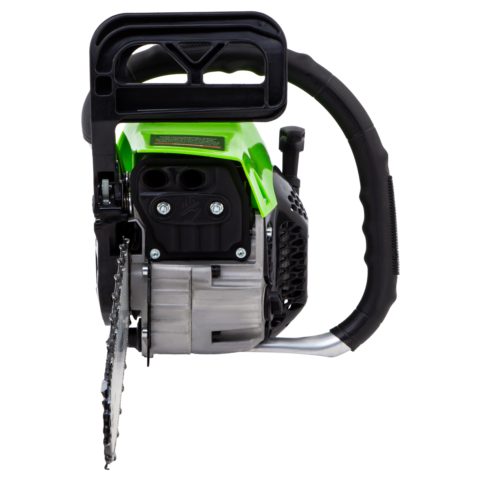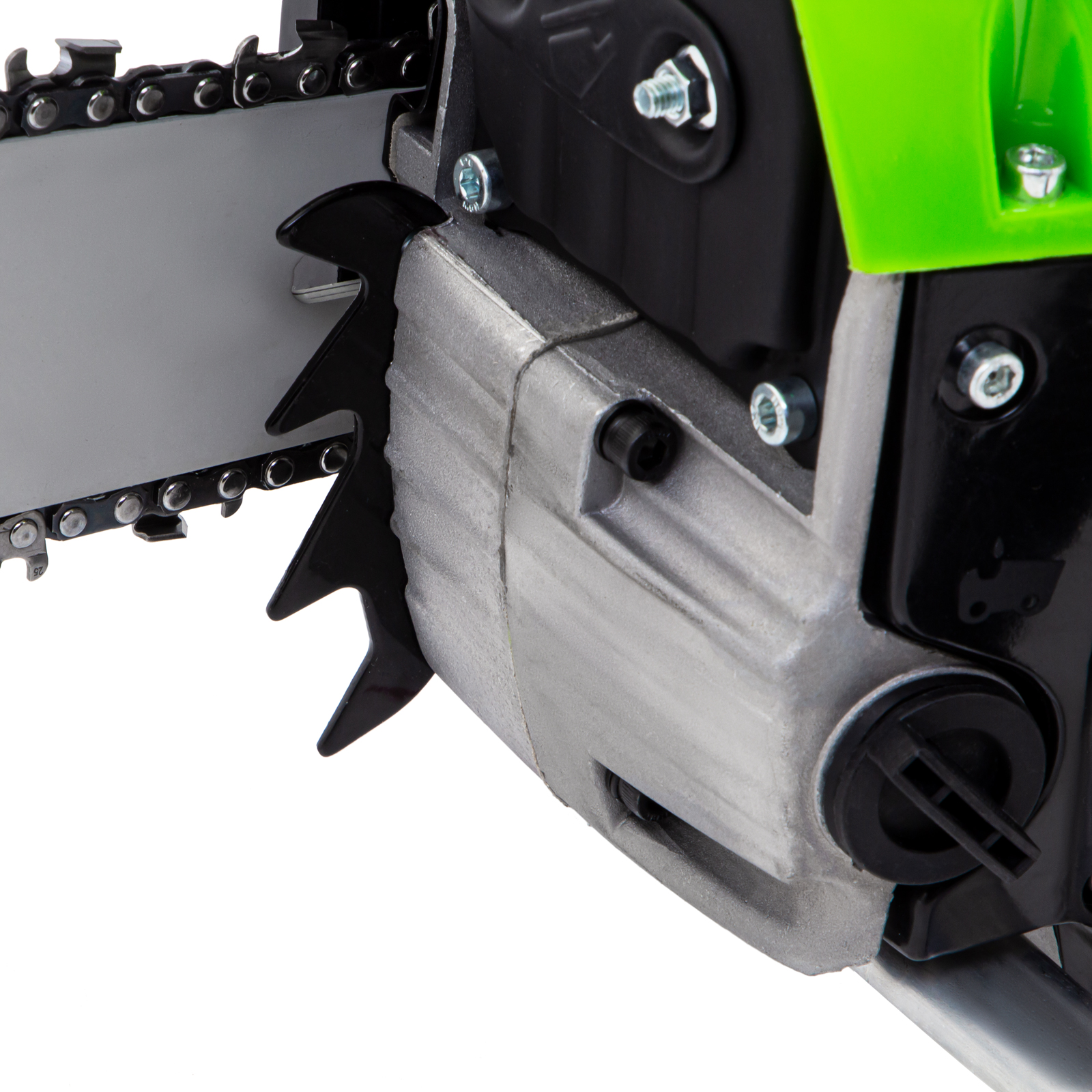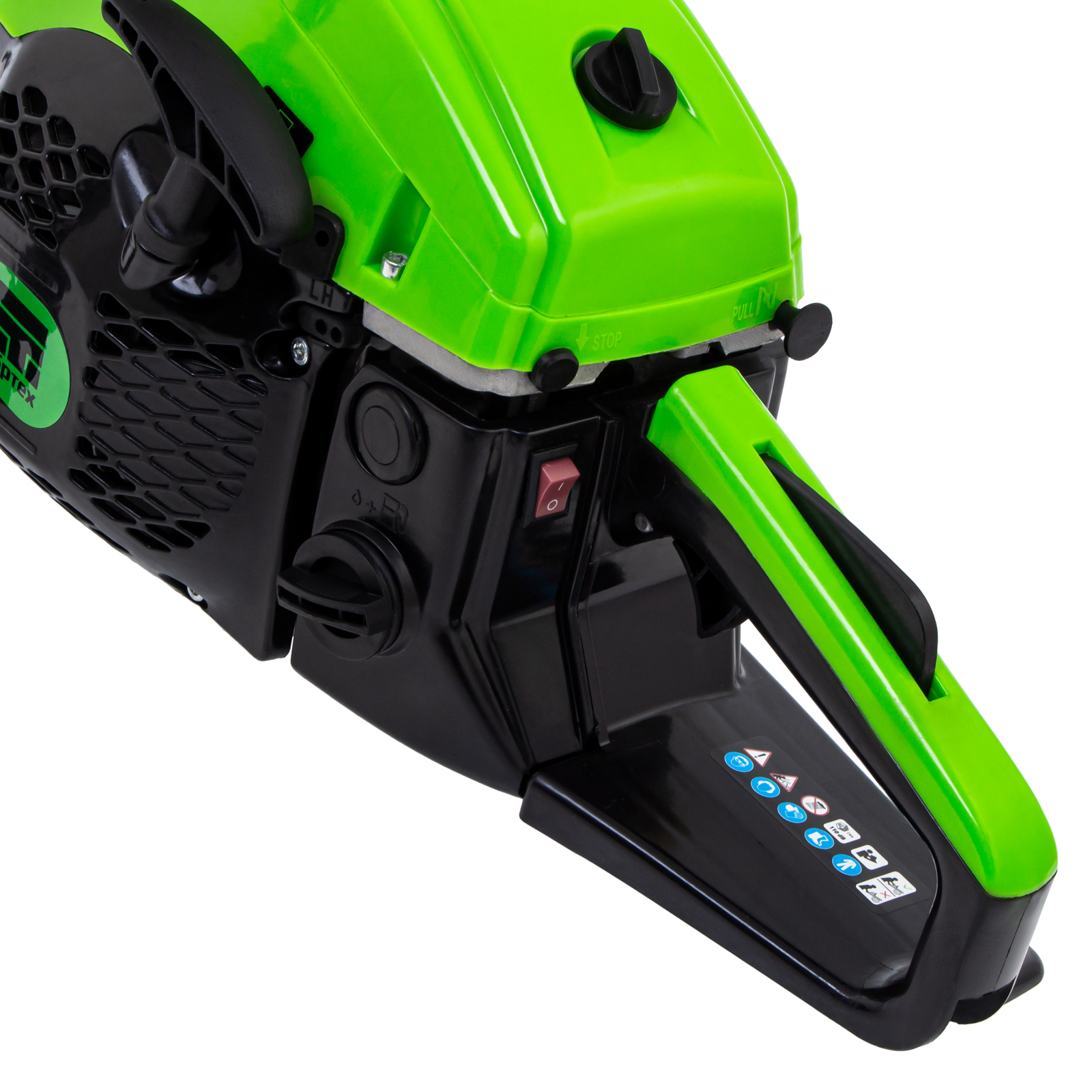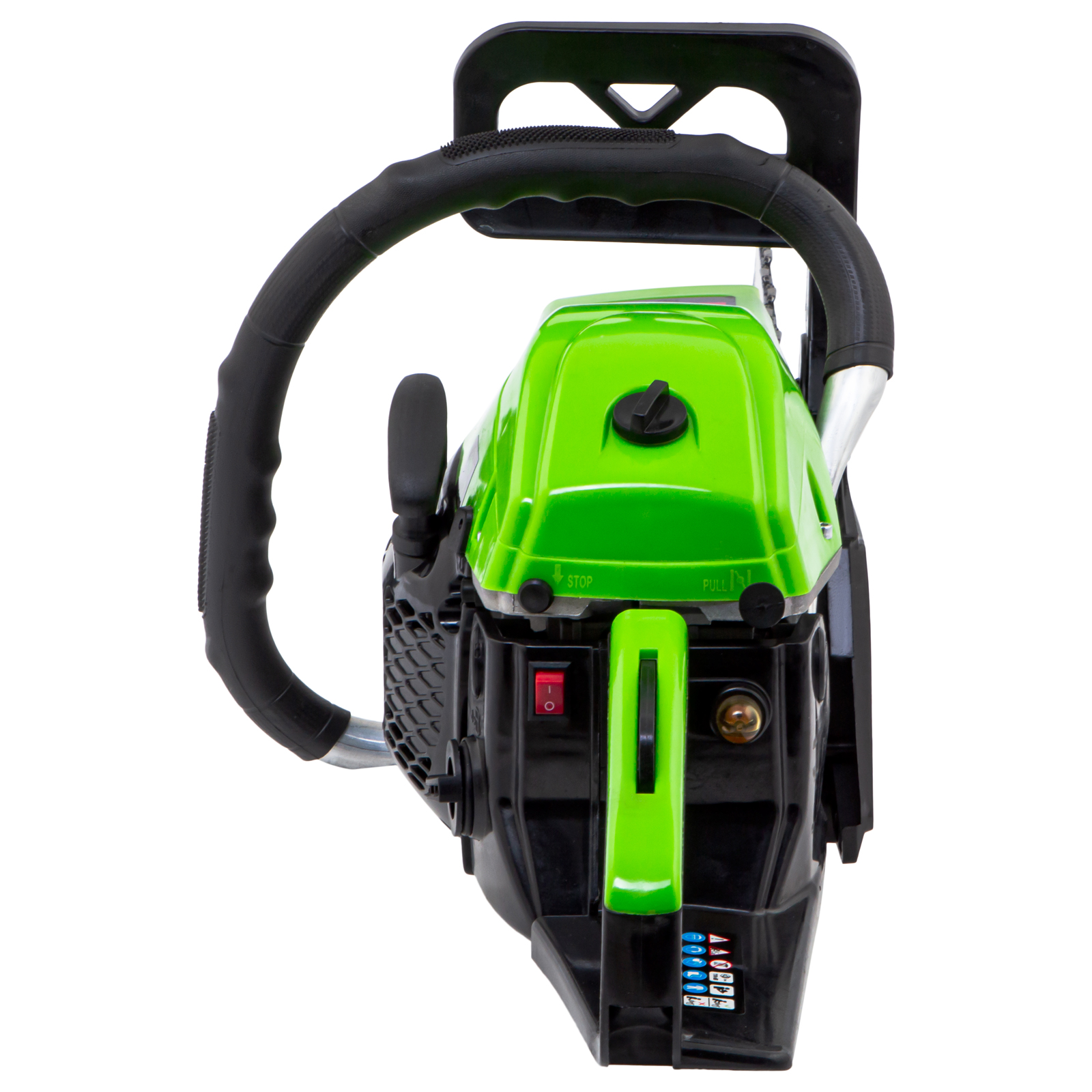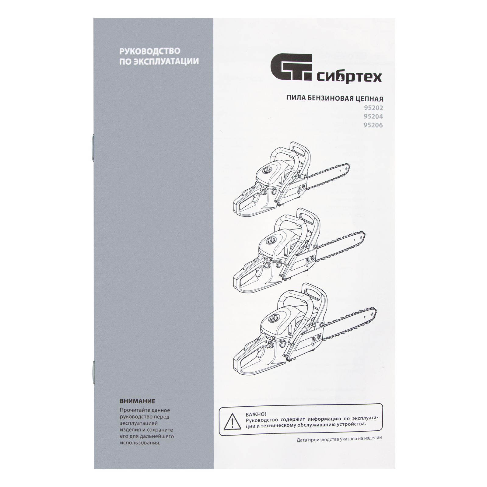 Пила цепная бензиновая Сибртех ПЦБ-5245 95204 мощностью 3,4 л.с. комплектуется шиной длиной 45 см с 72 звеньями (шаг 0,325″, паз 1,5 мм). Рассчитана на облагораживание приусадебных участков, валку деревьев, распиловку бревен, заготовку дров, подравнивание насаждений в саду, подпиливание веток. Оптимальна для бытового использования.Длина шины увеличена до 45 см, это позволяет легче справиться с массивными ветками и древесиной разных пород. Чехол для шины обеспечивает ее безопасное хранение и транспортировку. Для заправки двигателя требуется топливная смесь, а в комплект поставки включен дозатор для ее приготовления.ПреимуществаЗащита от случайного пуска — блокиратор газа не дает цепи вращаться, пока пользователь не нажмет на него.Защита двигателя от загрязнения и поломок — воздушный фильтр задерживает пыль, опилки и другие частицы, не давая им проникнуть внутрь инструмента.Безопасность — при отскоке пилы моментально срабатывает тормоз и цепь останавливается.Автоподкачка топлива — праймер позволяет быстро запустить пилу, достаточно лишь несколько раз нажать на него.Автоматическая система смазывания цепи — к пильной фурнитуре подается необходимое количество масла, в зависимости от скорости оборотов двигателя, что позволяет сохранить высокий ресурс ходовых частей.Эффективная работа — стальной зубчатый упор помогает добиться точного надпила перед валкой дерева и уменьшает отдачу от пилы, поэтому мастеру будет легче удерживать ее.Простое обслуживание — регулировочный винт на боковой части корпуса позволяет легко и быстро натягивать цепь без использования ключа.Комфортная работа — антивибрационная система снижает воздействие на суставы и систему кровообращения мастера, позволяя избежать проблем со здоровьем при частом использовании бензопилы.Удобный хват — эргономичные рукоятки с подпальцевыми выемками облегчают работу.