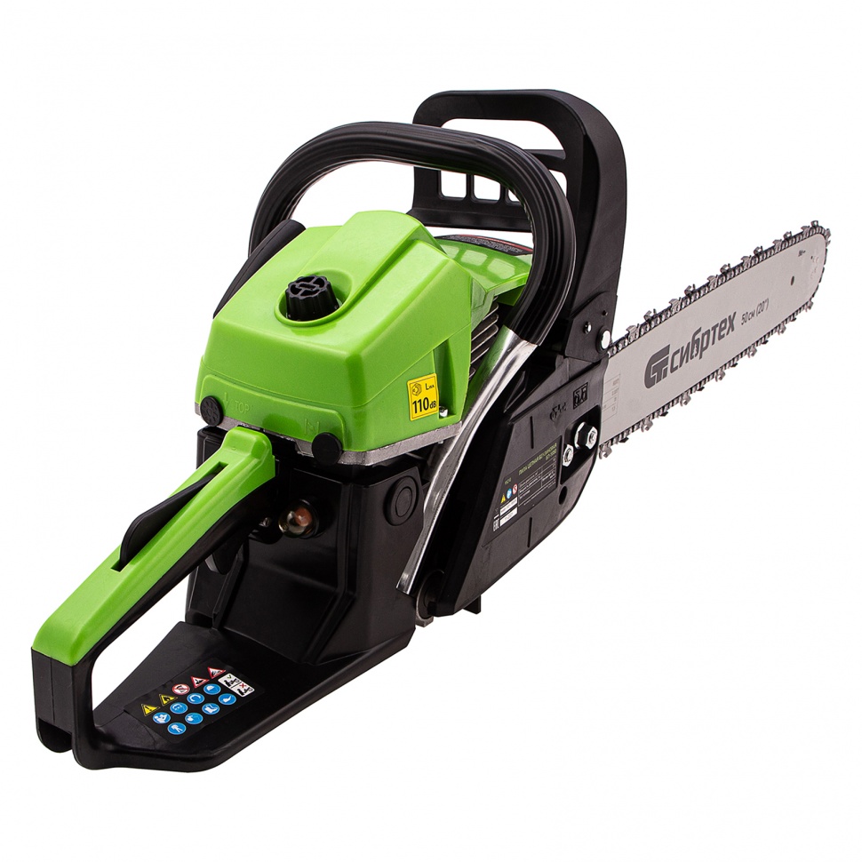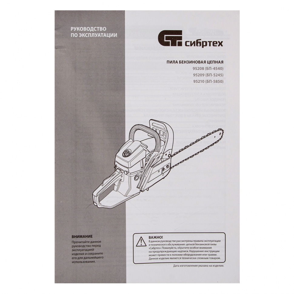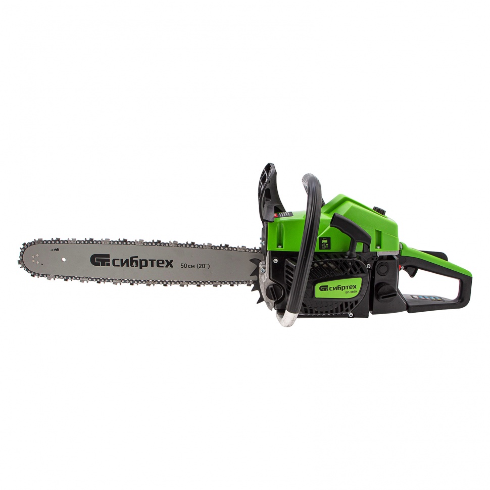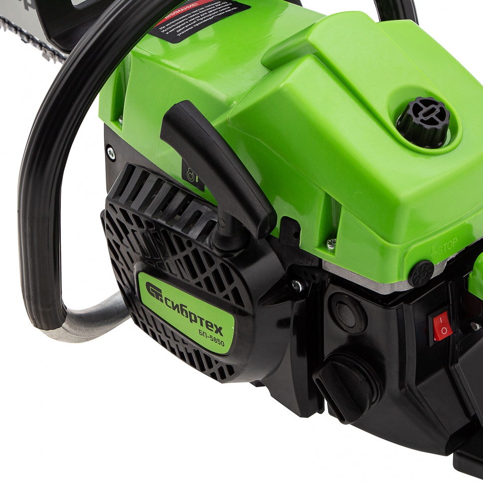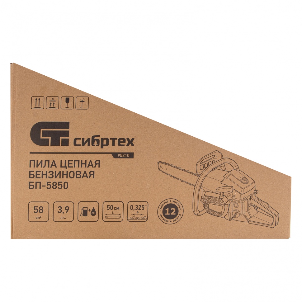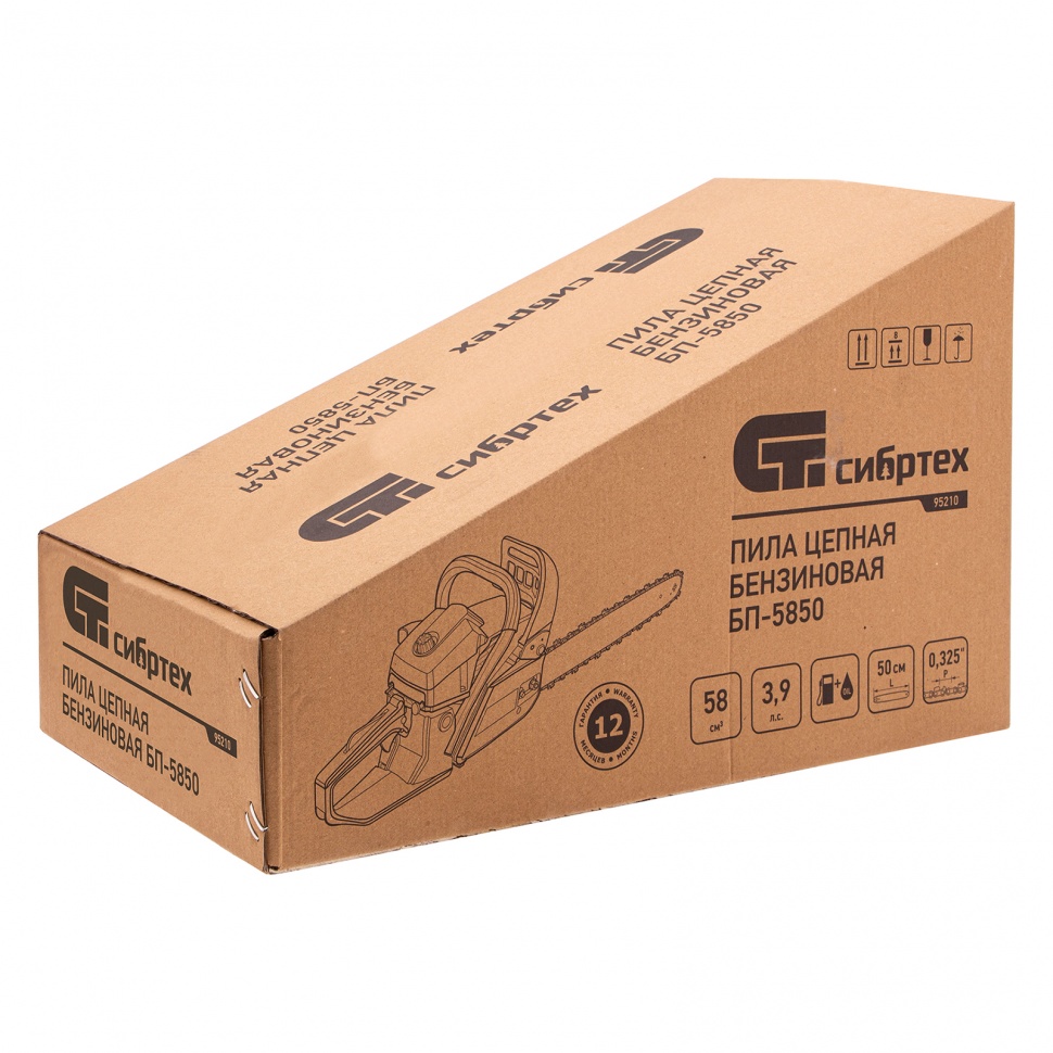 Пила цепная бензиновая Сибртех БП-5850 95210 с двухтактным двигателем объемом 58 см3 и мощностью 3,9 л.с предназначена для распиловки древесины различных пород, заготовки дров, спиливания веток и крупных сучков. Пригодится во время ремонта, строительства, благоустройства садового участка и при выполнении бытовых задач. Мощный и экономичный двигатель в сочетании с качественной шиной длиной 50 см (цепь с 76 звеньями с шагом 0,325 дюйма и шириной паза 1,5 мм) позволяют достичь наилучших результатов в работе.ПреимуществаБезопасность — пила оснащена блокировкой от случайного запуска и тормозом цепи, который моментально срабатывает при отскоке инструмента.Регулируемая система смазки цепи — автоматическая подача масла к пильной фурнитуре значительно увеличивает срок ее службы.Антивибрационная система — негативные воздействия колебаний уменьшены, что позволяет работать долгое время без вреда для суставов рук.Стальной зубчатый упор — пилу можно зафиксировать во время работы, это обеспечивает более точный распил и одновременно снижает отдачу.Комфортная работа — пила имеет компактные габариты 47,5 × 25 × 30 см и небольшой вес 6,6 кг.