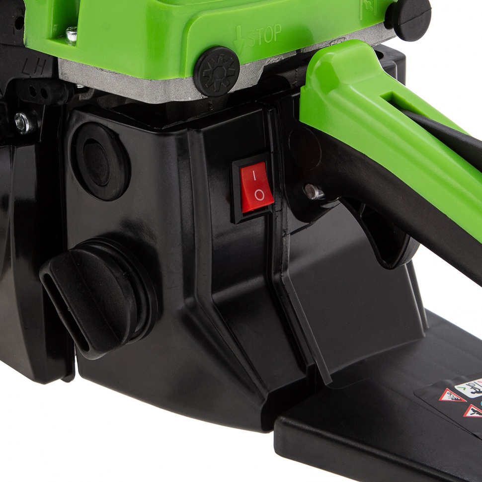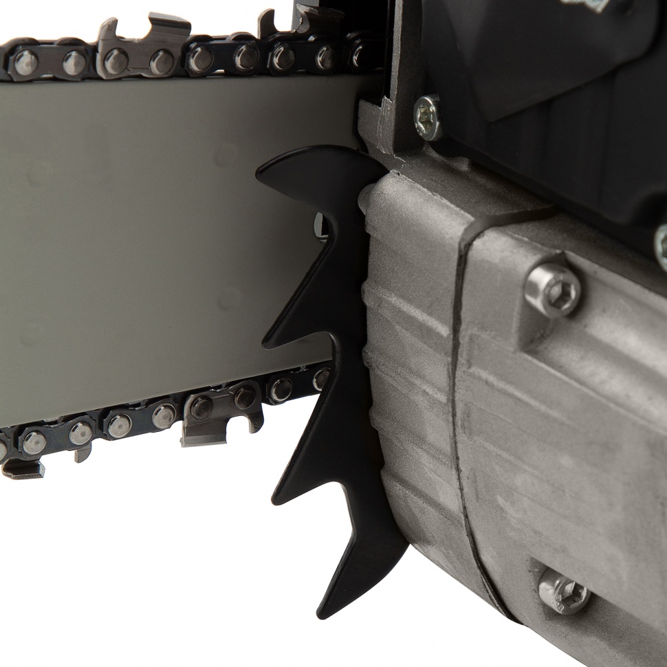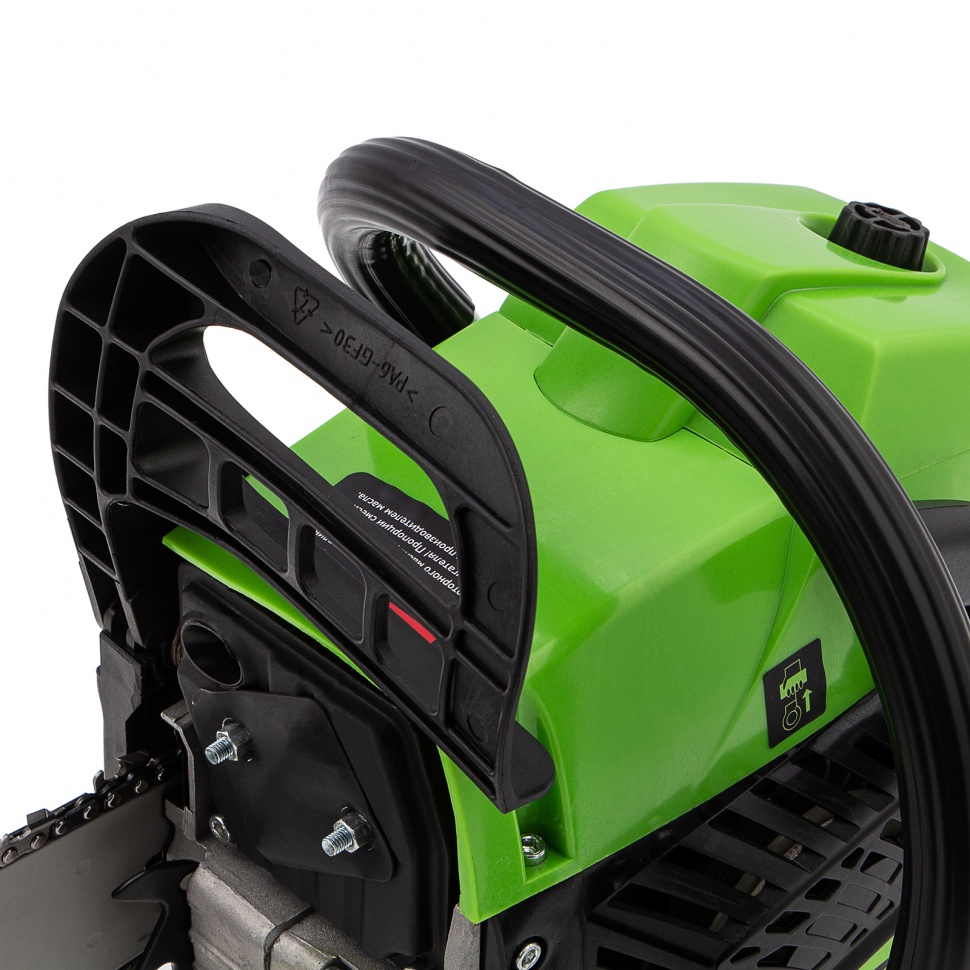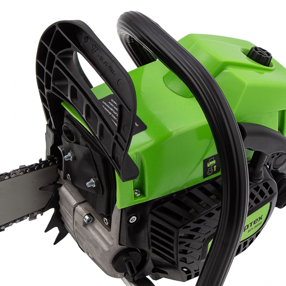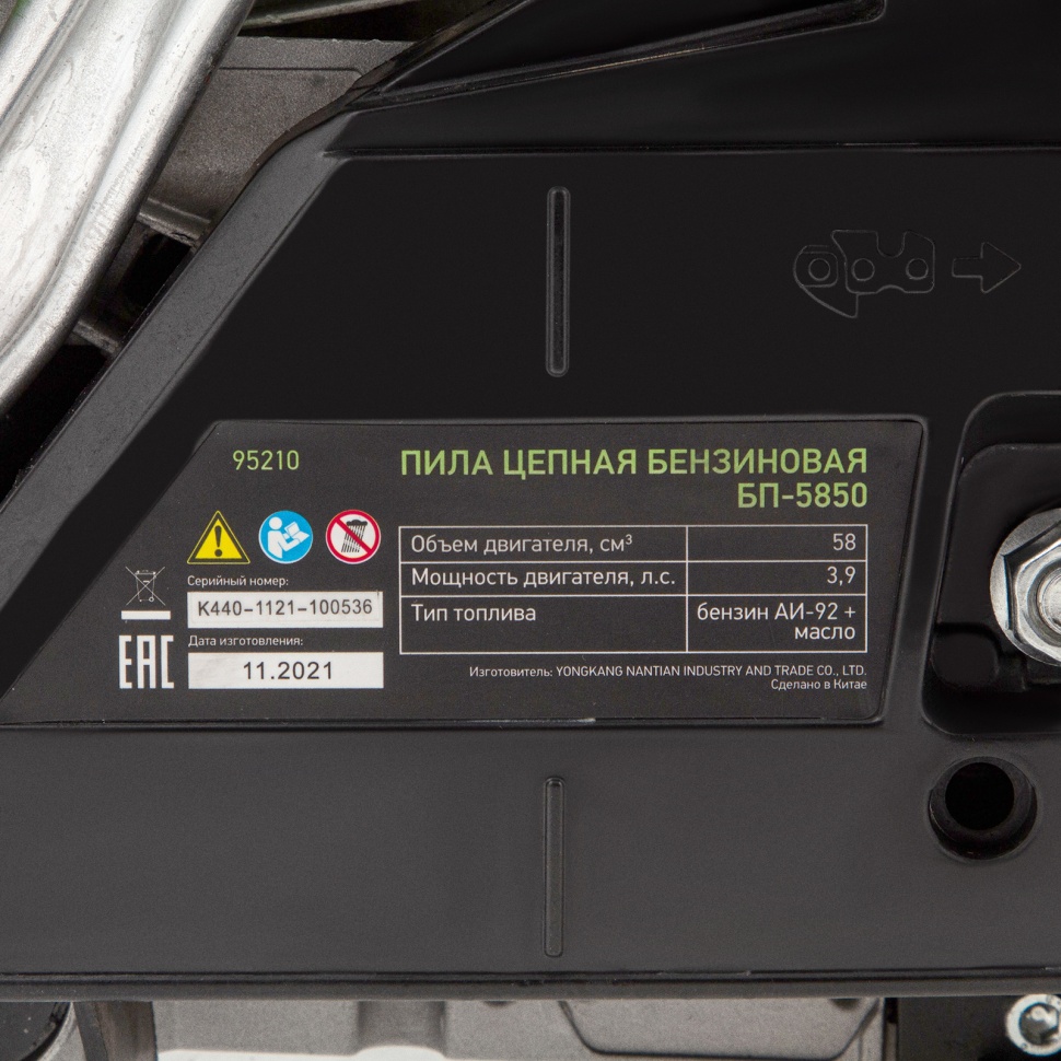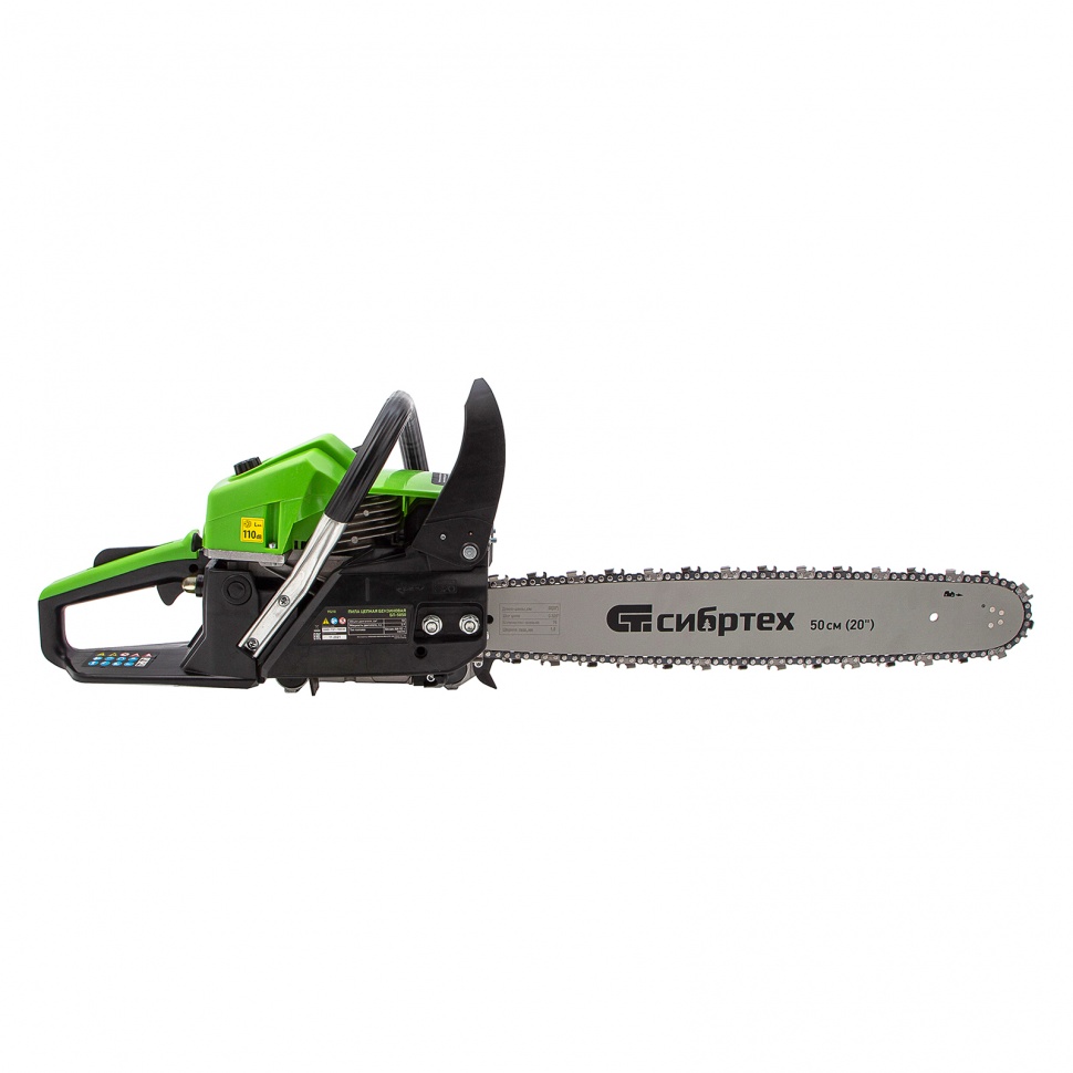 Пила цепная бензиновая Сибртех БП-5850 95210 с двухтактным двигателем объемом 58 см3 и мощностью 3,9 л.с предназначена для распиловки древесины различных пород, заготовки дров, спиливания веток и крупных сучков. Пригодится во время ремонта, строительства, благоустройства садового участка и при выполнении бытовых задач. Мощный и экономичный двигатель в сочетании с качественной шиной длиной 50 см (цепь с 76 звеньями с шагом 0,325 дюйма и шириной паза 1,5 мм) позволяют достичь наилучших результатов в работе.ПреимуществаБезопасность — пила оснащена блокировкой от случайного запуска и тормозом цепи, который моментально срабатывает при отскоке инструмента.Регулируемая система смазки цепи — автоматическая подача масла к пильной фурнитуре значительно увеличивает срок ее службы.Антивибрационная система — негативные воздействия колебаний уменьшены, что позволяет работать долгое время без вреда для суставов рук.Стальной зубчатый упор — пилу можно зафиксировать во время работы, это обеспечивает более точный распил и одновременно снижает отдачу.Комфортная работа — пила имеет компактные габариты 47,5 × 25 × 30 см и небольшой вес 6,6 кг.