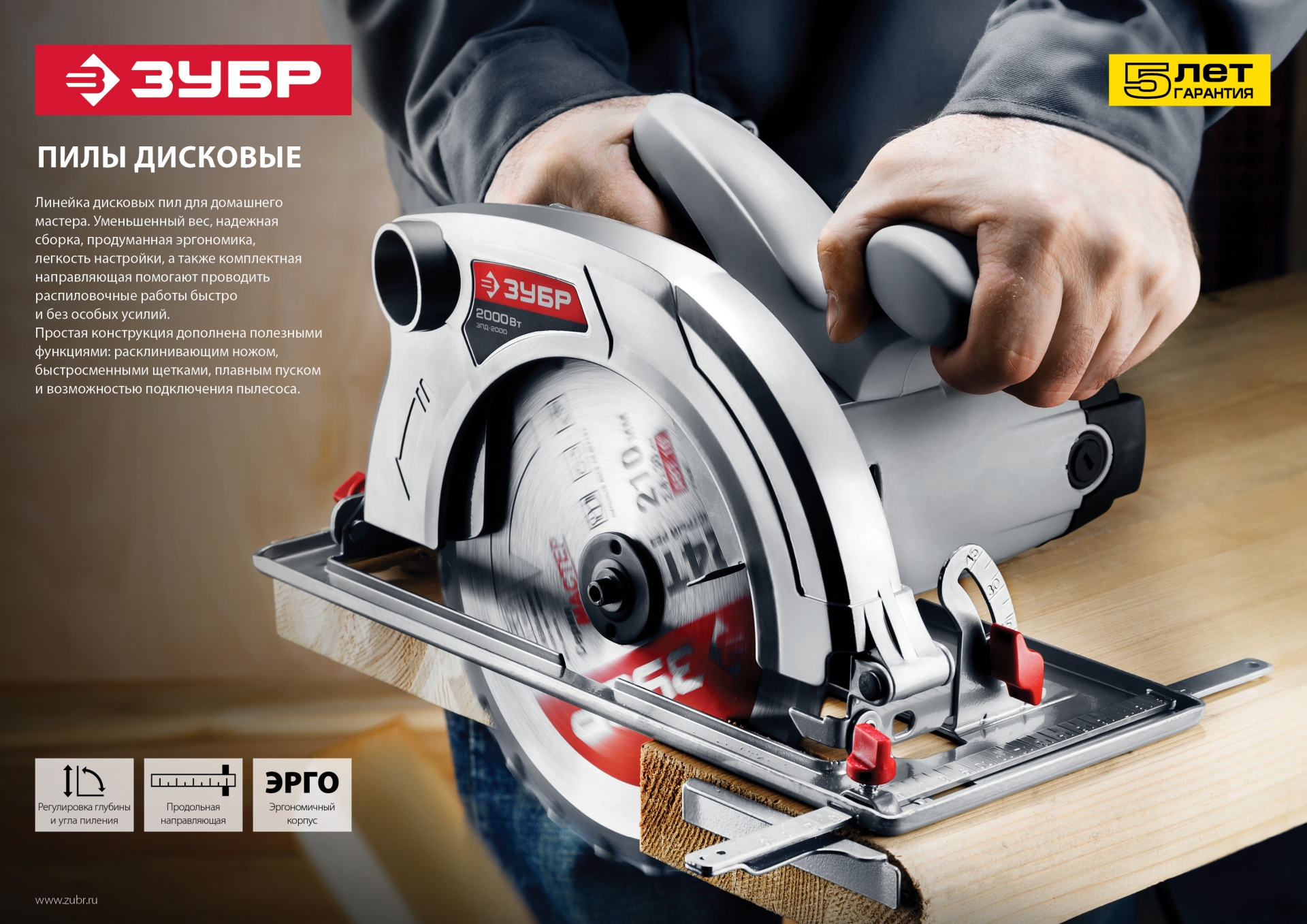 - Бесступенчатая регулировка глубины и угла пиления для точных работ