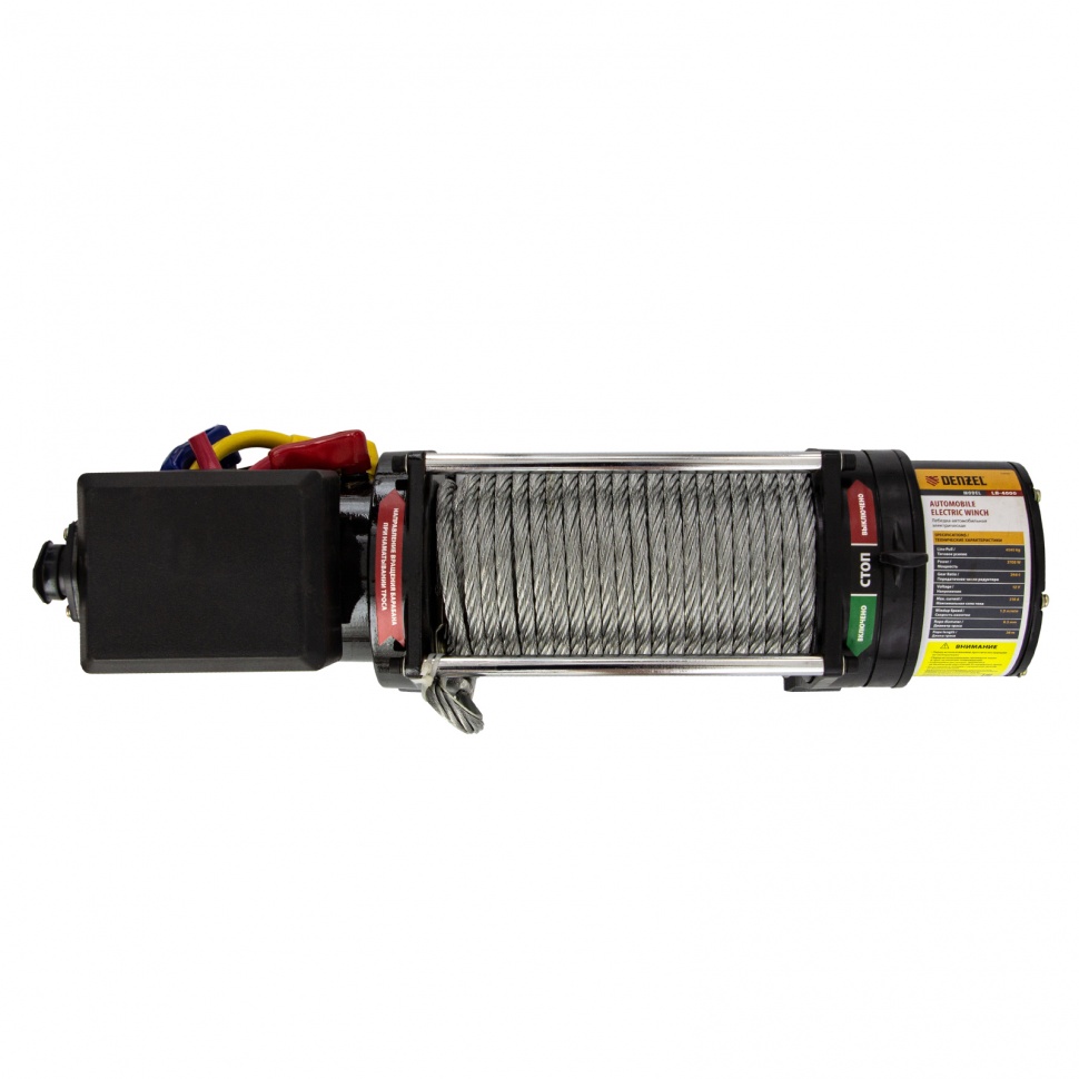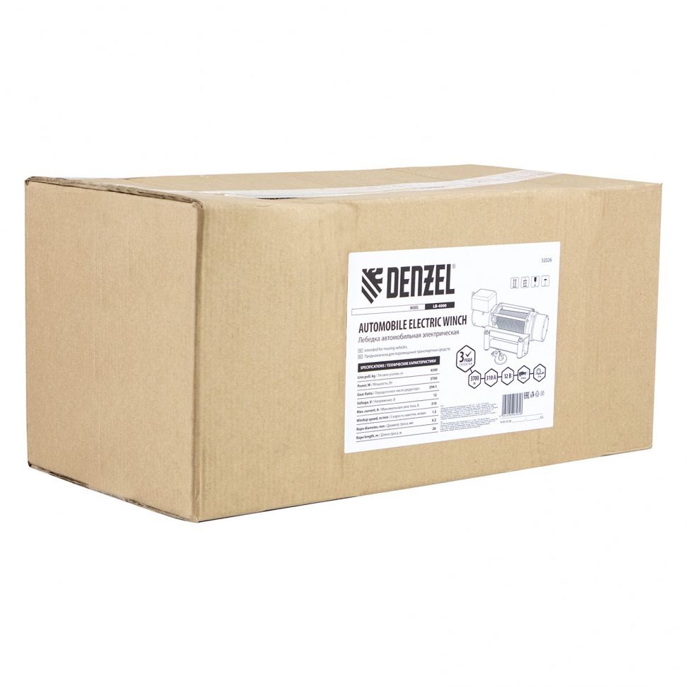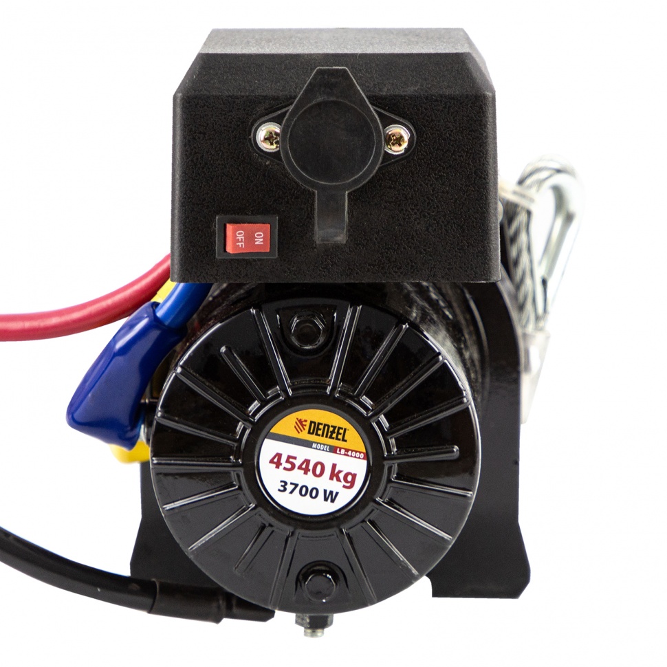 Лебедка Denzel LB-4000 52026 мощностью 3,7 кВт и скоростью намотки троса 1,5 м/мин используется для перемещения грузов в горизонтальной плоскости, а также эвакуации и вытягивания из водоемов и кюветов транспортных средств весом до 4,5 т, например, квадроциклов, легких внедорожников, сельхозтехники. Лебедка устанавливается непосредственно на бампере, раме или кузове, проста в применении и не требует специальной подготовки.ПреимуществаБезопасная эксплуатация — тормозной механизм не допускает самопроизвольного разматывания троса.Крепкое сцепление — зацепной крюк с защитной скобой надежно фиксирует груз без риска его соскальзывания.Удобное управление на расстоянии — в комплект поставки входит выносной пульт с кабелем, устойчивым к излому.Прочность — стальной трос диаметром 9,2 мм отличается малым коэффициентом растяжения, а благодаря плотному плетению не рвется под нагрузкой.Высокий ресурс — долгий срок службы устройства обеспечивают надежные комплектующие и высокое качество сборки.Увеличенная рабочая зона — длина троса 28 м позволяет работать на большом расстоянии.Простая подготовка к работе — лебедка подключается к прикуривателю 12 В или напрямую к аккумулятору автомобиля.Удобная транспортировка — на корпусе предусмотрена жесткая ручка.Гарантия 3 года — качество лебедки подтверждено производителем.