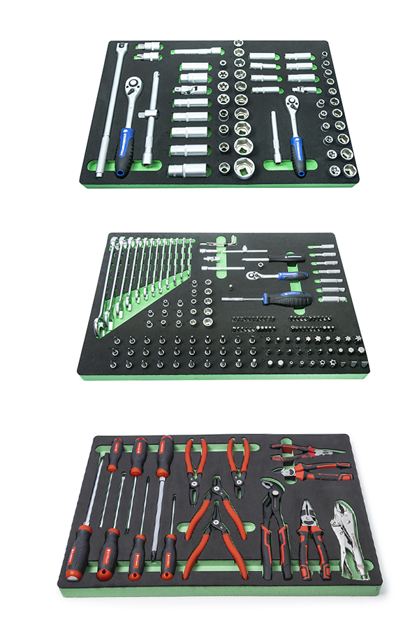 Данный комплект можно назвать как стартовый так как включает в себя ручной инструмент с посадочным квадратом 1/4, 3/8 и 1/2 дюйма, большое количество и разновидности бит, отвертки, губцевый инструмент и съемники стопорных колец, что вполне достаточно для выполнения довольно широкого спектра проводимых работ.