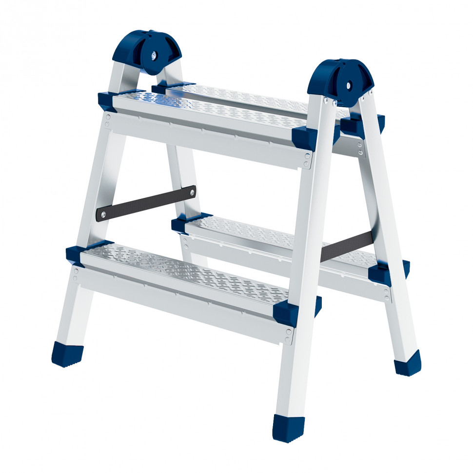 Стремянка двухсторонняя Сибртех 97982 со стальным профилем и 2 стальными ступенями помогает решать бытовые задачи на высоте, превышающей человеческий рост. Ее используют, чтобы доставать предметы с антресолей или шкафов, проводить уборку, менять лампочки, вешать полки или картины. Работать с электроинструментом на ней не рекомендуется. Стремянка с пластиковым складным механизмом повышенной стабильности и широким основанием очень устойчива на ровной поверхности. Площадка находится на высоте 44 см от опорной поверхности, рабочая высота стремянки составляет 244 см (при среднем росте пользователя 170 см).ПреимуществаНадежность — стремянка из стального профиля с широкими ступенями выдерживает вес до 120 кг, страховочные ленты из полиэстера повышают устойчивость.Безопасность пользователя — на рифленых широких ступенях ступни не скользят, на углах имеются пластиковые наконечники для защиты от травм.Защита напольного покрытия — благодаря специальным вставкам ножки не скользят и не оставляют царапин.Удобная транспортировка — стремянка весом 2,6 кг легко складывается, ее размеры в сложенном состоянии 500 х 410 х 160 мм.