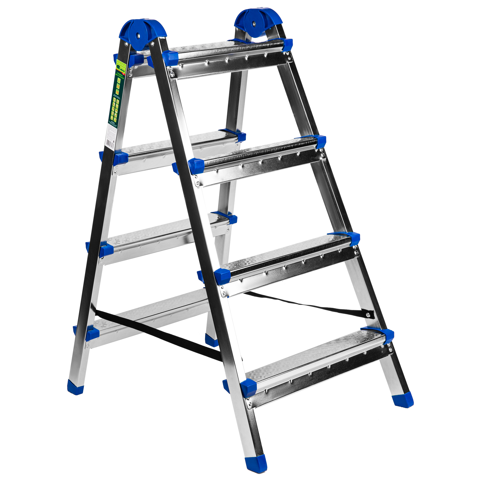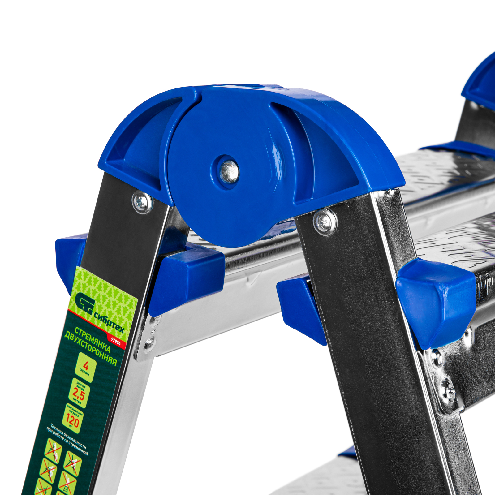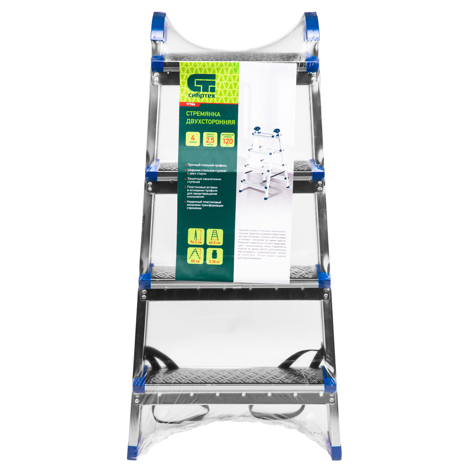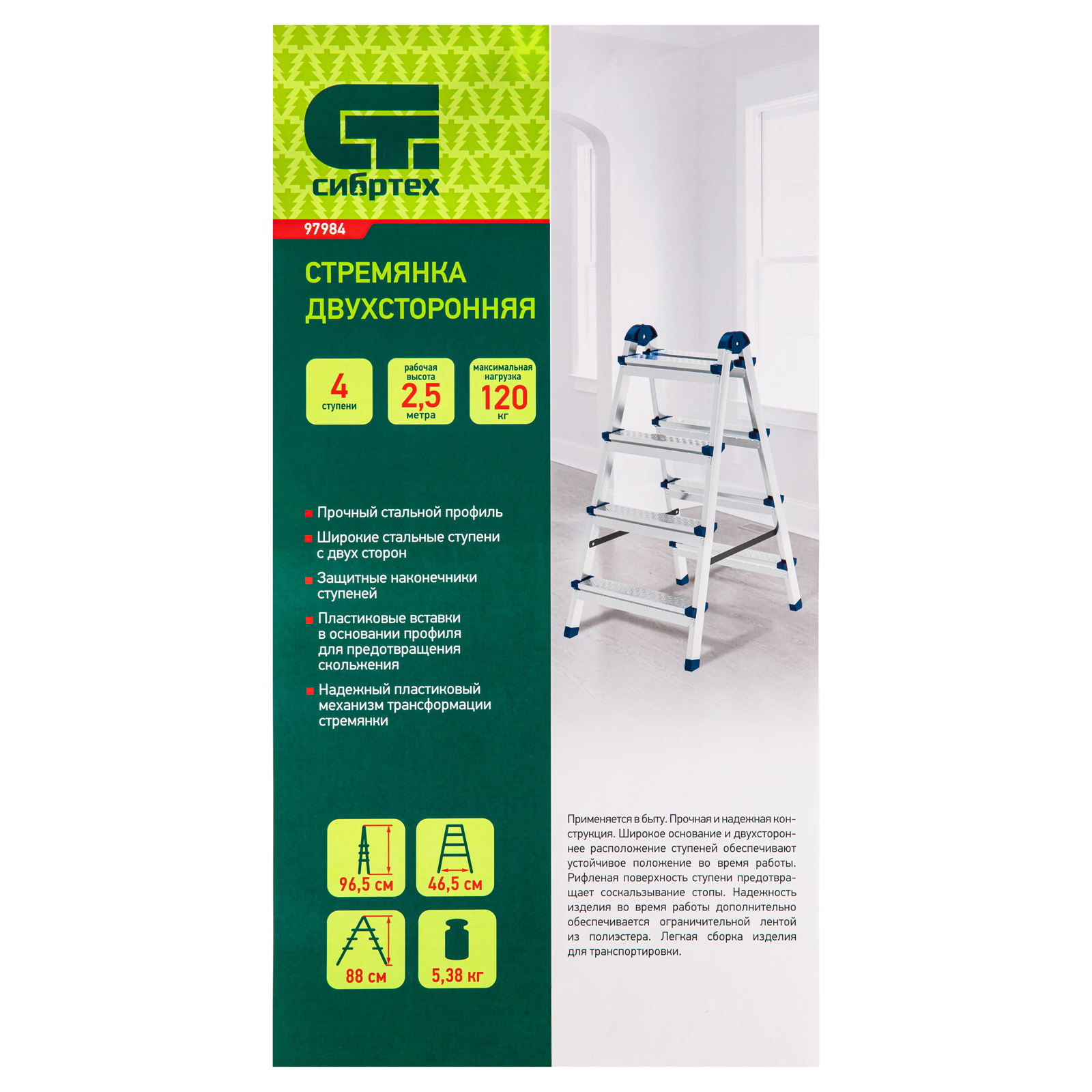 Стремянка двухсторонняя Сибртех 97984 со стальным профилем и 4 стальными ступенями помогает решать бытовые задачи на высоте, превышающей человеческий рост. Ее используют, чтобы доставать предметы с антресолей или шкафов, проводить уборку, менять лампочки, вешать полки или картины. Работать с электроинструментом на ней не рекомендуется. Стремянка с пластиковым складным механизмом повышенной стабильности и широким основанием очень устойчива на ровной поверхности. Площадка находится на высоте 88 см от опорной поверхности, рабочая высота стремянки составляет 288 см (при среднем росте пользователя 170 см).ПреимуществаНадежность — стремянка из стального профиля с широкими ступенями выдерживает вес до 120 кг, страховочные ленты из полиэстера повышают устойчивость.Безопасность пользователя — на рифленых широких ступенях ступни не скользят, на углах имеются пластиковые наконечники для защиты от травм.Защита напольного покрытия — благодаря специальным вставкам ножки не скользят и не оставляют царапин.Удобная транспортировка — стремянка весом 5,5 кг легко складывается, ее размеры в сложенном состоянии 965 х 465 х 160 мм.