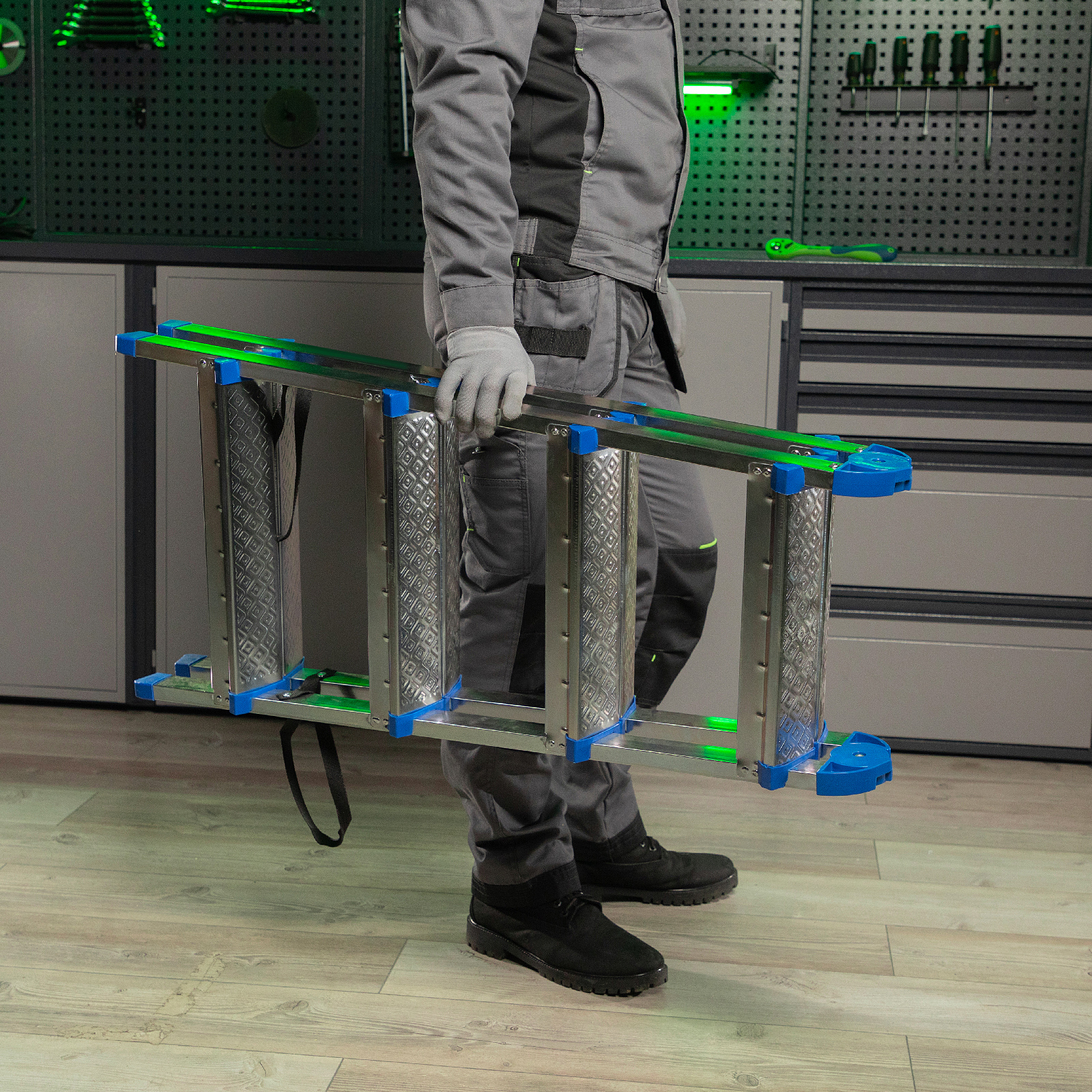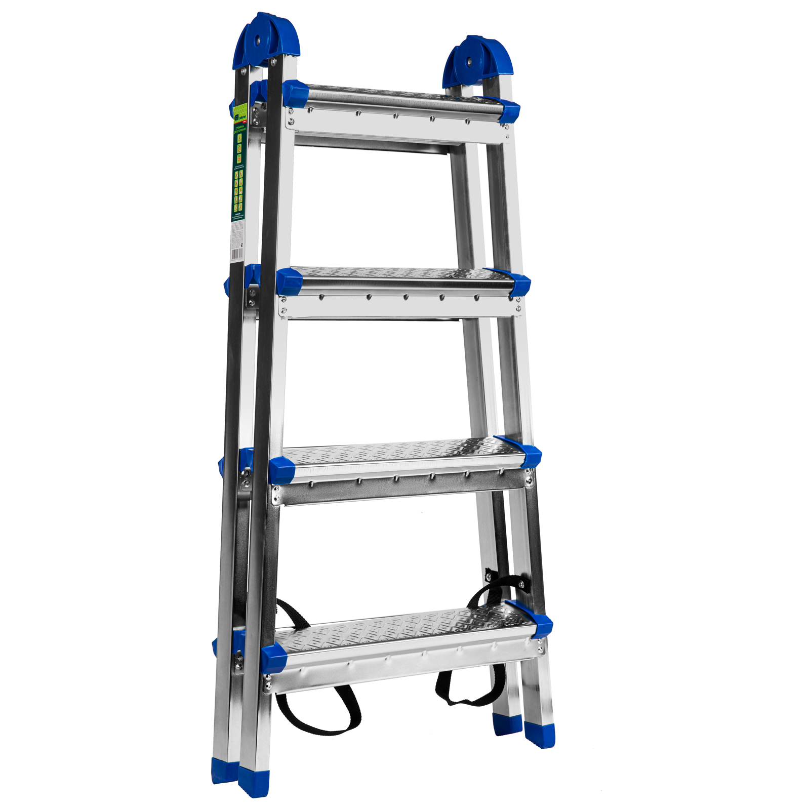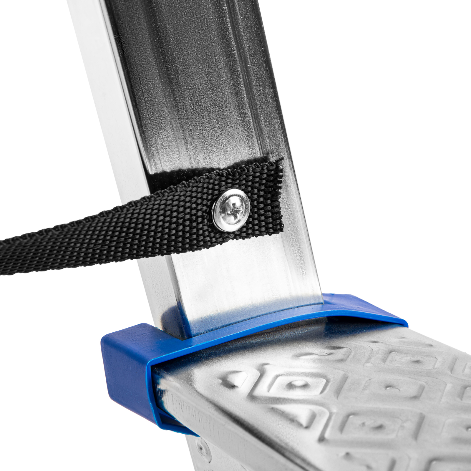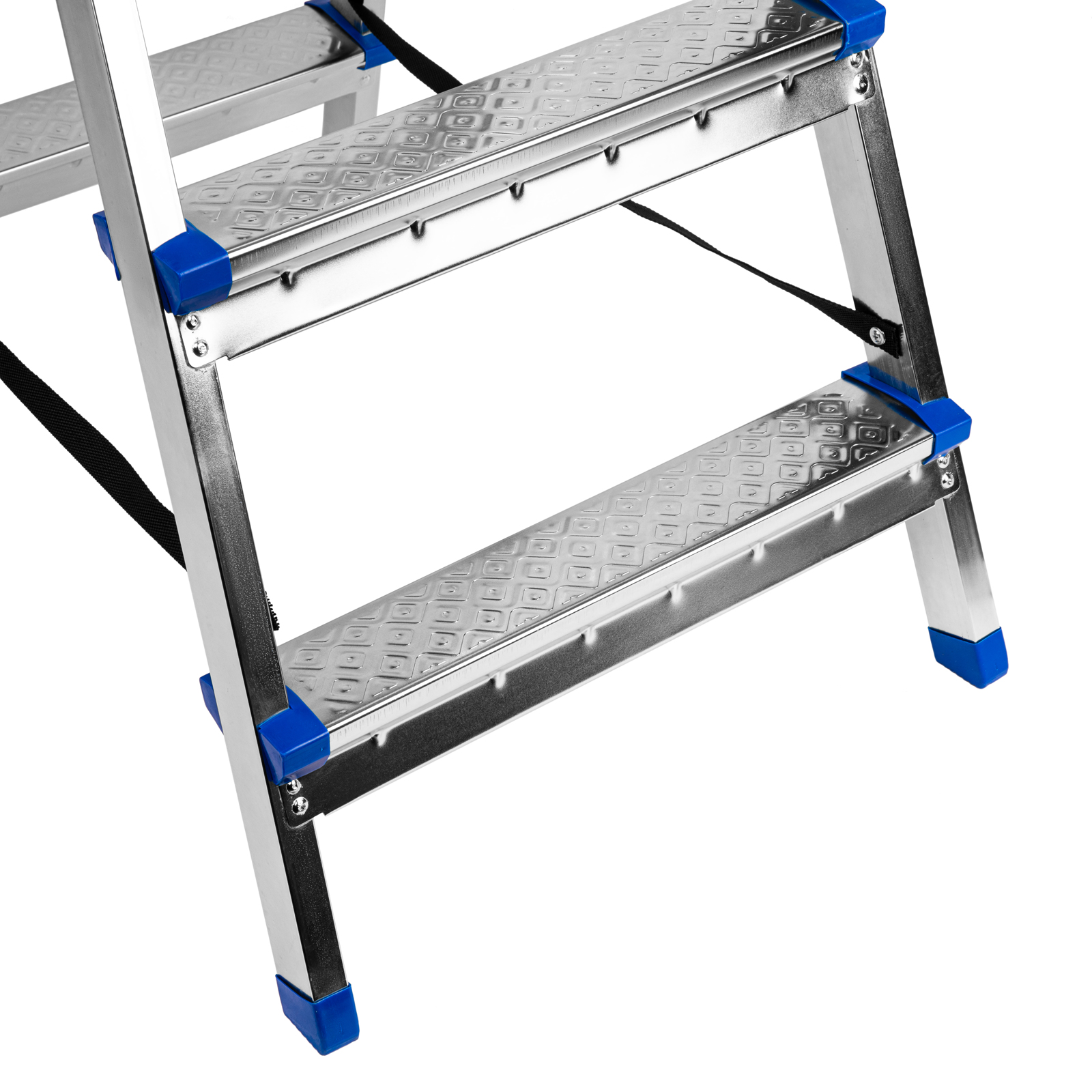 Стремянка двухсторонняя Сибртех 97984 со стальным профилем и 4 стальными ступенями помогает решать бытовые задачи на высоте, превышающей человеческий рост. Ее используют, чтобы доставать предметы с антресолей или шкафов, проводить уборку, менять лампочки, вешать полки или картины. Работать с электроинструментом на ней не рекомендуется. Стремянка с пластиковым складным механизмом повышенной стабильности и широким основанием очень устойчива на ровной поверхности. Площадка находится на высоте 88 см от опорной поверхности, рабочая высота стремянки составляет 288 см (при среднем росте пользователя 170 см).ПреимуществаНадежность — стремянка из стального профиля с широкими ступенями выдерживает вес до 120 кг, страховочные ленты из полиэстера повышают устойчивость.Безопасность пользователя — на рифленых широких ступенях ступни не скользят, на углах имеются пластиковые наконечники для защиты от травм.Защита напольного покрытия — благодаря специальным вставкам ножки не скользят и не оставляют царапин.Удобная транспортировка — стремянка весом 5,5 кг легко складывается, ее размеры в сложенном состоянии 965 х 465 х 160 мм.