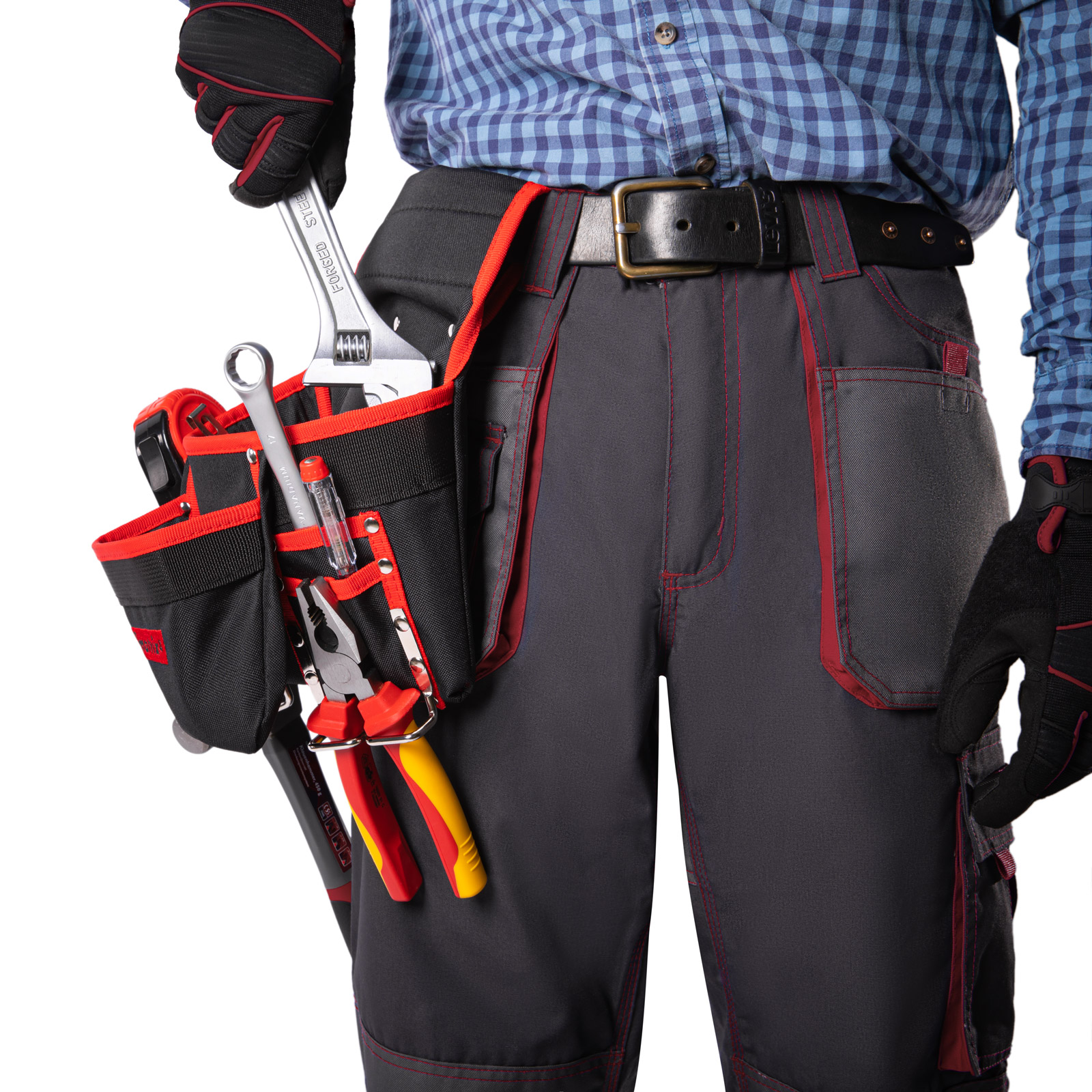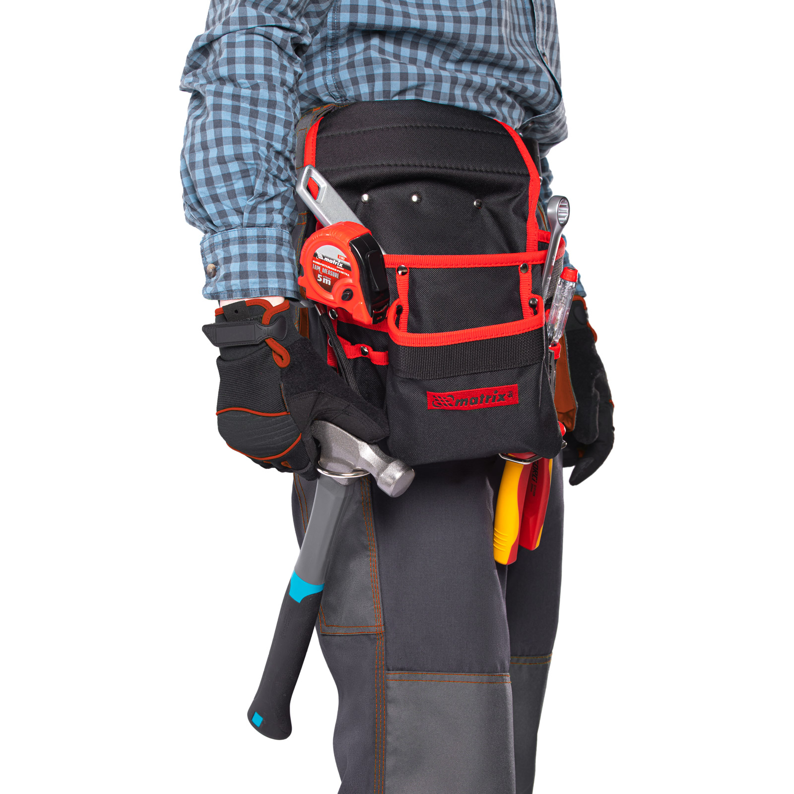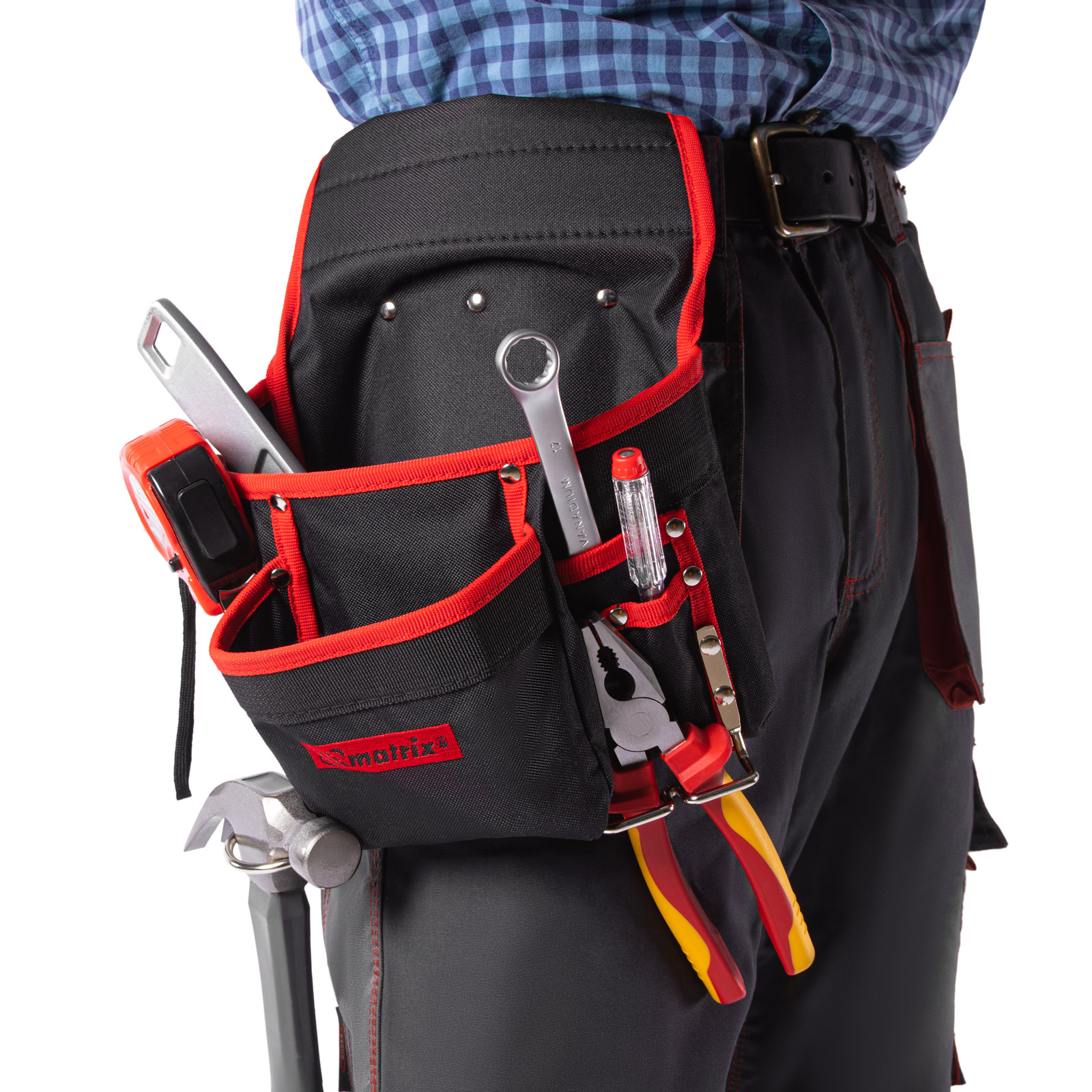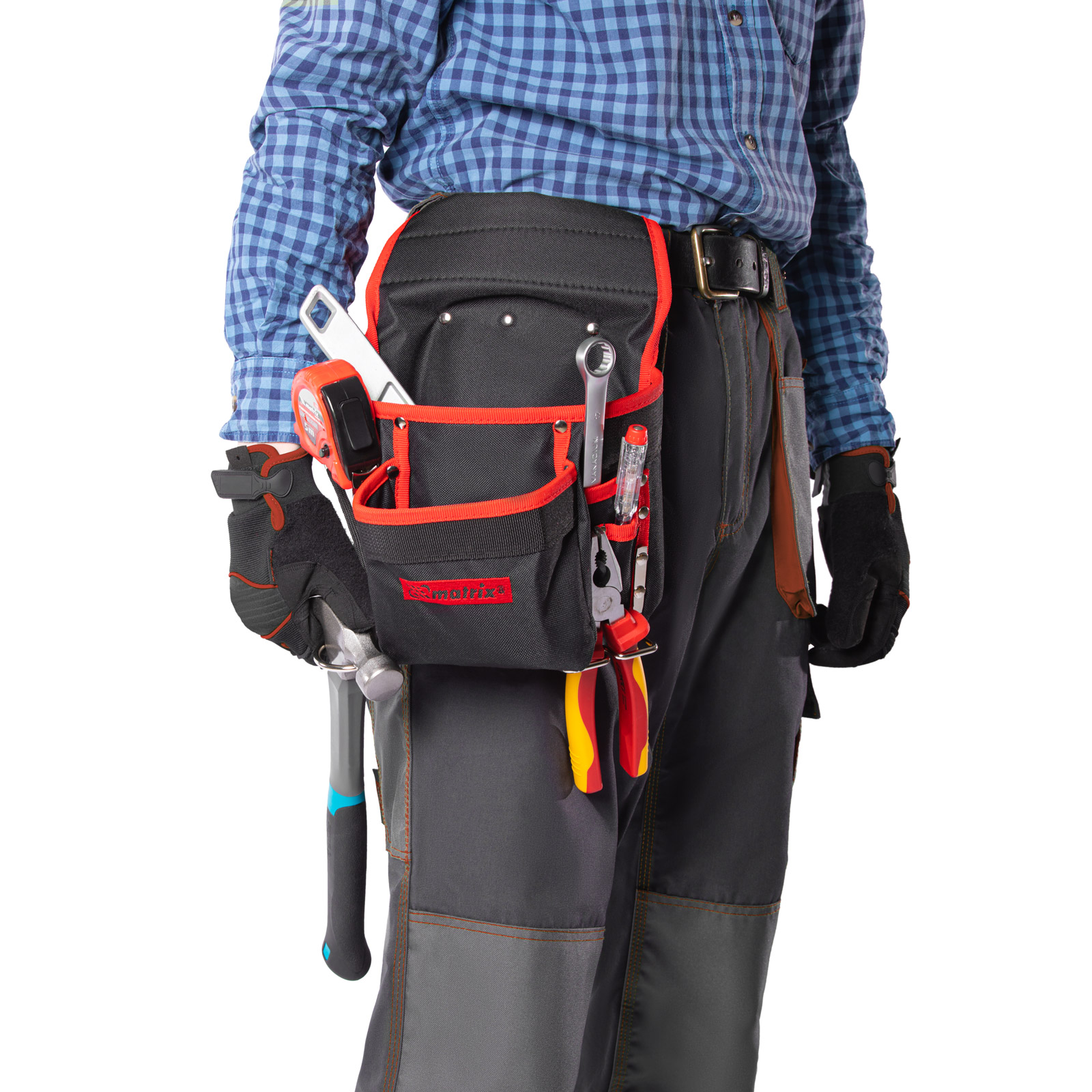 Поясной подсумок Matrix 90242 с 8 карманами и держателями для молотка и клещей используется для переноски инструментов. Крепится на ремень и позволяет иметь под рукой все необходимое, что особенно важно во время работы на высоте. Будет полезен для проведения монтажных, ремонтных и отделочных работ.ПреимуществаВысокая износостойкость — подсумок изготовлен из плотного синтетического материала.Функциональность — в 8 карманах разного размера можно разместить отвертки, шарнирно-губцевый и другой инструмент, а также детали и крепеж.Быстрый доступ к молотку и клещам — металлические держатели для них закреплены снаружи подсумка.