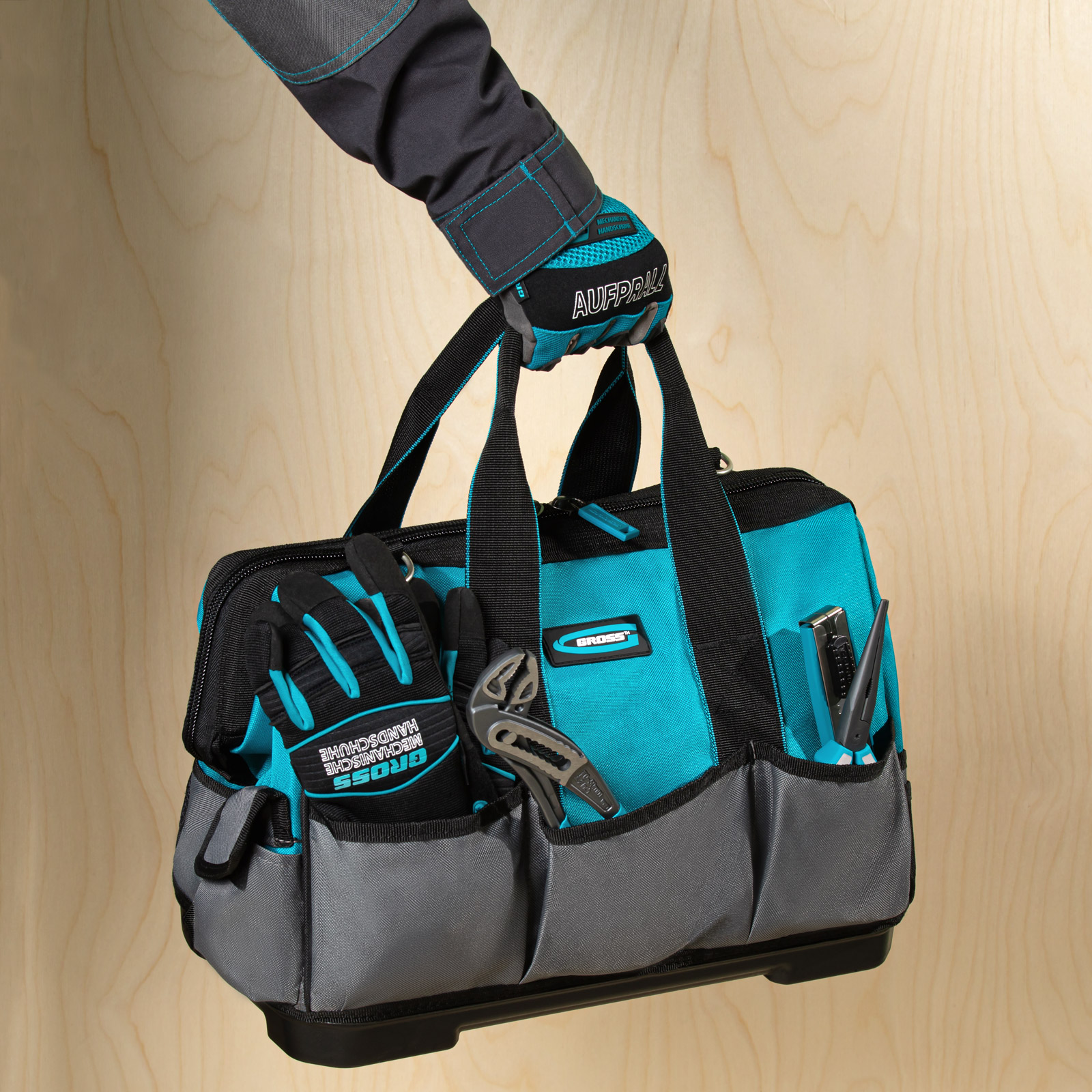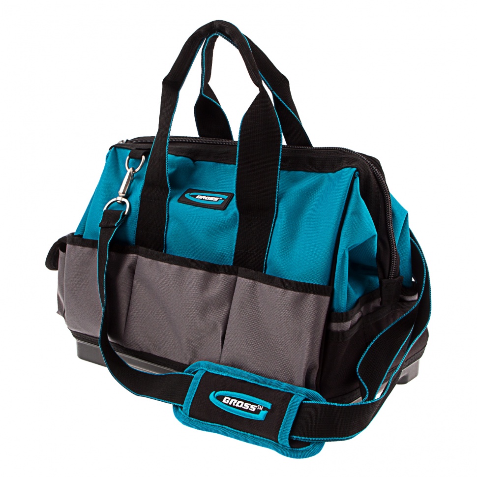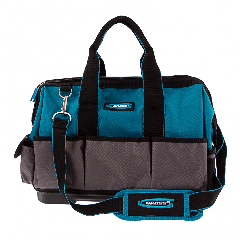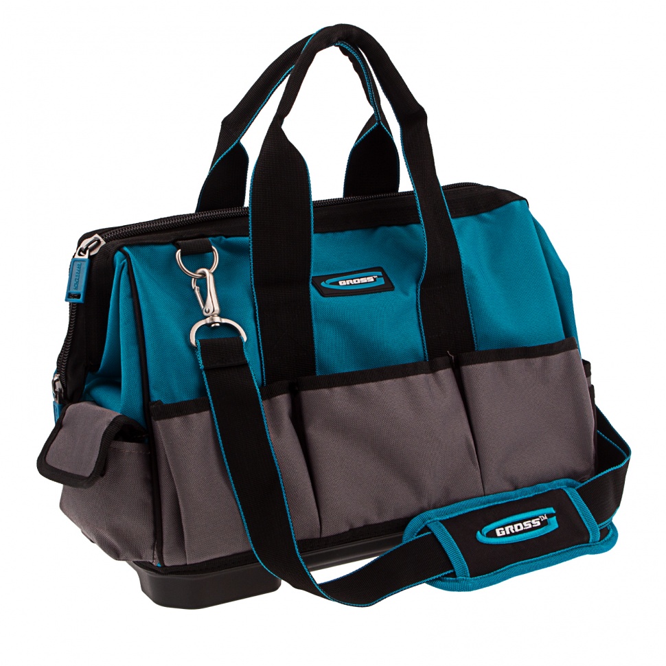 Сумка для инструмента Gross Handwerker 90272 размером 400 х 225 х 310 мм, с 26 карманами, пластиковым дном и наплечным ремнем, будет полезна слесарям, монтажникам, электрикам, а также автомобилистам. В основном отделении, внутренних и внешних карманах поместятся все необходимые инструменты.ПреимуществаИзносостойкость — сумка изготовлена из прочного полиэстера.Надежность — жесткое пластиковое дно выдерживает значительные нагрузки.Удобное перемещение — сумка комплектуется плечевым ремнем с карабинами повышенной прочности.