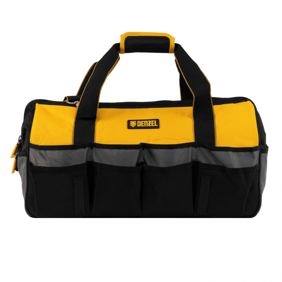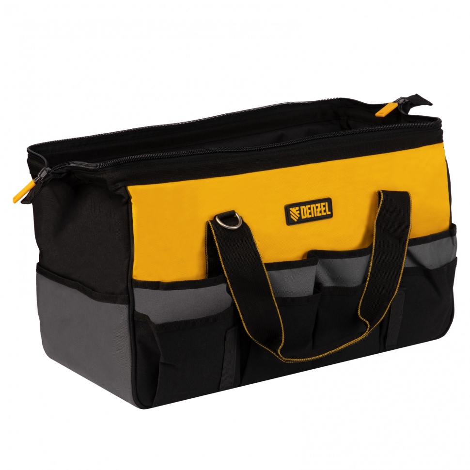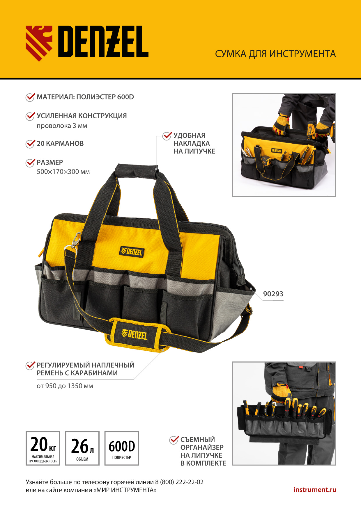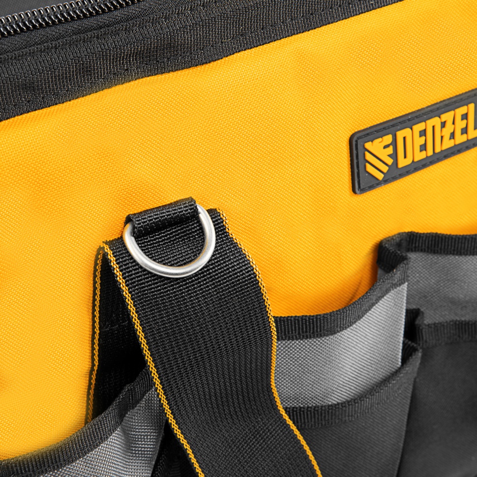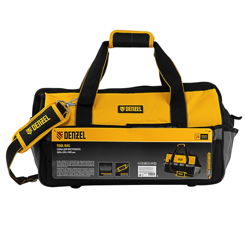 Сумка Denzel 90293 габаритами 500 х 245 х 300 мм с 20 карманами (в том числе съемным органайзером на 10 карманов) и наплечным ремнем, вмещает большое количество инструментов и используется для их хранения и транспортировки. Пригодится монтажнику, сантехнику, мастеру на выезде и автовладельцу.ПреимуществаИзносостойкость — сумка изготовлена из прочного материала, не рвется и не протирается.Съемный органайзер — можно упорядочить хранение крепежей, мелких деталей и аксессуаров.Комфортная транспортировка — сумку удобно носить не только в руке, но и на плече — ремень с усиленными карабинами выдерживает большой вес.