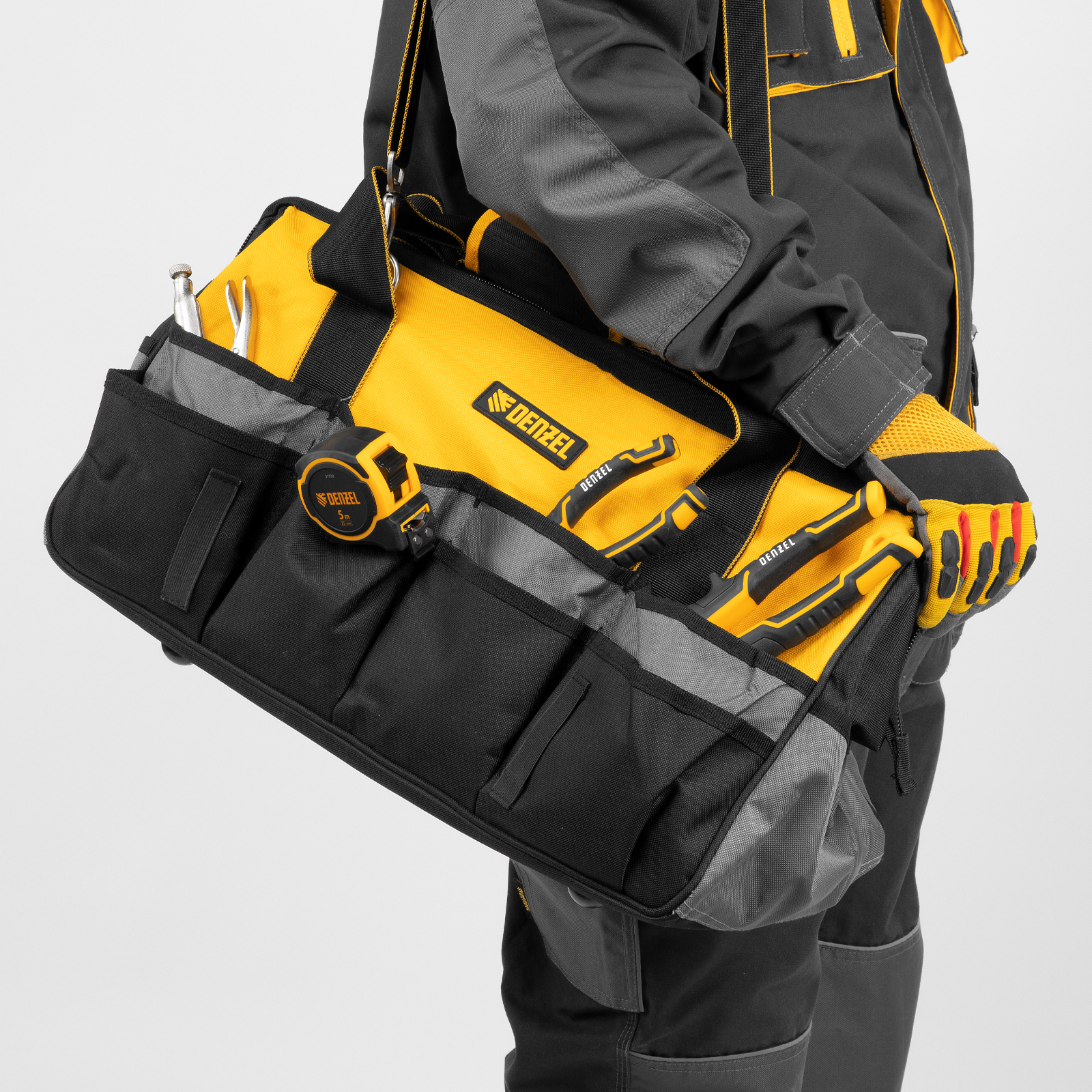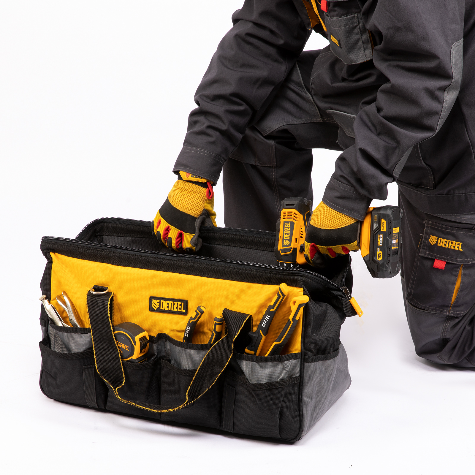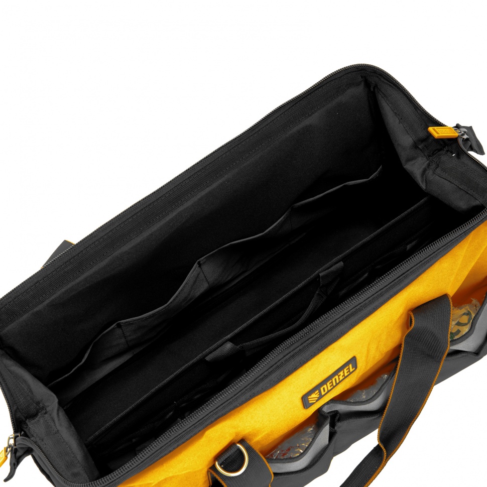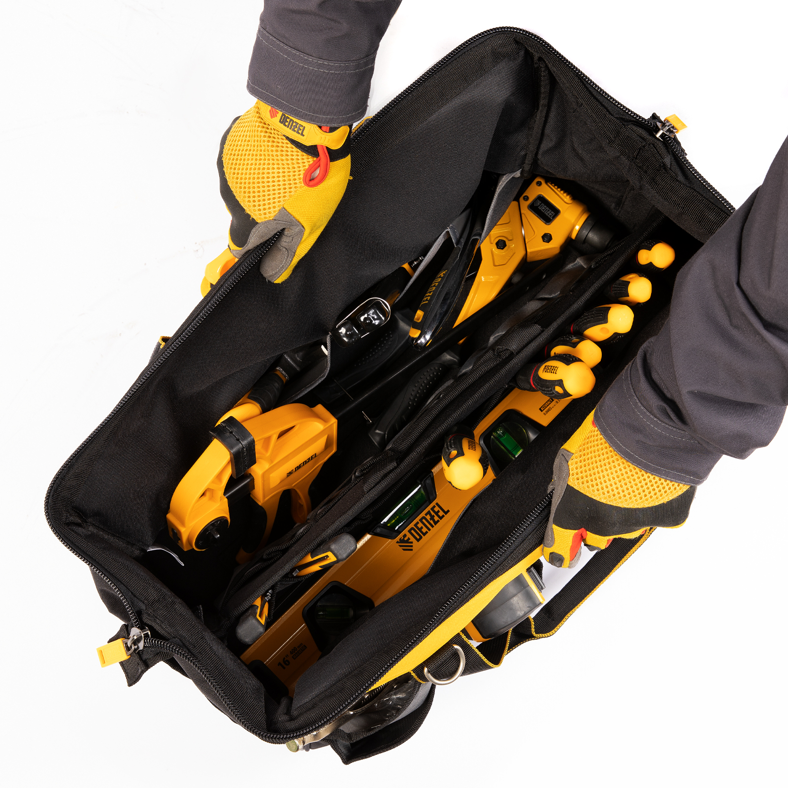 Сумка Denzel 90293 габаритами 500 х 245 х 300 мм с 20 карманами (в том числе съемным органайзером на 10 карманов) и наплечным ремнем, вмещает большое количество инструментов и используется для их хранения и транспортировки. Пригодится монтажнику, сантехнику, мастеру на выезде и автовладельцу.ПреимуществаИзносостойкость — сумка изготовлена из прочного материала, не рвется и не протирается.Съемный органайзер — можно упорядочить хранение крепежей, мелких деталей и аксессуаров.Комфортная транспортировка — сумку удобно носить не только в руке, но и на плече — ремень с усиленными карабинами выдерживает большой вес.