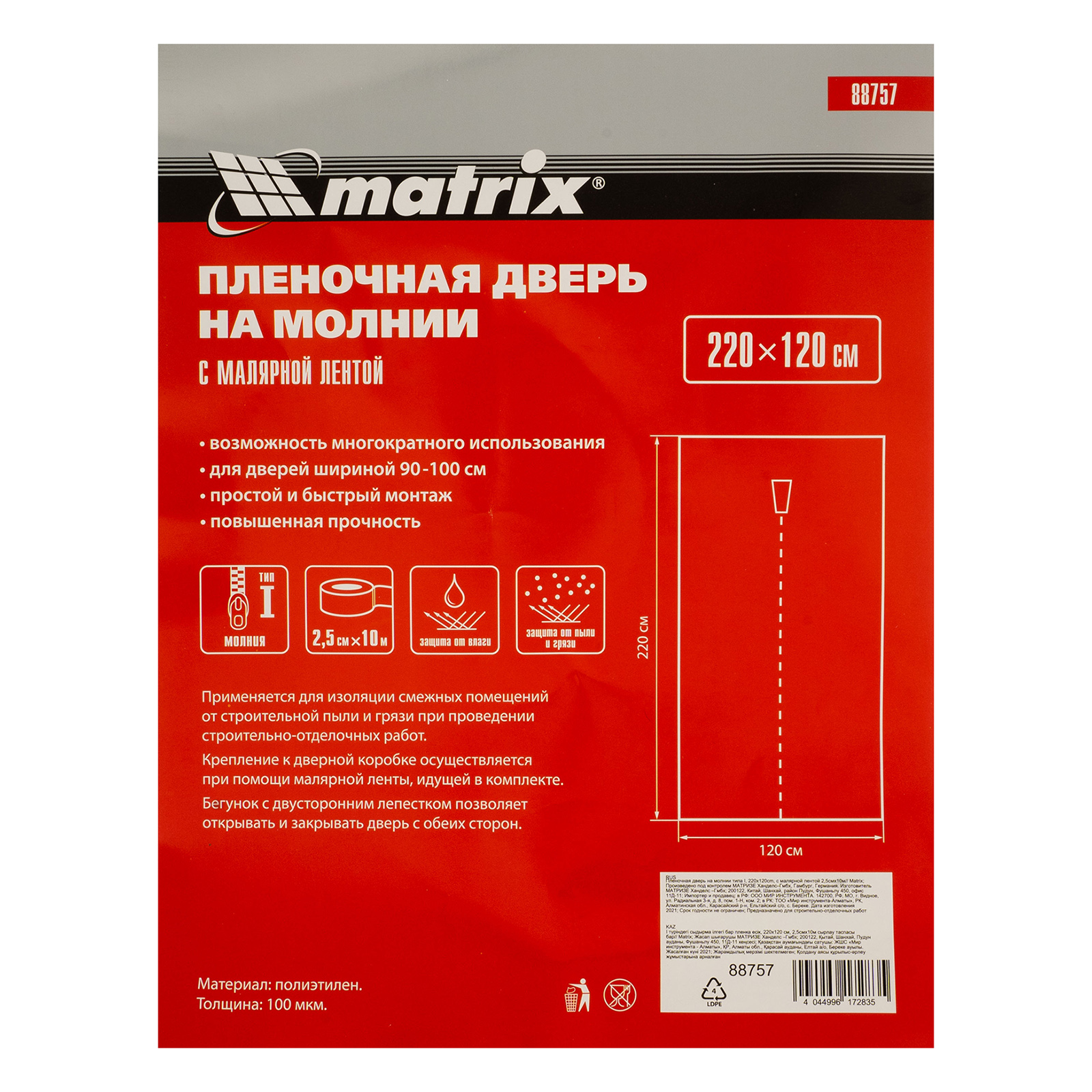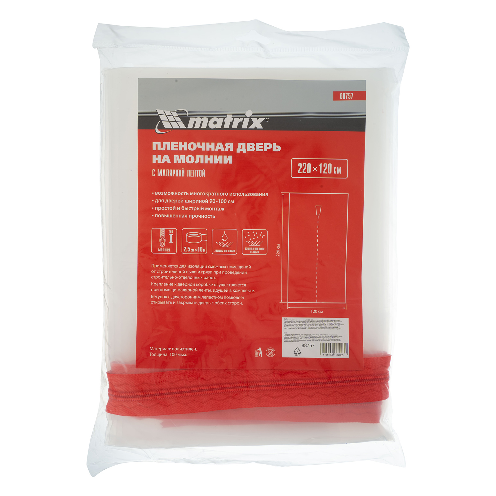 Пленочная дверь на молнии типа I Matrix 88757 размером 220 х 120 см, с малярной лентой 2,5 см х 10 м, используется во время отделки помещений. Позволяет уберечь дверь от загрязнений, попадания стружки, химических веществ при проведении ремонтных, покрасочных, облицовочных работ. Подходит для защиты дверных проемов шириной 90-100 см.ПреимуществаПростая установка — в комплект входит малярная лента, которая легко наклеивается на любые поверхности и не оставляет следов.Удобная эксплуатация — благодаря бегунку с двусторонним лепестком молния легко открывается и закрывается с обеих сторон.Быстрая фиксация в открытом положении — на двери предусмотрены липучки.Надежная защита — пленка не пропускает влагу и устойчива к воздействию химических веществ, в т.ч. растворителей.Долговечность — изделие из полиэтилена повышенной прочности с надежно пришитой молнией выдерживает многократное использование.