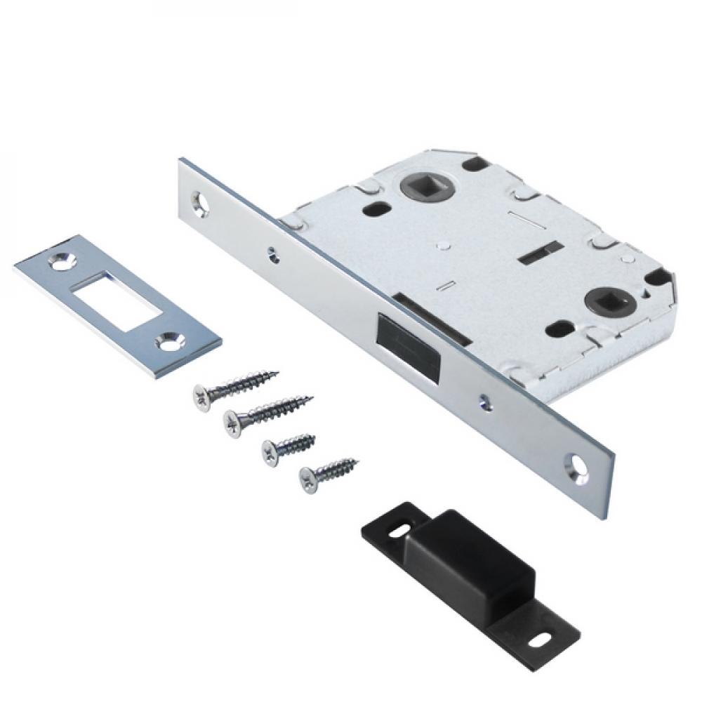 Универсальная магнитная защёлка врезная для установки на деревянные межкомнатные двери. Материал - сталь, магнит, гальваническое покрытие.Под ручку с квадратом 8 мм и сантехническую завертку с квадратом 6 мм. Удаление ключевого отверстия - 50 мм. Межосевое расстояние - 70 мм. Прямоугольная торцевая планка. Ширина планки - 20мм. Габариты корпуса - 97х75х12 мм. В комплекте - защелка, саморезы, ответная планка.