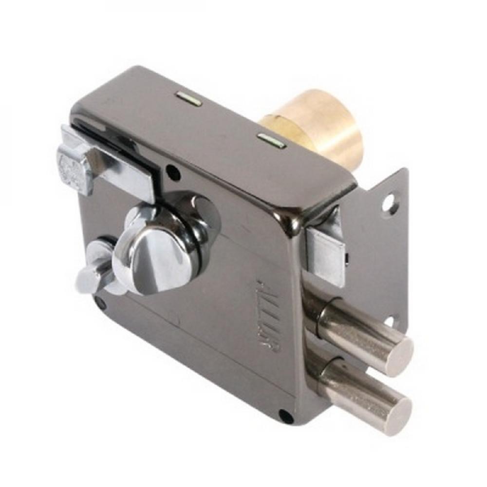 Замок накладной цилиндровый с вертушкой, фиксатором и защелкой. Предназначен для установки на деревянные двери. Засов из двух цилиндрических ригелей диаметром 12 мм, с максимальным вылетом 22 мм. Удаление ключевого отверстия - 50 мм. Габариты замка - 86х77х25 мм. Комплектация - 6 ключей, запорная планка, накладка. Механизм замка под англ.ключ, идет совместно с корпусом. Закрывание и открывание замка изнутри производится вертушкой, снаружи ключом.