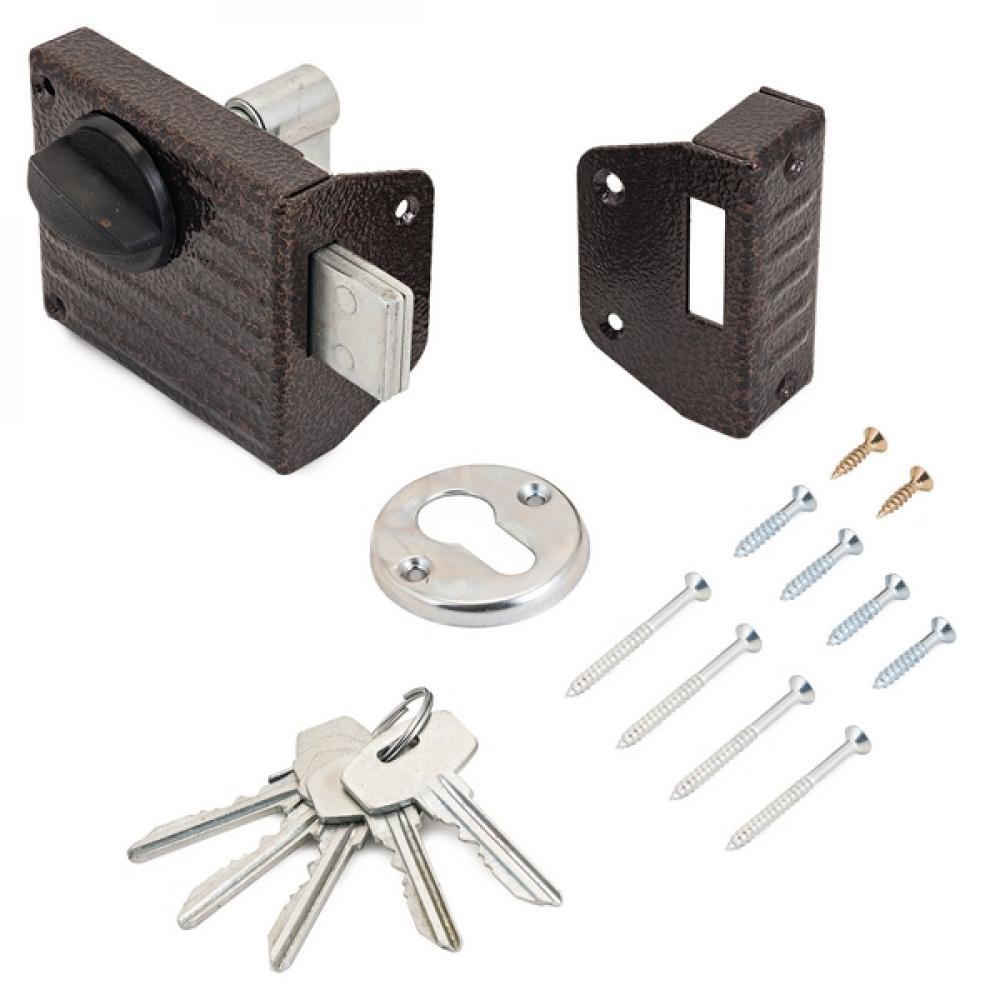 Замок накладной цилиндровый с вертушкой. Предназначен для установки на деревянные двери. Засов прямоугольного сечения размерами 9х28, с максимальным вылетом 25 мм. Удаление ключевого отверстия - 55 мм. Габариты замка - 90,5х78х21 мм. Комплектация - 4 ключа, запорная планка, накладка. Закрывание и открывание замка изнутри производится ручкой, снаружи ключом