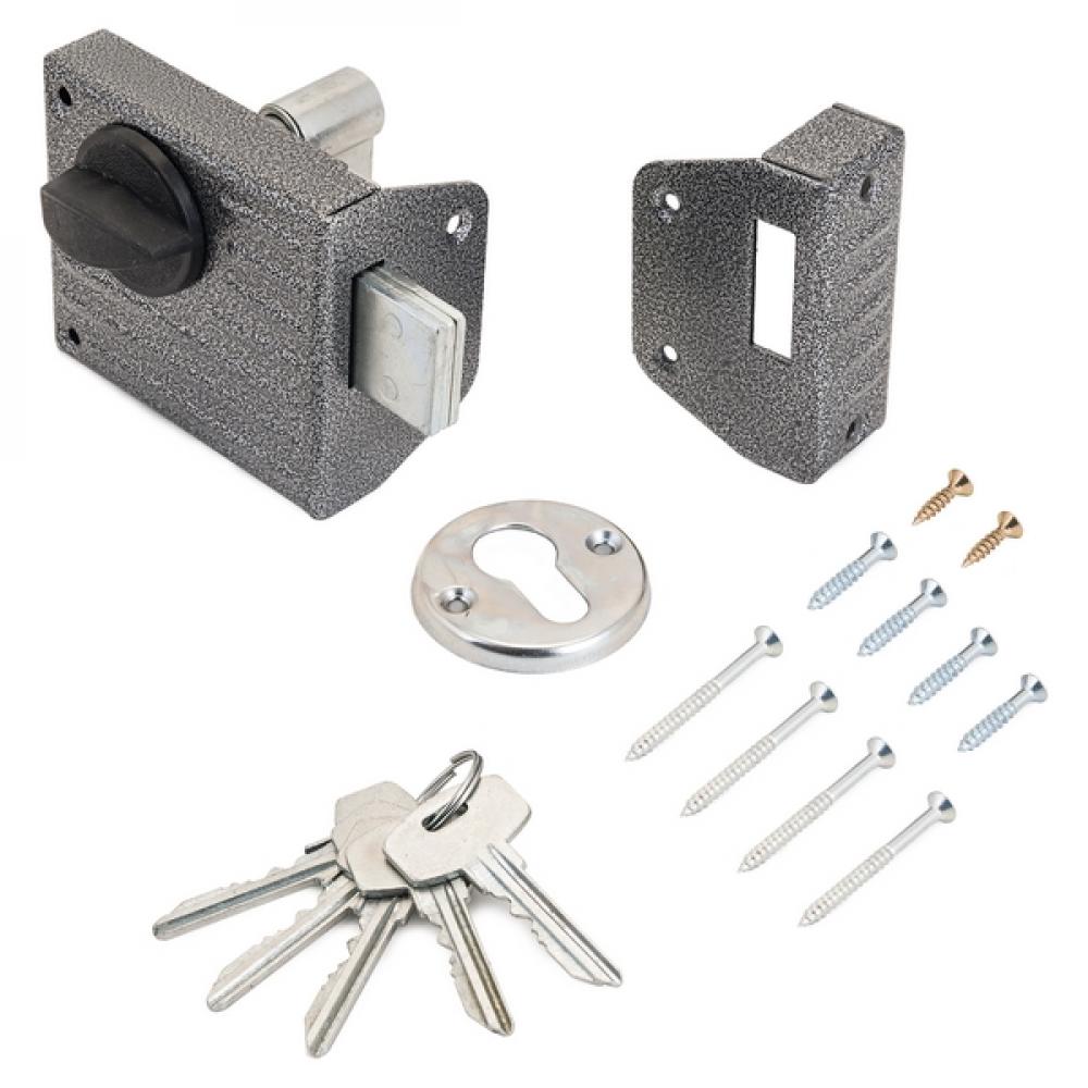 Замок накладной цилиндровый с вертушкой. Предназначен для установки на деревянные двери. Засов прямоугольного сечения размерами 9х28, с максимальным вылетом 25 мм. Удаление ключевого отверстия - 55 мм. Габариты замка - 90,5х78х21 мм. Комплектация - 4 ключа, запорная планка, накладка. Закрывание и открывание замка изнутри производится ручкой, снаружи ключом