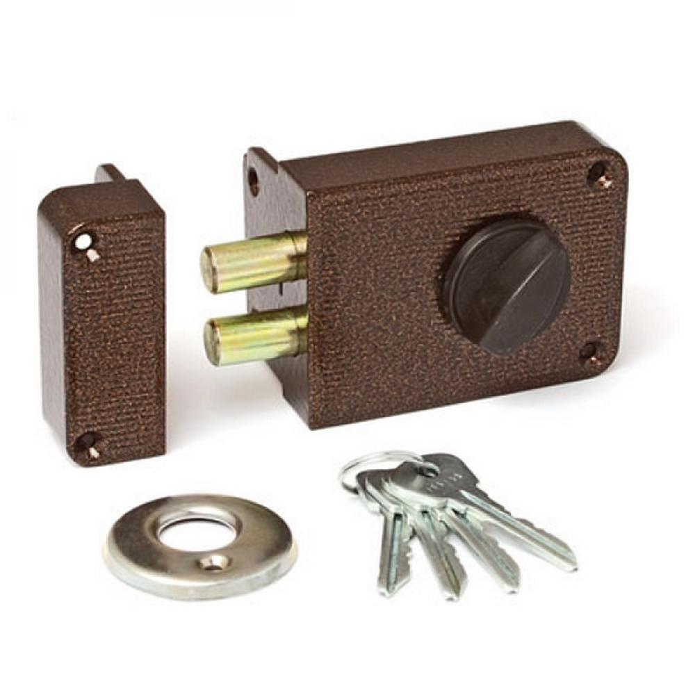 Замок накладной ЗН 1-3 предназначен для деревянных и металлических дверей. Корпус замка выполнен из цинкового сплава, ригели из стали. Имеется блокировка открывания двери ключом снаружи. Изнутри замок запирается ручкой. 2 класс секрета. Количество секретных комбинаций: 15 000. Два ригеля диаметром 14 мм. Цвет: Медь. Комплектация: замок, цилиндровый механизм МЦ-1, 4 английских ключа, ответная планка, 1 накладка, крепежная фурнитура.