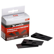 Пластиковые распорные клинья Matrix 88101, 20 штук в упаковке, используются для корректировки напольных покрытий при их укладке. Позволяют создать ровный зазор между ламинатом и стеной для предотвращения его последующей деформации. Благодаря клиньям напольное покрытие не сдвигается в процессе монтажа.ПреимуществаВысокое качество работ — пластиковые изделия не деформируются от воздействия влаги и плиточного клея.Продуманная форма — за счет ребер клинья надежно фиксируются и позволяют выбрать оптимальную величину зазора.Удобная комплектация — 20 штук достаточно для работы на небольшой площади.
