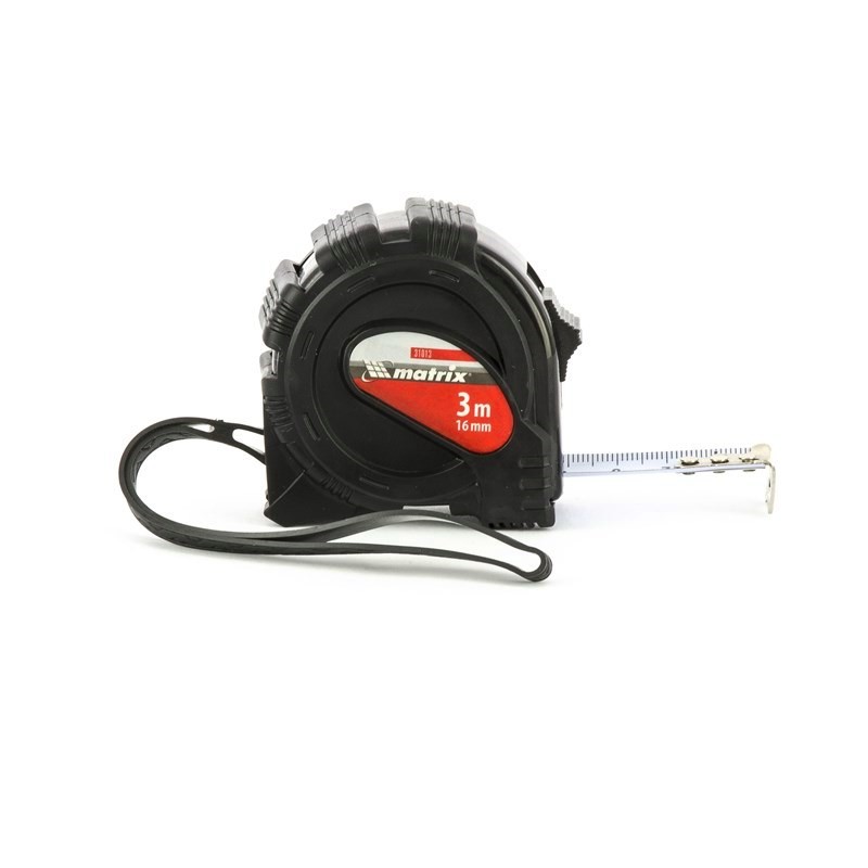 Рулетка Matrix Black 31013, 3 м х 16 мм, в обрезиненном корпусе, будет полезна как строителям, так и домашним мастерам. Используется для определения размеров и расстояний, имеет цену деления 1 мм и класс точности 2. Корпус инструмента защищен резиновым кожухом, что уменьшает риск поломки в случае падения или удара. Зацеп надежно закреплен на ленте тремя заклепками, поэтому он не отвалится даже после длительного использования.ПреимуществаКорпус рулетки устойчив к механическим повреждениям, т.к. изготовлен из ударопрочного ABS-пластика.Стальная лента защищена от царапин и истирания, поскольку на нее нанесено полимерное покрытие.Измерительное полотно фиксируется в вытянутом положении при помощи стопора.Если во время работы нужно освободить руки, инструмент можно закрепить на поясе при помощи металлической клипсы.Рулетку можно повесить на запястье за ремешок.