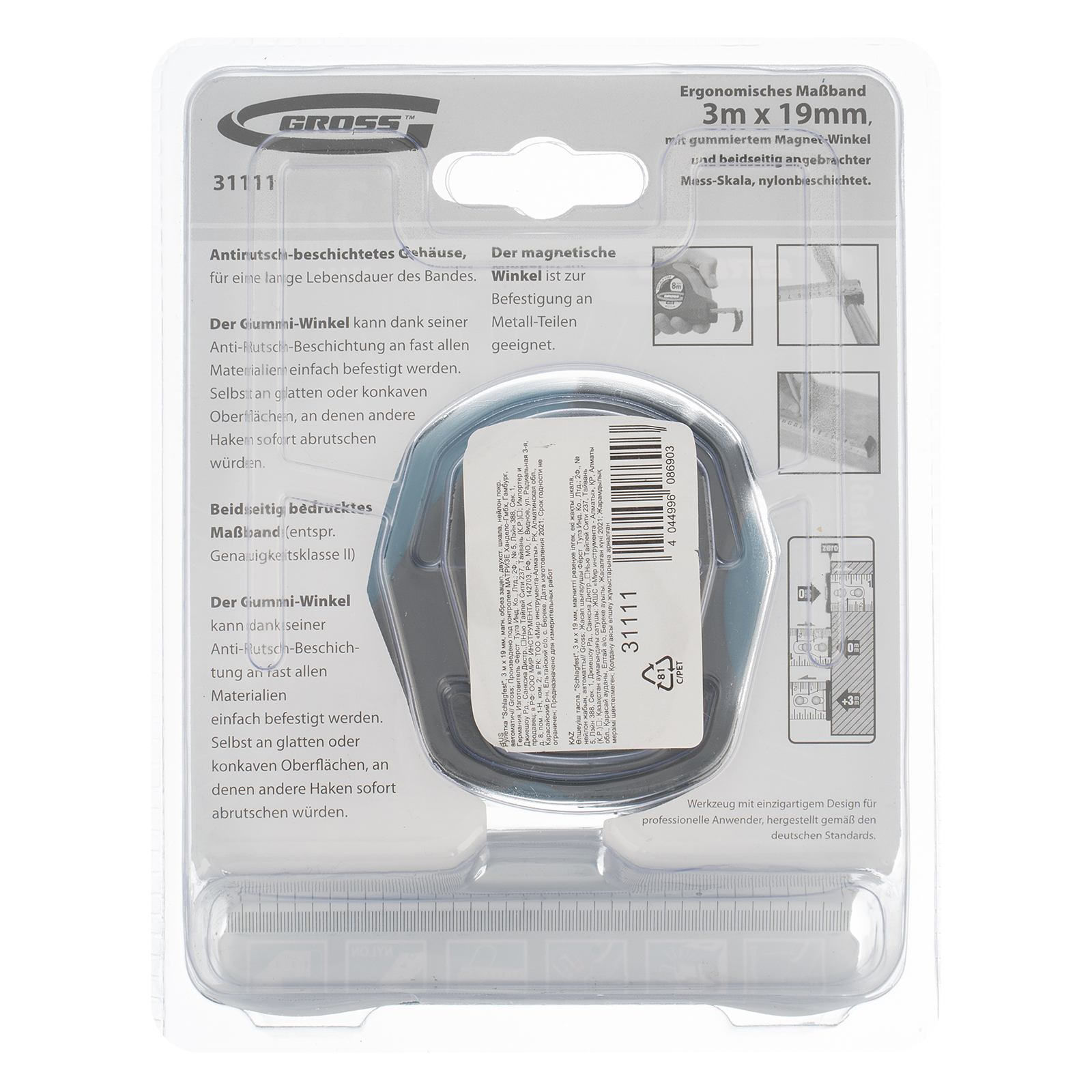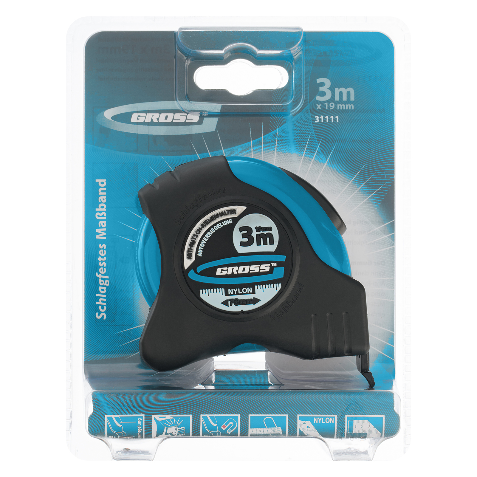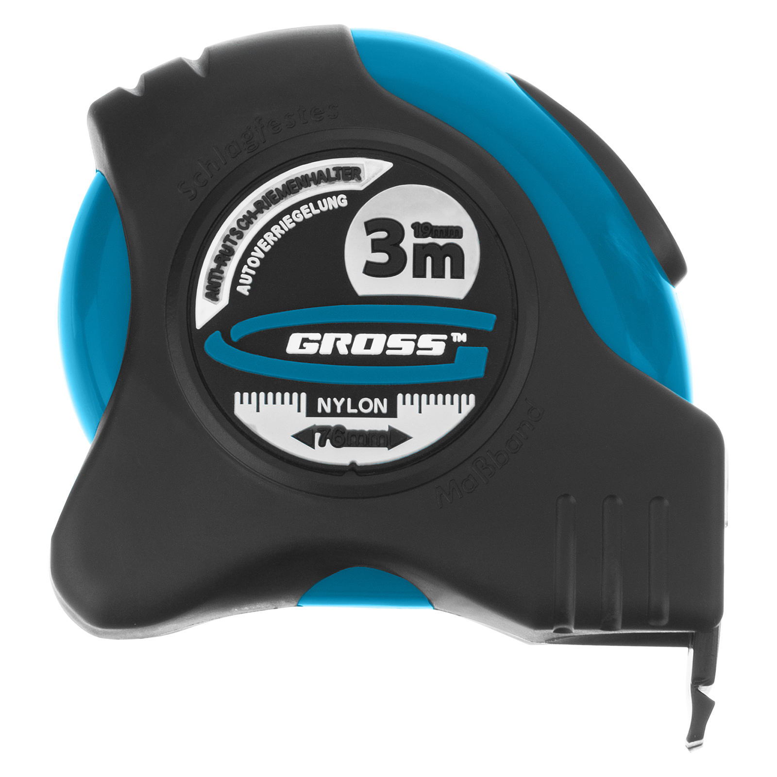Рулетка Gross «Schlagfest» 31111 с магнитным обрезиненным зацепом, двухсторонней шкалой и функцией автоматической фиксации полотна, 3 м х 19 мм, позволяет определять размеры материалов, вычислять площадь помещения и проводить другие измерительные работы Карманная рулетка — незаменимый инструмент в хозяйстве и на строительной площадке. Магнитный обрезиненный зацеп обеспечивает возможность захвата скользких и металлических поверхностей со сложной формой.ПреимуществаУдобство работы — измерительная шкала нанесена на ленту с обеих сторон.Автоматический фиксатор и дополнительная кнопка паузы — ленту легко удерживать на нужной длине.Ширина полотна 19 мм — замеры можно производить в труднодоступных местах.Высокая точность замеров от нуля — рулетка оснащена подвижным зацепом.Двухкомпонентный корпус — рулетка из ударопрочного ABS-пластика с обрезиненным покрытием выдерживает падения с небольшой высоты и не проскальзывает в руках.Защита полотна от истирания — на стальной ленте имеется нейлоновое покрытие.