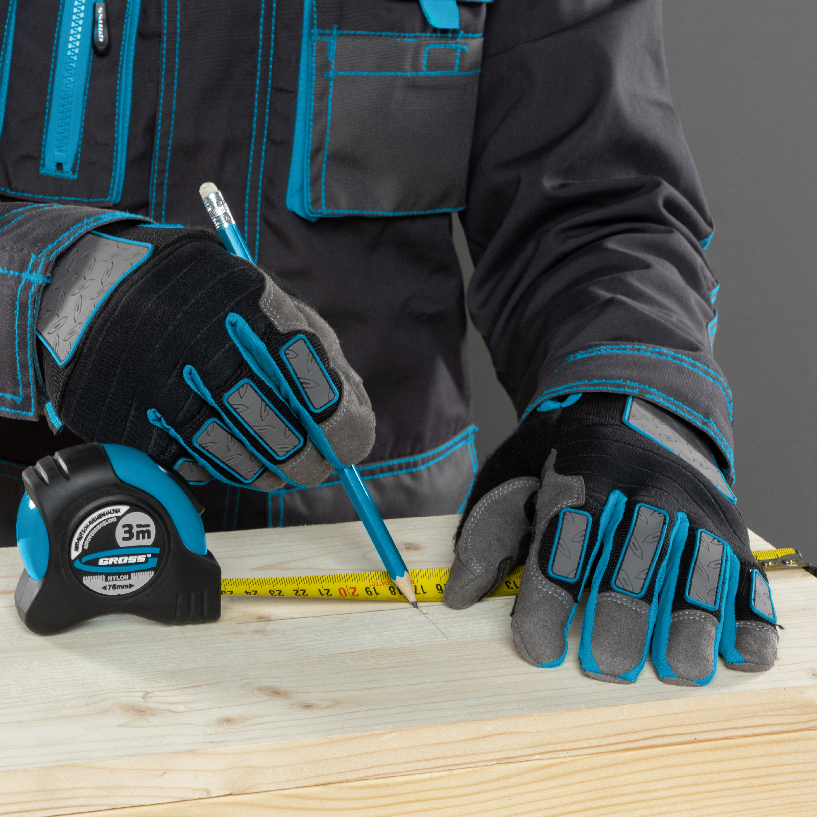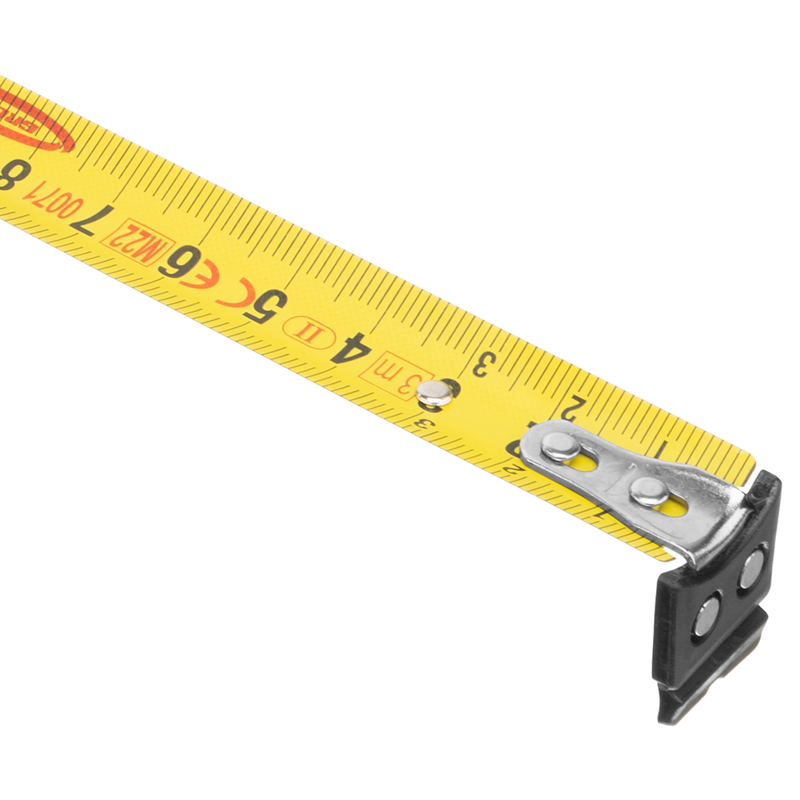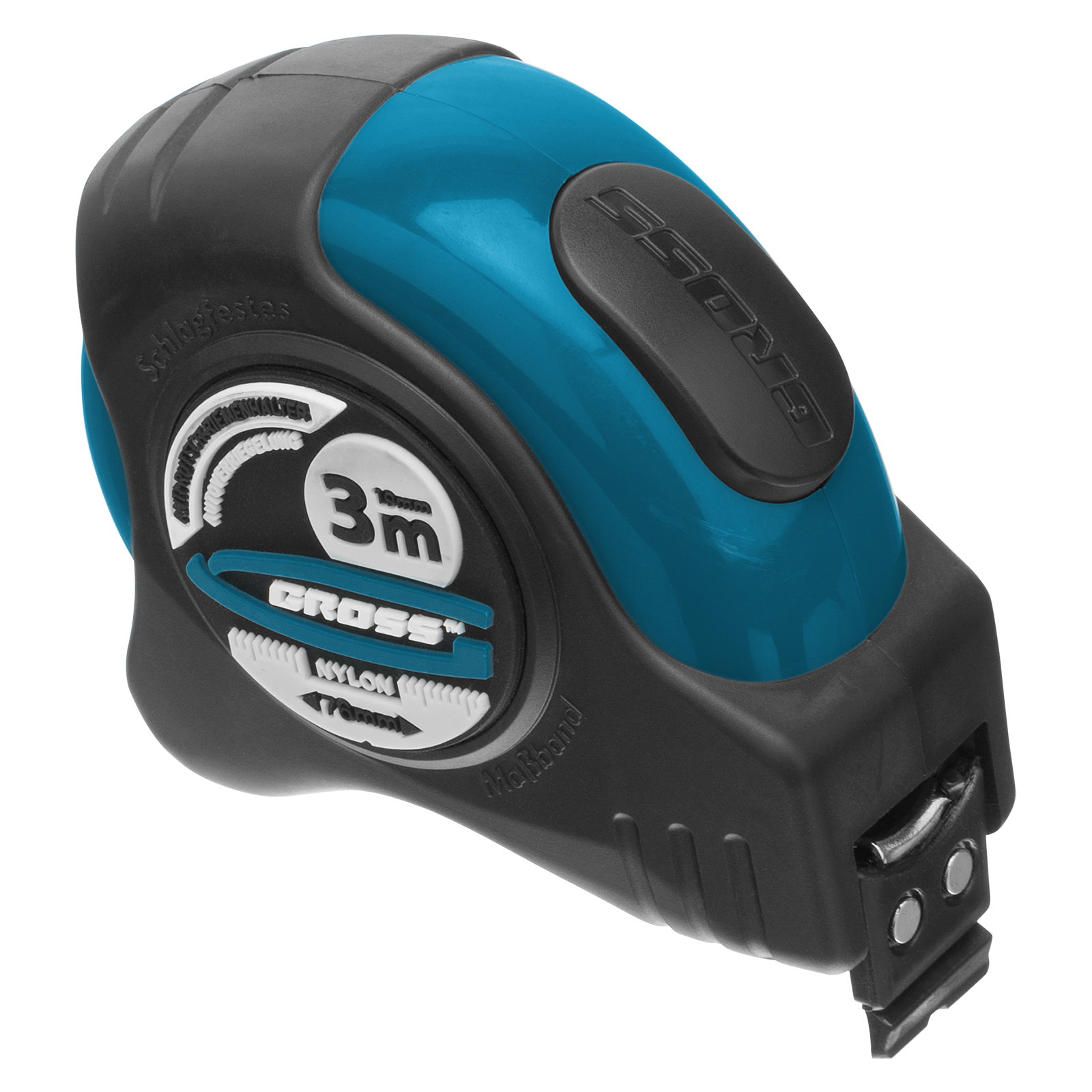 Рулетка Gross «Schlagfest» 31111 с магнитным обрезиненным зацепом, двухсторонней шкалой и функцией автоматической фиксации полотна, 3 м х 19 мм, позволяет определять размеры материалов, вычислять площадь помещения и проводить другие измерительные работы Карманная рулетка — незаменимый инструмент в хозяйстве и на строительной площадке. Магнитный обрезиненный зацеп обеспечивает возможность захвата скользких и металлических поверхностей со сложной формой.ПреимуществаУдобство работы — измерительная шкала нанесена на ленту с обеих сторон.Автоматический фиксатор и дополнительная кнопка паузы — ленту легко удерживать на нужной длине.Ширина полотна 19 мм — замеры можно производить в труднодоступных местах.Высокая точность замеров от нуля — рулетка оснащена подвижным зацепом.Двухкомпонентный корпус — рулетка из ударопрочного ABS-пластика с обрезиненным покрытием выдерживает падения с небольшой высоты и не проскальзывает в руках.Защита полотна от истирания — на стальной ленте имеется нейлоновое покрытие.