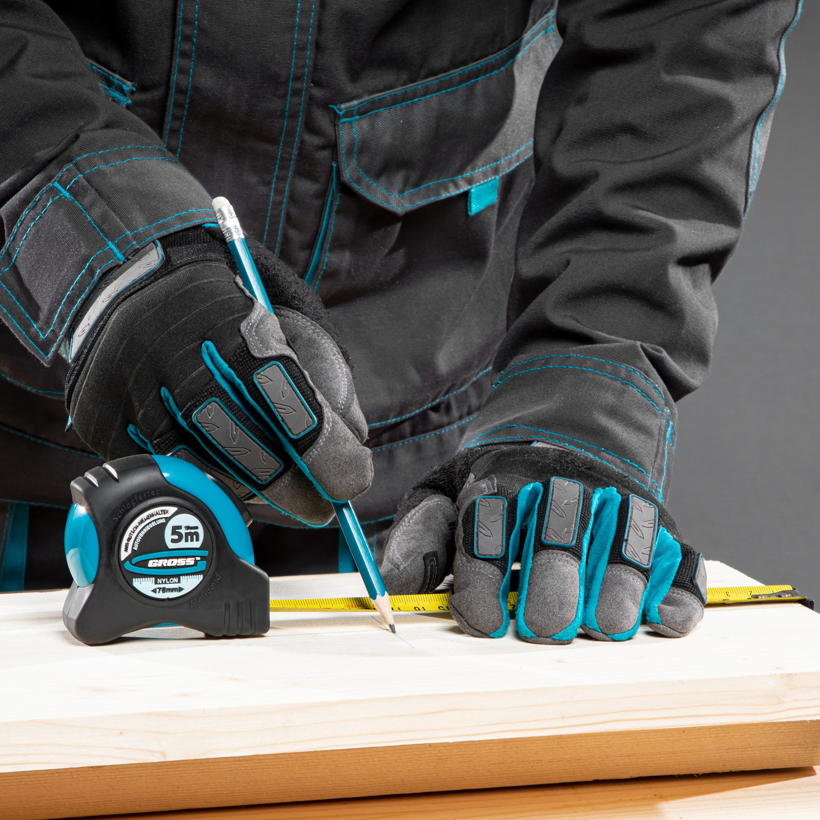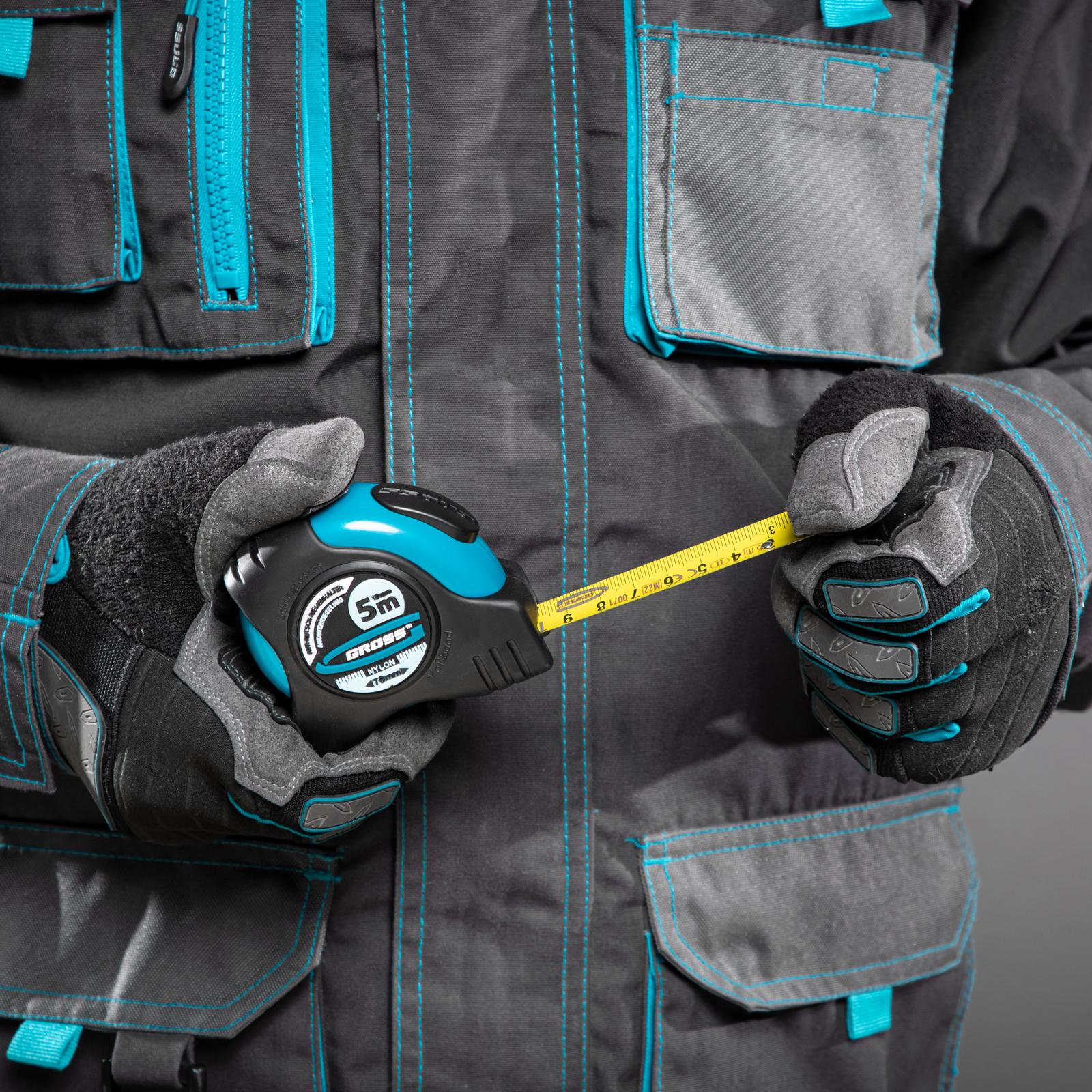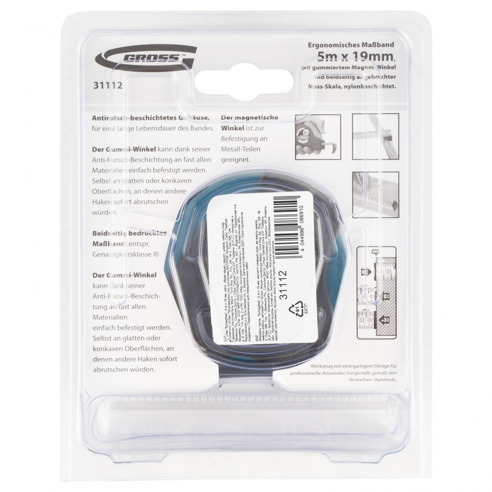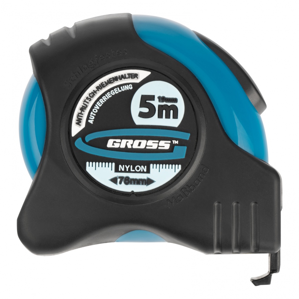 Рулетка Gross «Schlagfest» 31112 с магнитным обрезиненным зацепом, двухсторонней шкалой и функцией автоматической фиксации полотна, 5 м х 19 мм, позволяет определять размеры материалов, вычислять площадь помещения и проводить другие измерительные работы Карманная рулетка — незаменимый инструмент в хозяйстве и на строительной площадке. Магнитный обрезиненный зацеп обеспечивает возможность захвата скользких и металлических поверхностей со сложной формой.ПреимуществаУдобство работы — измерительная шкала нанесена на ленту с обеих сторон.Автоматический фиксатор и дополнительная кнопка паузы — ленту легко удерживать на нужной длине.Ширина полотна 19 мм — замеры можно производить в труднодоступных местах.Высокая точность замеров от нуля — рулетка оснащена подвижным зацепом.Двухкомпонентный корпус — рулетка из ударопрочного ABS-пластика с обрезиненным покрытием выдерживает падения с небольшой высоты и не проскальзывает в руках.Защита полотна от истирания — на стальной ленте имеется нейлоновое покрытие.