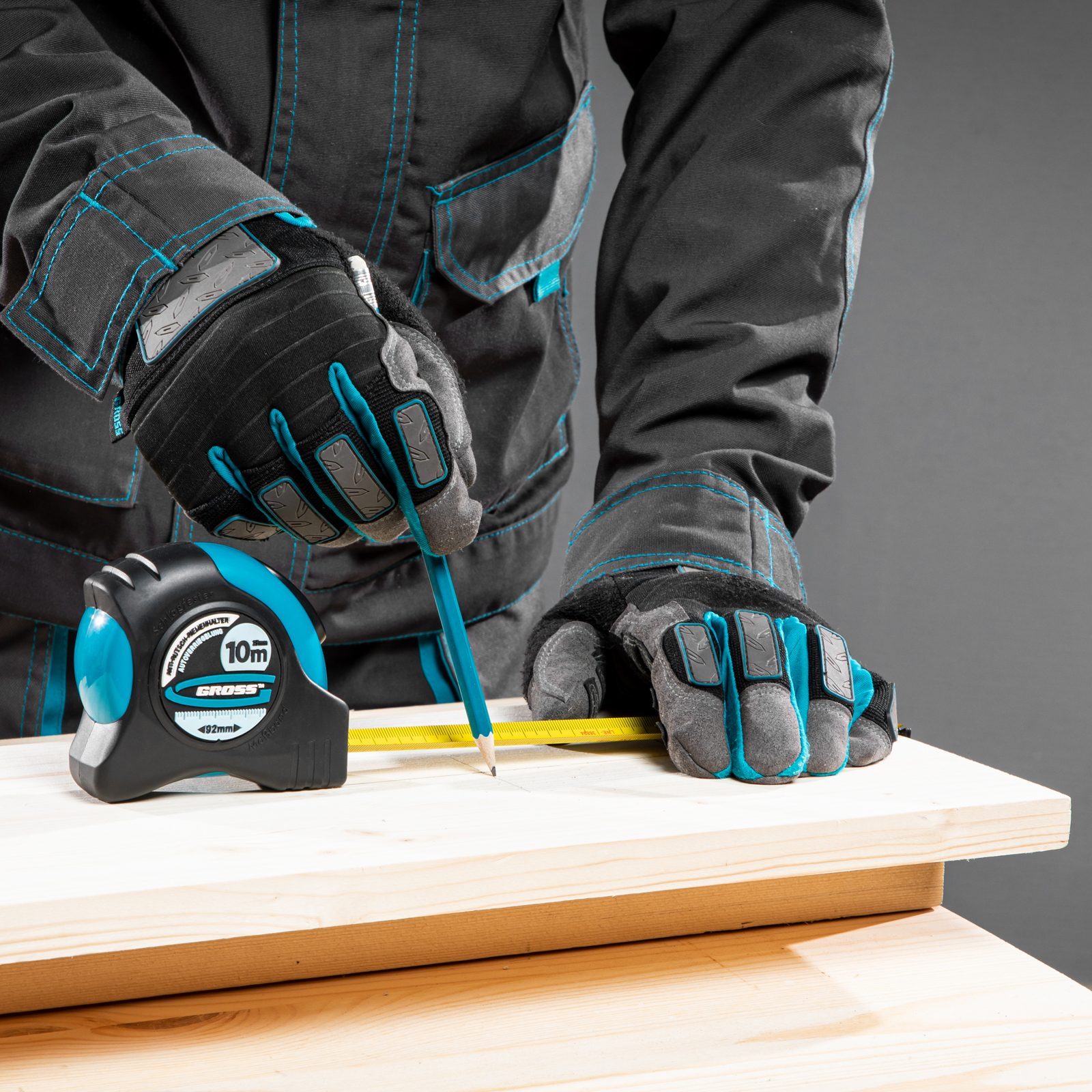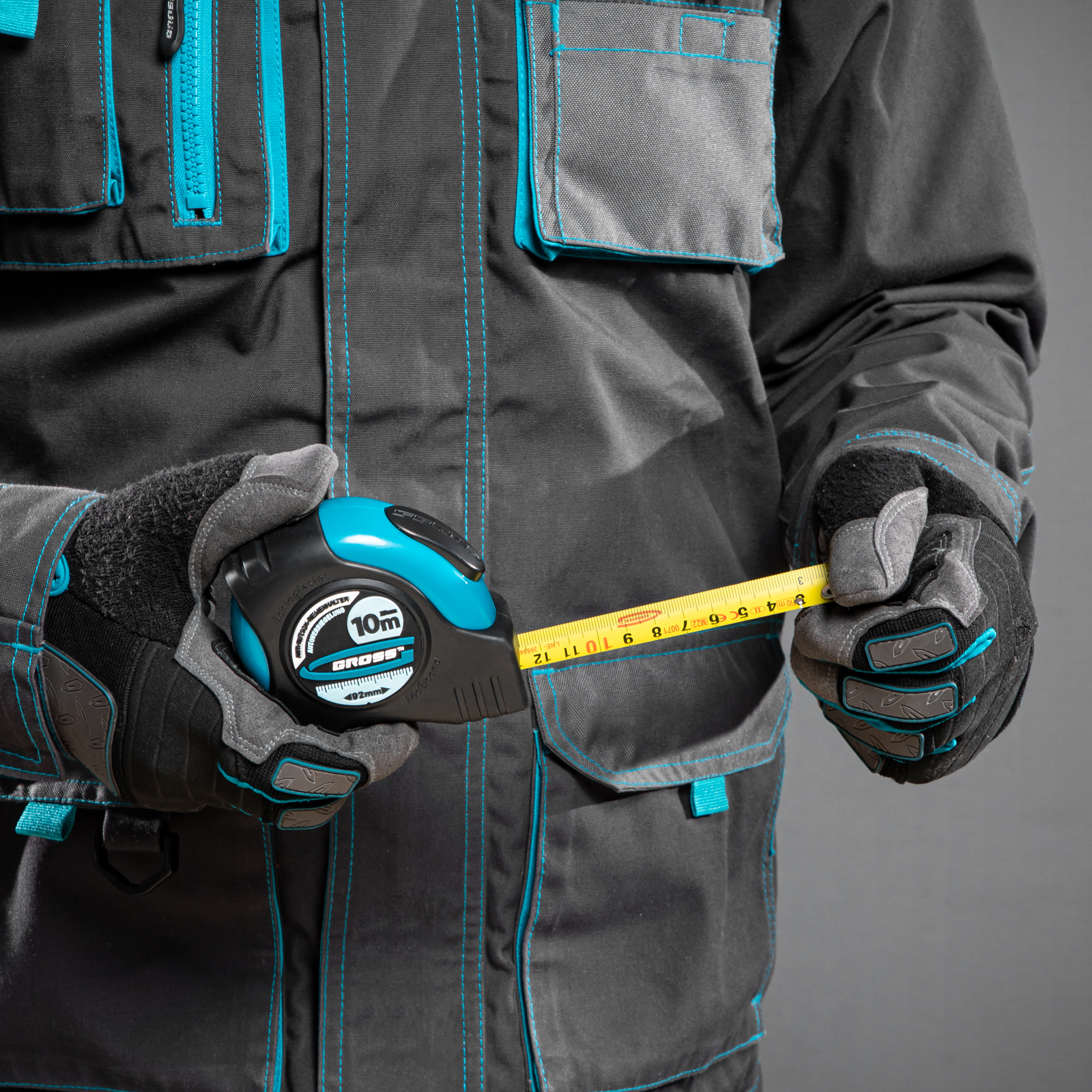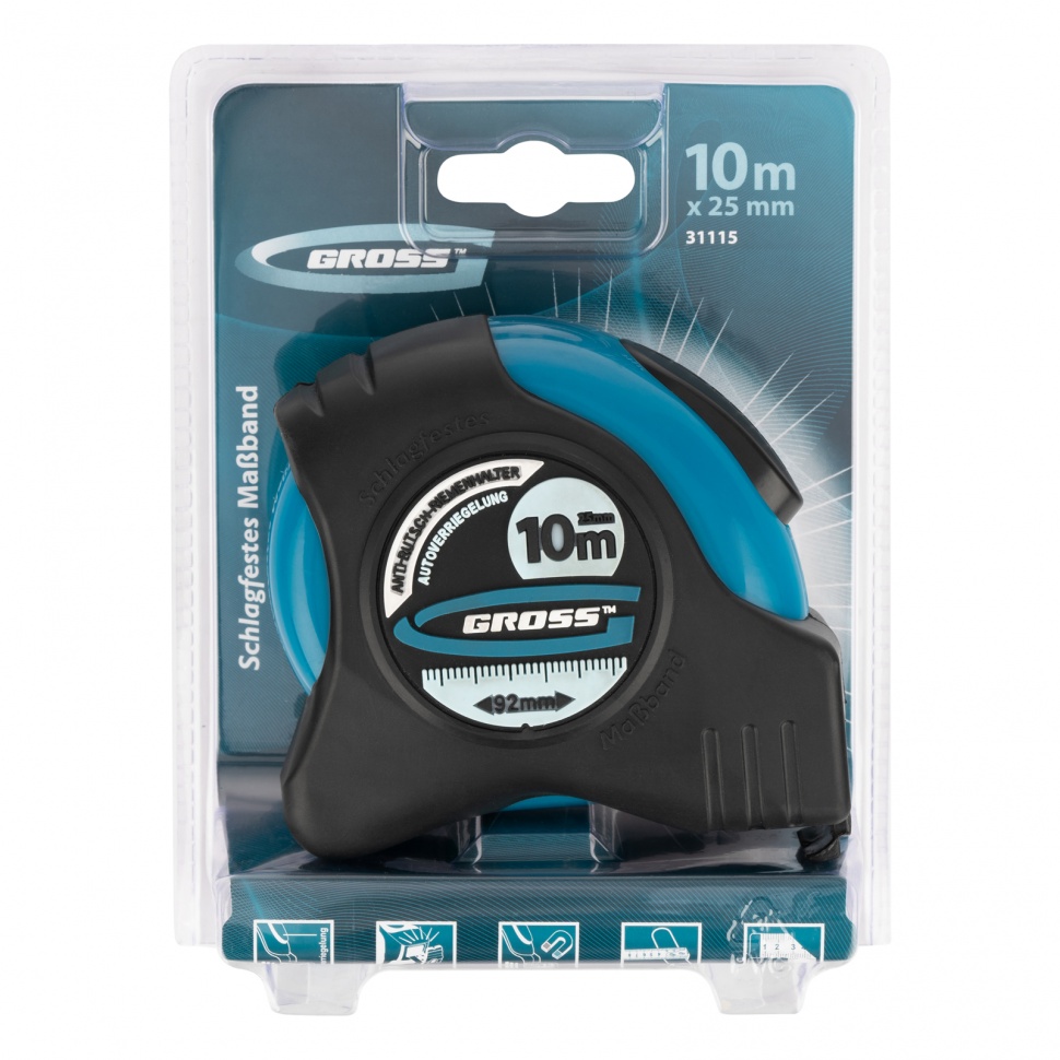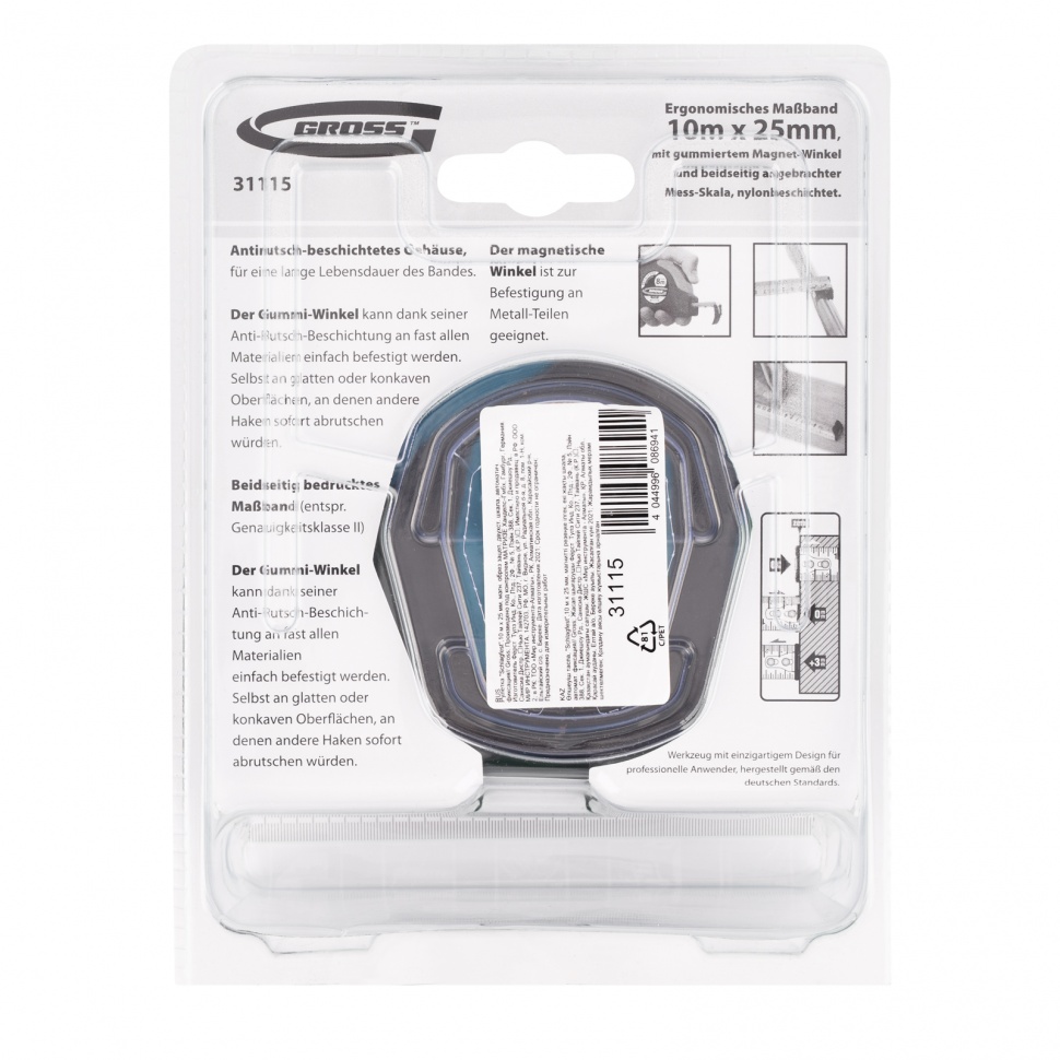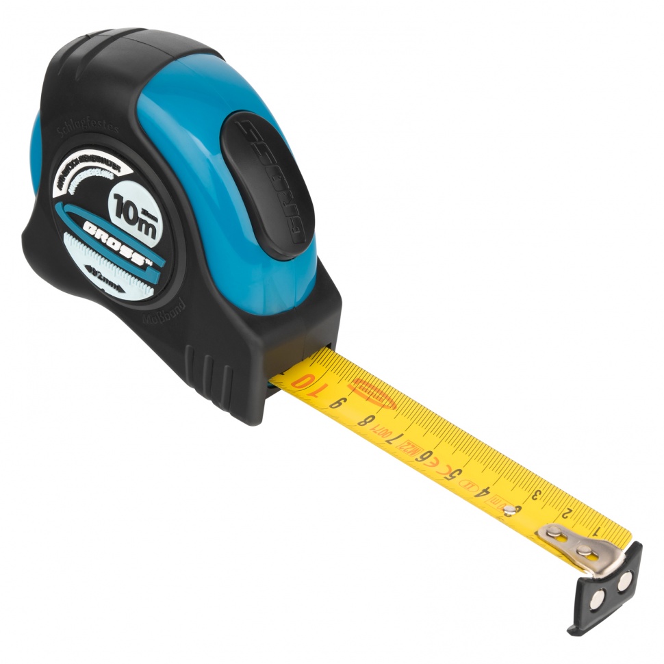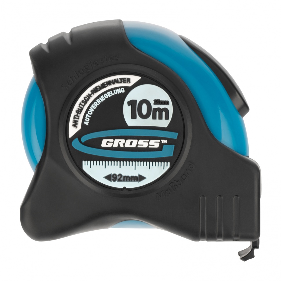 Рулетка Gross «Schlagfest» 31115 с магнитным обрезиненным зацепом, двухсторонней шкалой и функцией автоматической фиксации полотна, 10 м х 25 мм, позволяет определять размеры материалов, вычислять площадь помещения и проводить другие измерительные работы Карманная рулетка — незаменимый инструмент в хозяйстве и на строительной площадке. Магнитный обрезиненный зацеп обеспечивает возможность захвата скользких и металлических поверхностей со сложной формой.ПреимуществаУдобство работы — измерительная шкала нанесена на ленту с обеих сторон.Автоматический фиксатор и дополнительная кнопка паузы — ленту легко удерживать на нужной длине.Высокая точность замеров от нуля — рулетка оснащена подвижным зацепом.Двухкомпонентный корпус — рулетка из ударопрочного ABS-пластика с обрезиненным покрытием выдерживает падения с небольшой высоты и не проскальзывает в руках.Защита полотна от истирания — на стальной ленте имеется нейлоновое покрытие.
