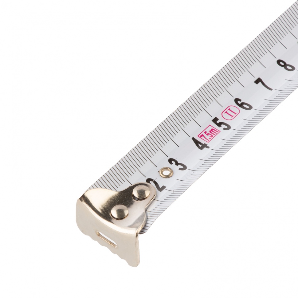 Рулетка Matrix Strong 31082 с измерительной лентой длиной 7,5 м и шириной 25 мм, в обрезиненном корпусе, предназначена для определения размеров и расстояний. Частично обрезиненный корпус из ударопрочного ABS-пластика устойчив к повреждениям, что уменьшает риск его поломки в случае падения или удара. Стальная лента с зацепом, прикрепленным заклепками, рассчитана на длительное использование. Рулетка пригодится на строительной площадке, во время ремонта, а также дома или на даче.ПреимуществаТочные результаты измерений — благодаря подвижному зацепу можно не учитывать погрешность в виде толщины самого зацепа.Удобное использование — кнопка-фиксатор удерживает ленту в вытянутом положении.Комфортная транспортировка — нейлоновый ремешок позволяет подвешивать рулетку на запястье, при помощи металлической клипсы-зажима ее можно зафиксировать на поясе.