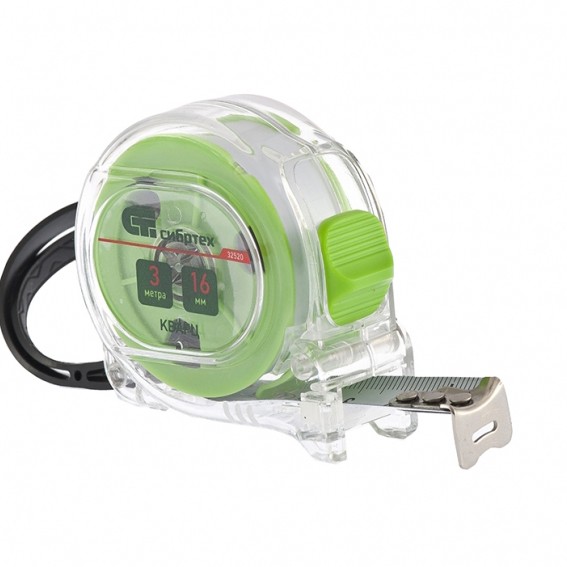 Рулетка Сибртех Кварц 32520 с полотном размером 3 м х 16 мм, в прозрачном корпусе, с амортизатором, будет полезна для измерения длины конструкций, строительных материалов и т.д. Пригодится на строительной площадке, в гараже, мастерской и в быту.ПреимуществаДолговечность и надежность — корпус из поликарбоната с амортизатором защищен от внешних воздействий и не разрушается при быстром возврате ленты.Работа в труднодоступных местах — ширина полотна составляет 16 мм.Подвижной зацеп True-zero — толщина зацепа компенсируется для повышения точности измерений.Удобная упаковка — рулетка поставляется в картонной подвесной карте.Безопасная эксплуатация — рулетку можно подвесить за ремешок на запястье для предотвращения ее падения во время работы.