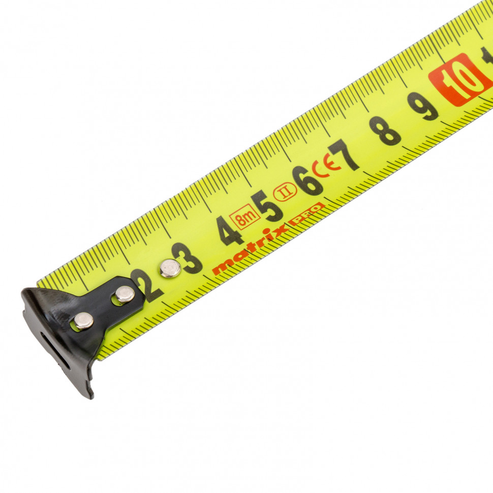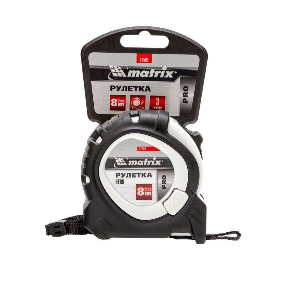 Рулетка Matrix PRO Neon 32593, 8 м х 25 мм, в обрезиненном корпусе, с 3 механизмами фиксации, служит для определения расстояний и размеров различных предметов. Крупные цифры на матовом желто-зеленом полотне хорошо видны, что делает процесс измерения комфортным. Полотно шириной 25 мм с увеличенным вылетом облегчает проведение замеров в труднодоступных местах. Измерительное полотно можно зафиксировать на нужной отметке при помощи стопора или одной из двух кнопок-пауз — это удобно при проведении большого количества замеров. Рулетка предназначена для выполнения профессиональных и бытовых измерительных работ.ПреимуществаКорпус рулетки устойчив к случайным повреждениям, поскольку изготовлен из ударопрочного пластика и обрезинен.Измерения проводятся от ноля благодаря подвижному зацепу.Рулетку можно повесить на запястье, поскольку у нее имеется удобный ремешок.Инструмент можно укрепить на поясе при помощи металлического зажима на корпусе.